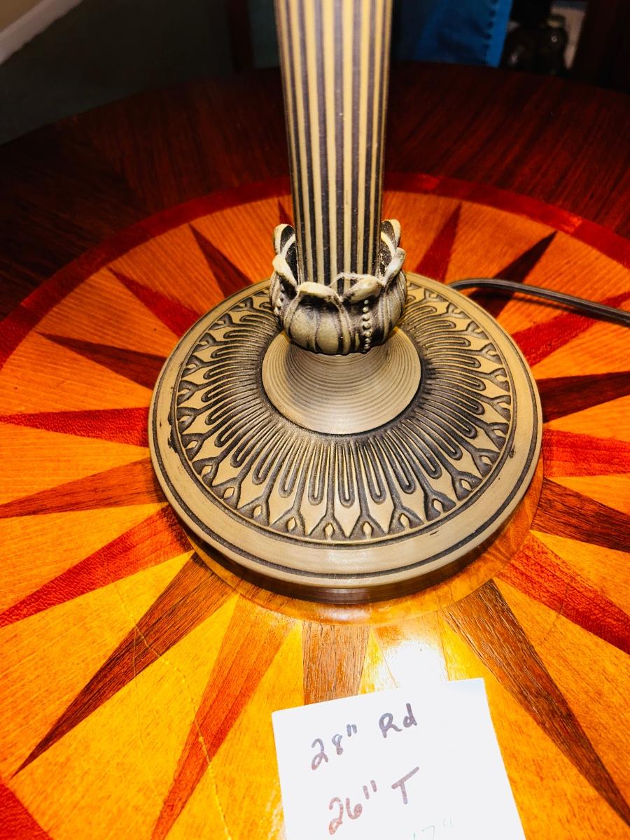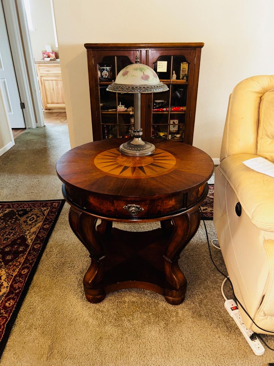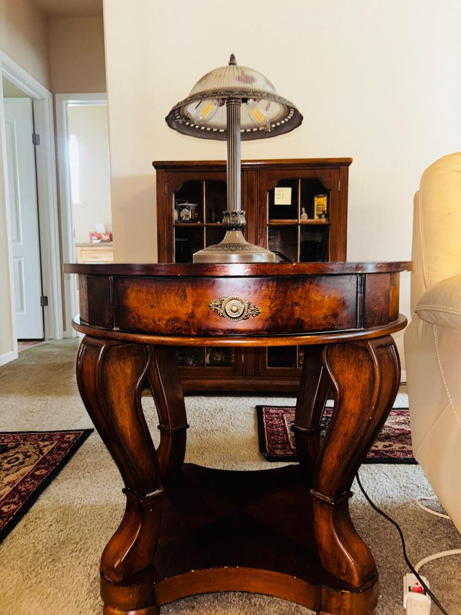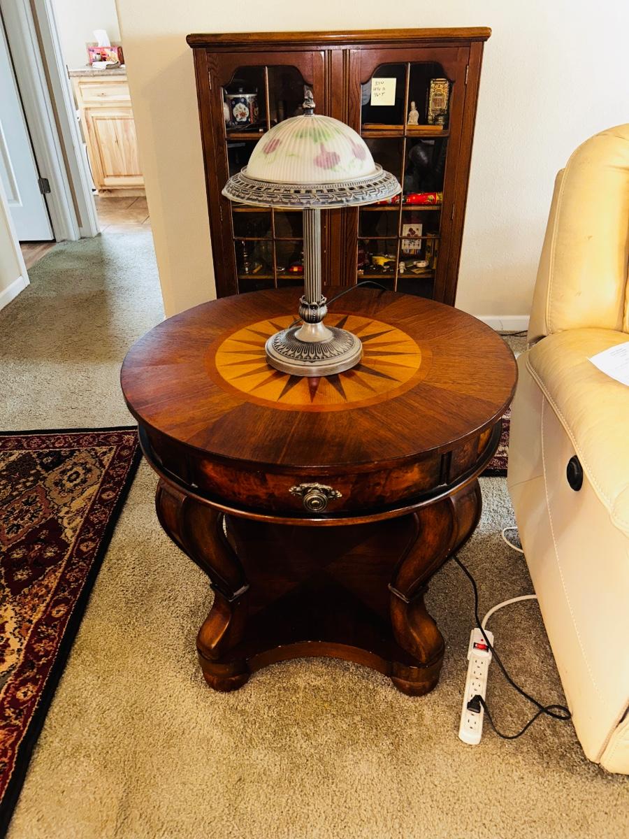 2 TIER INLAID WOOD SIDE TABLE W/DRAWER AND A GLASS SHADE LAMP