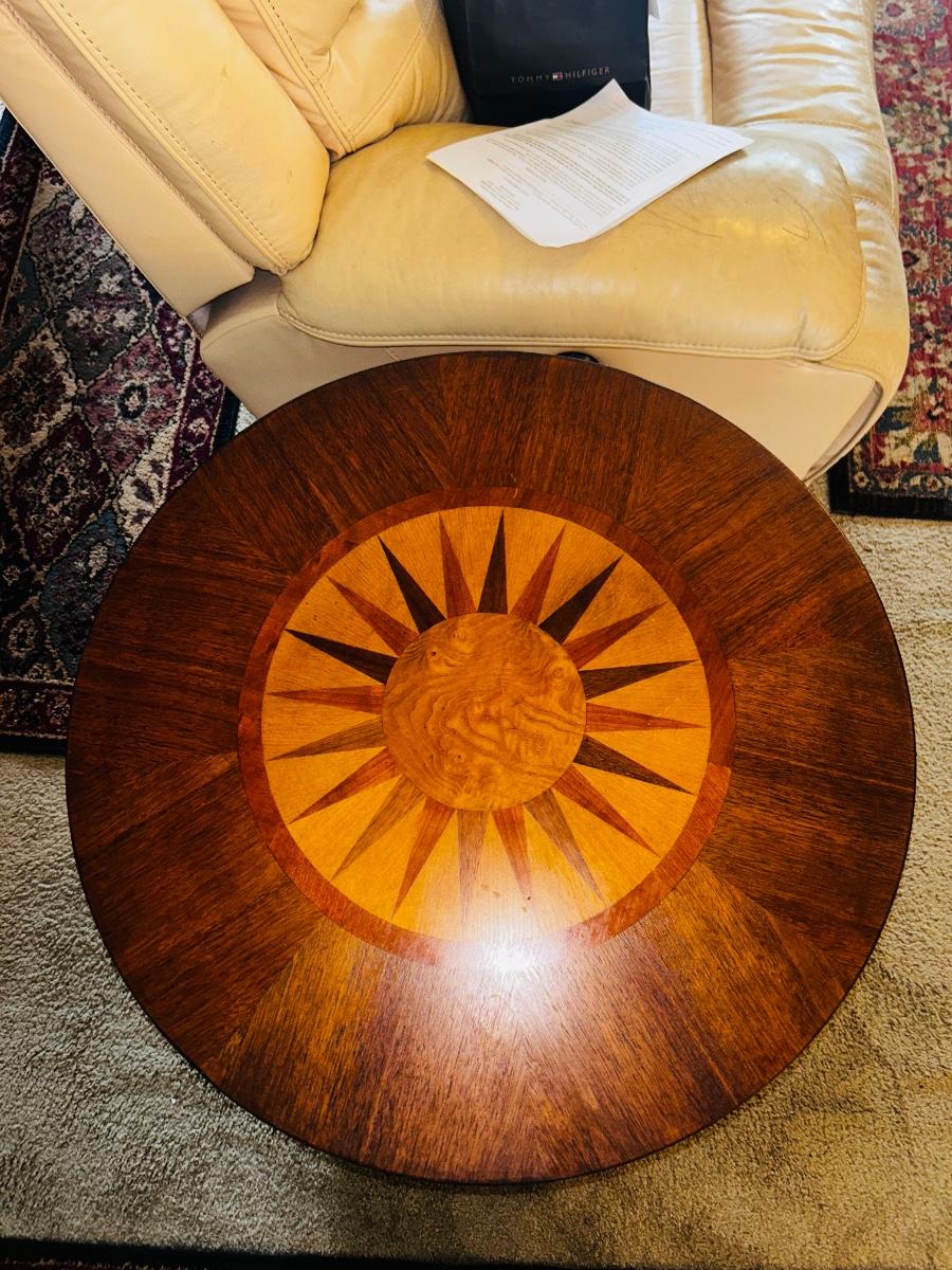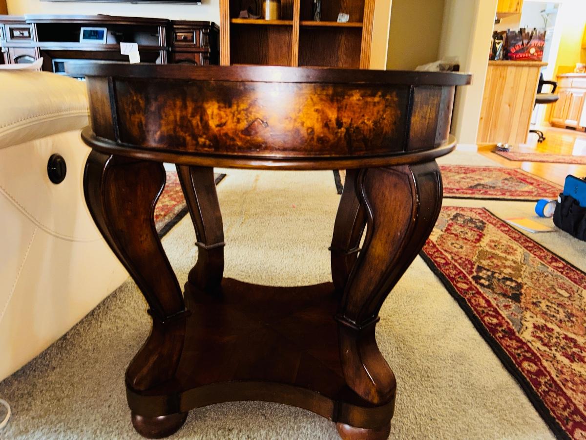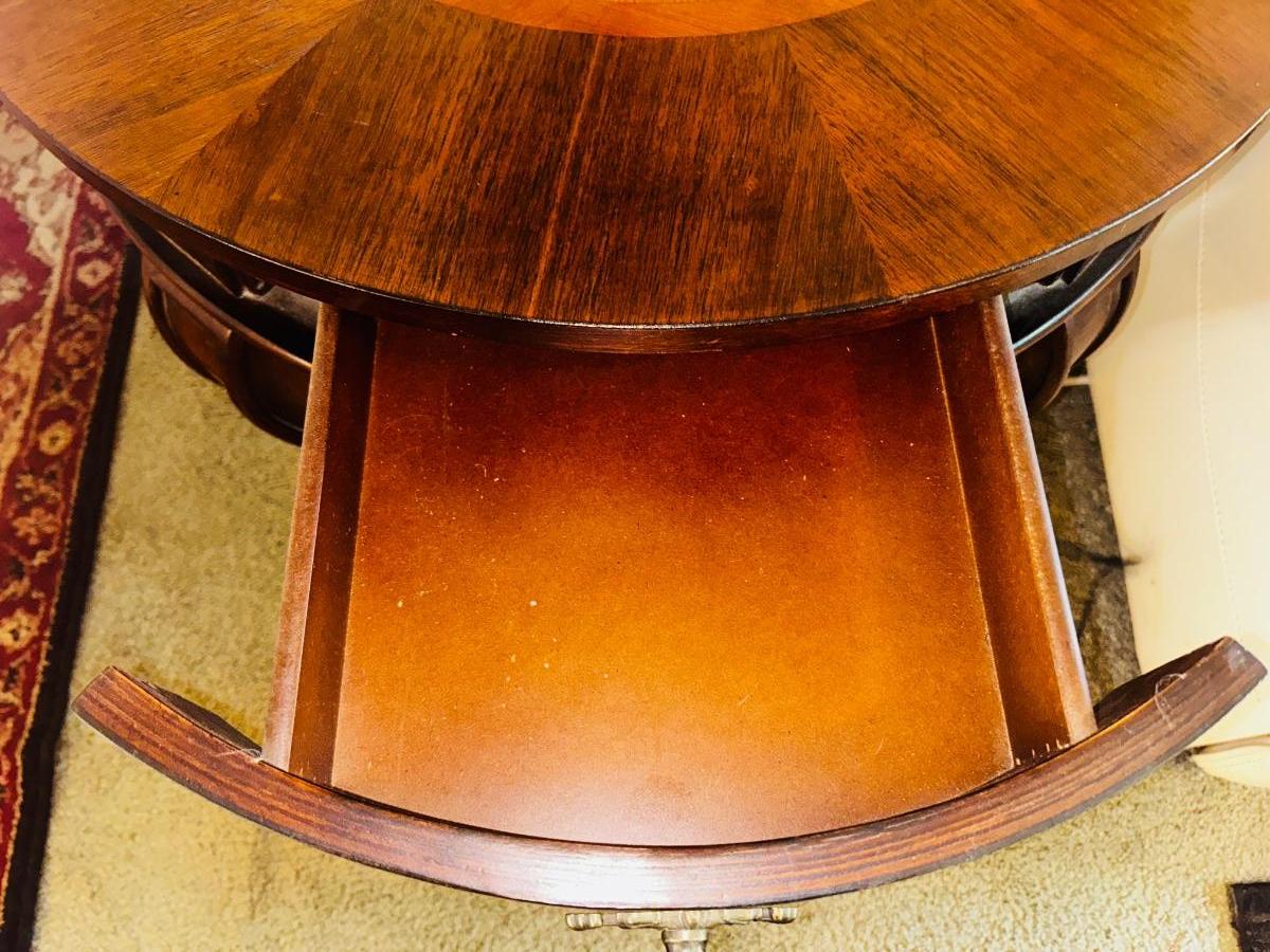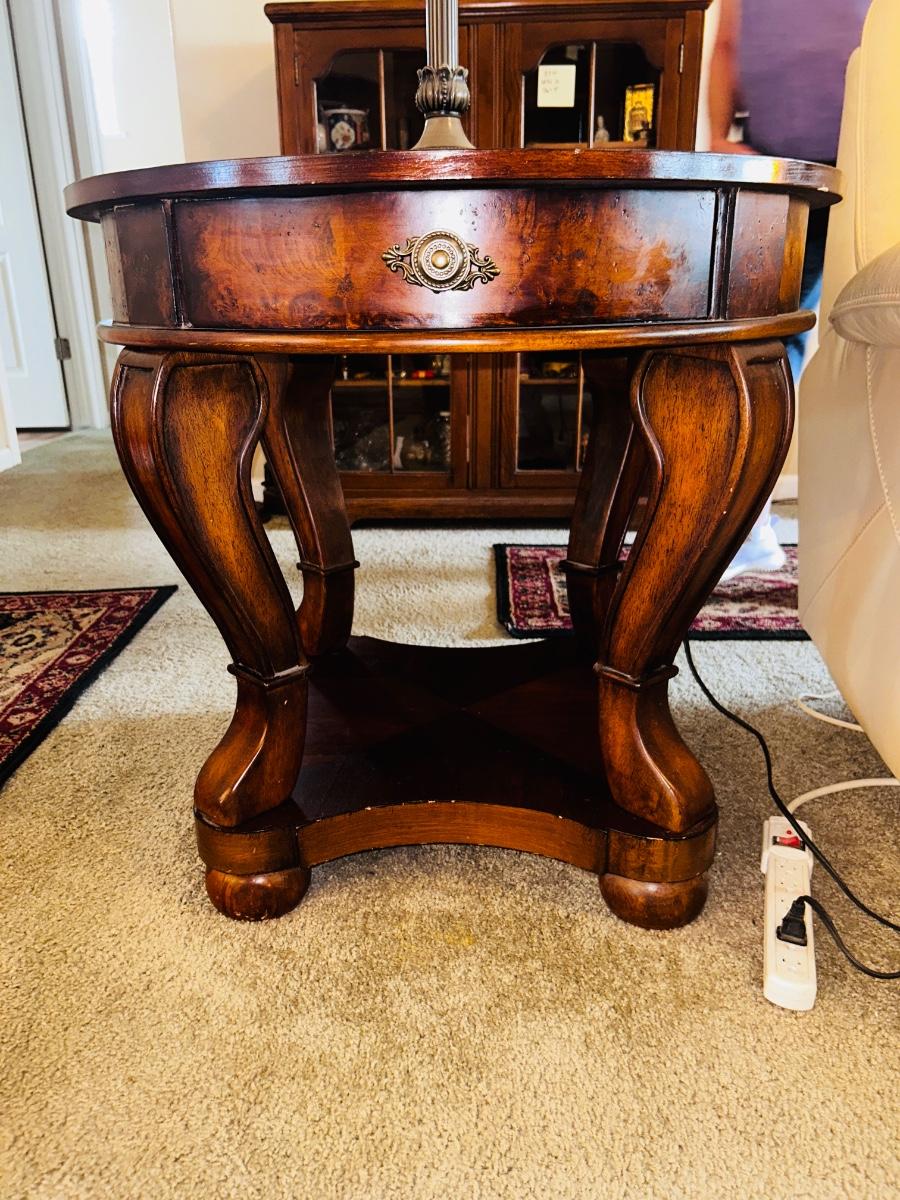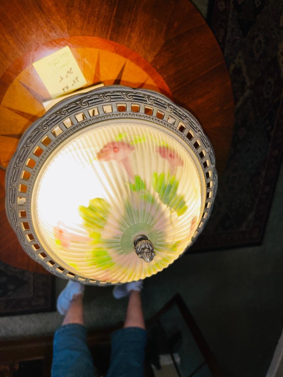2 TIER INLAID WOOD SIDE TABLE W/DRAWER AND A GLASS SHADE LAMP