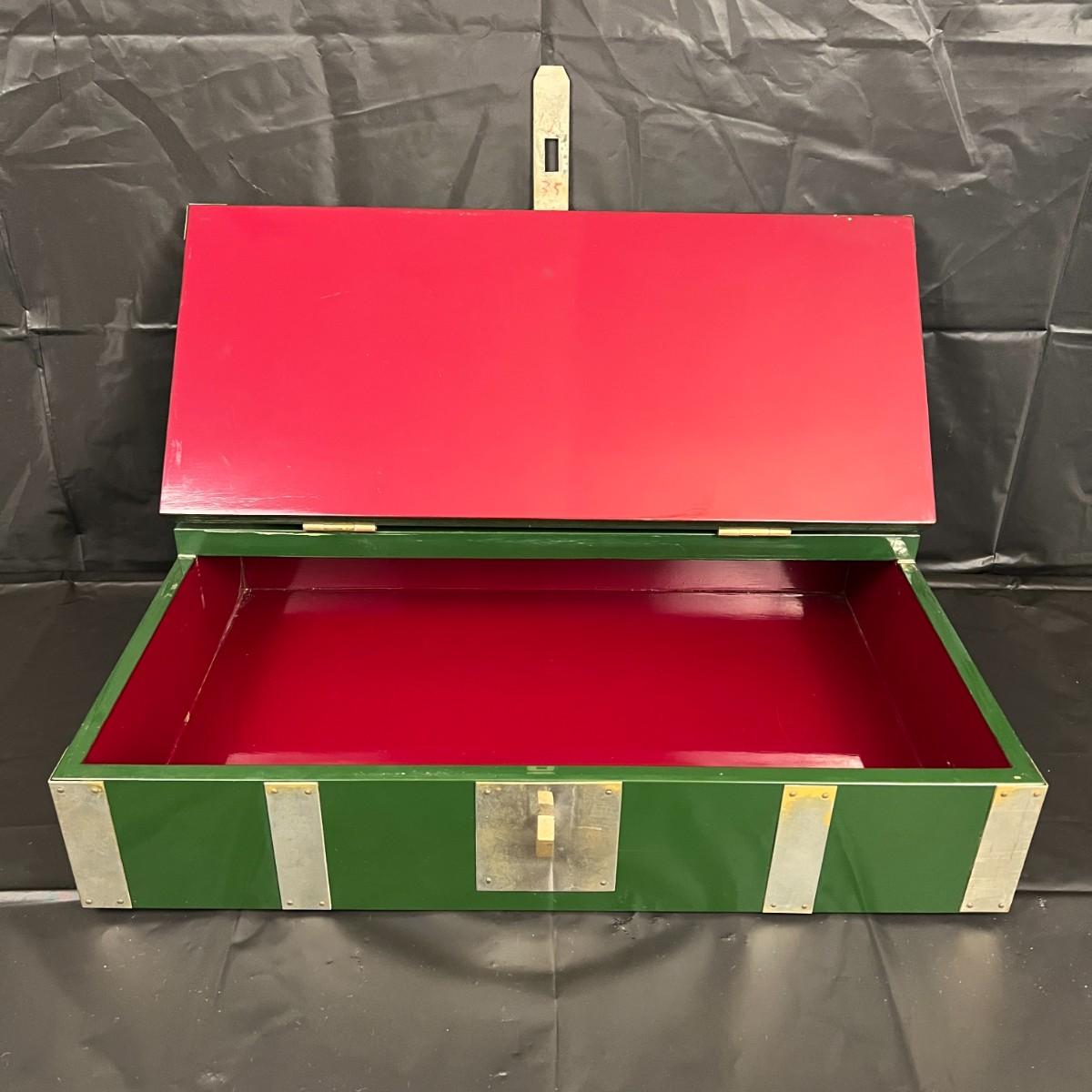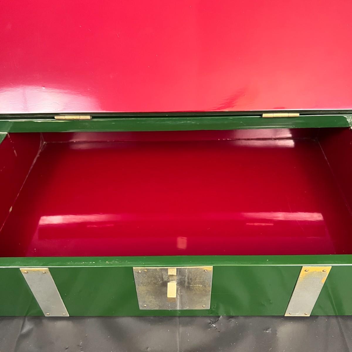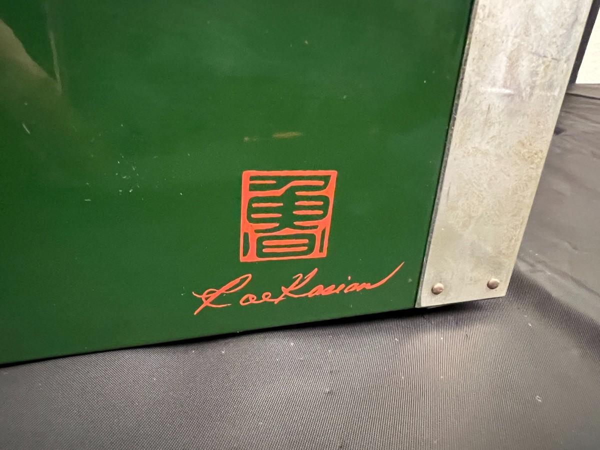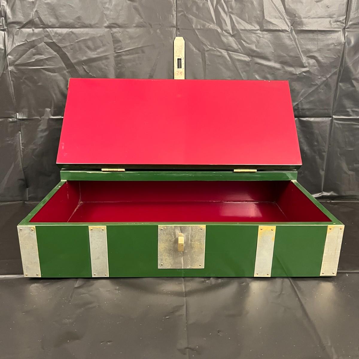 Gorgeous Red and Green Lacquer Wood and Silver-Tone Metal Box Designed by Rae Kasian! A very striking piece, and a rare find. In good condition, with some signs of wear (as shown in photos). This beautiful box was crafted in Korea.