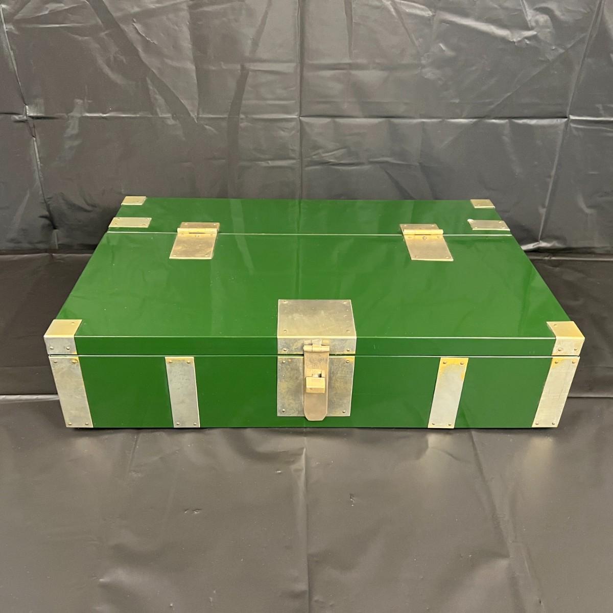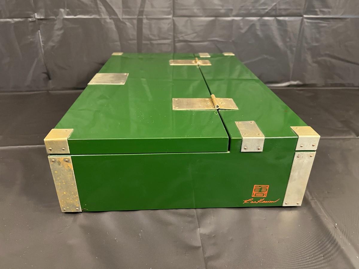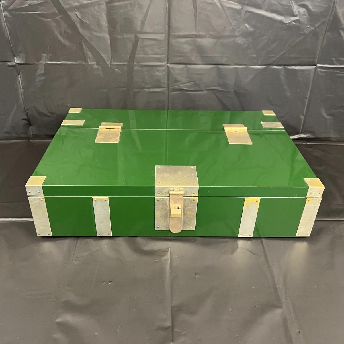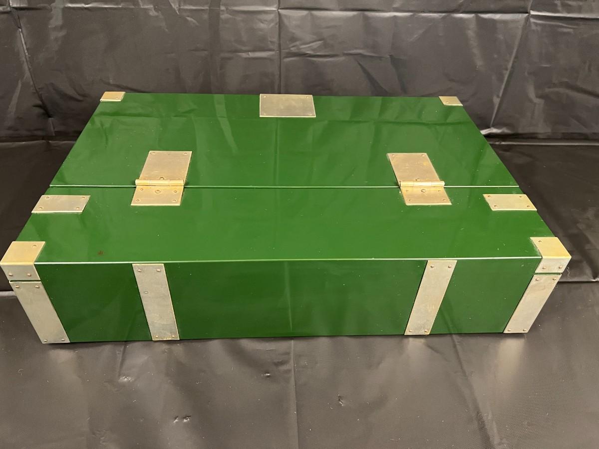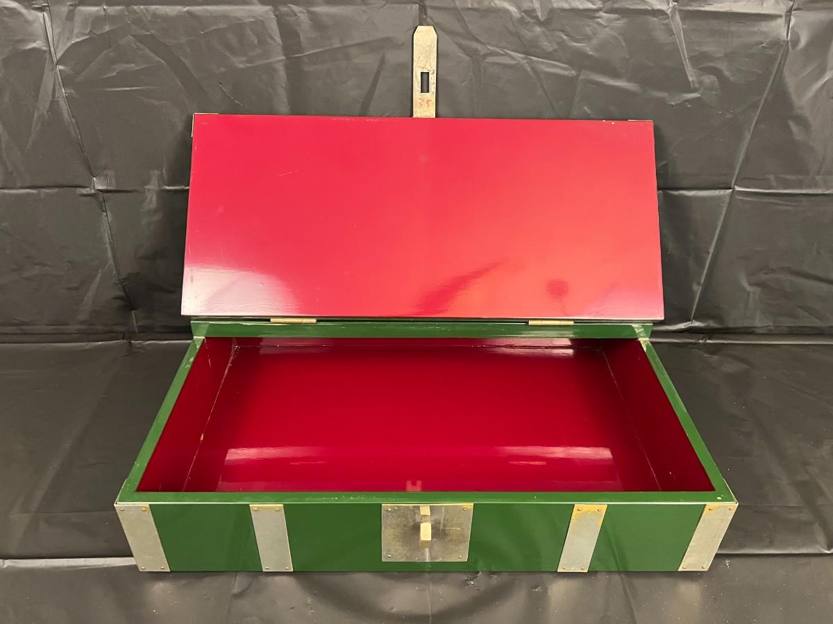 Gorgeous Red and Green Lacquer Wood and Silver-Tone Metal Box Designed by Rae Kasian! A very striking piece, and a rare find. In good condition, with some signs of wear (as shown in photos). This beautiful box was crafted in Korea.