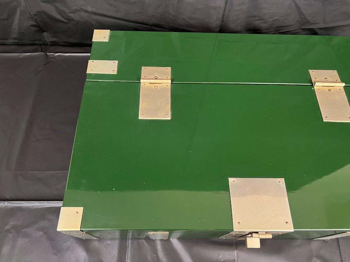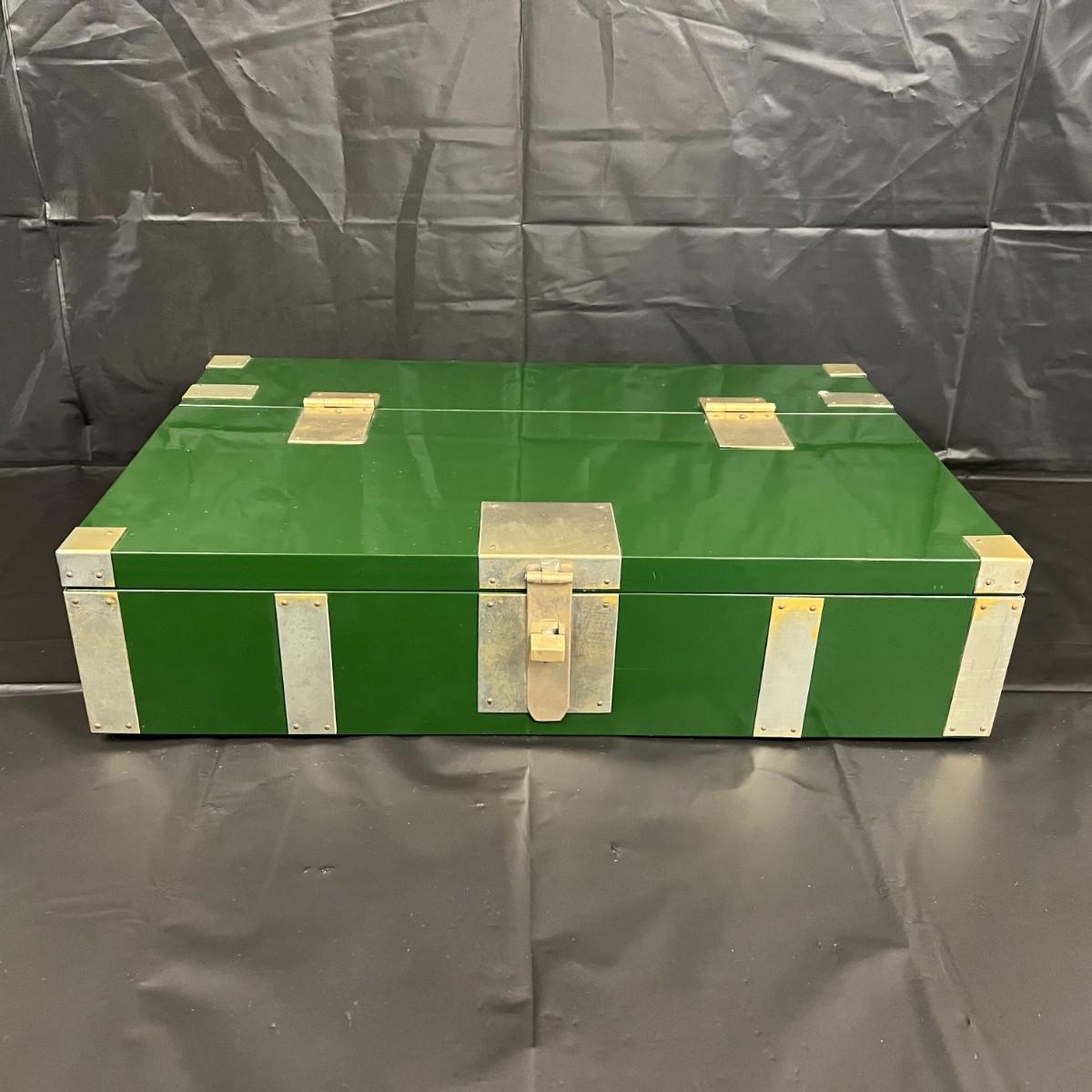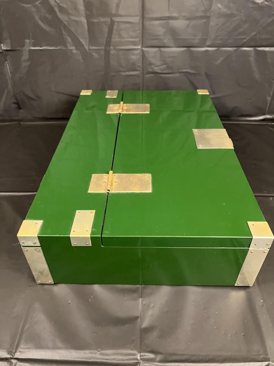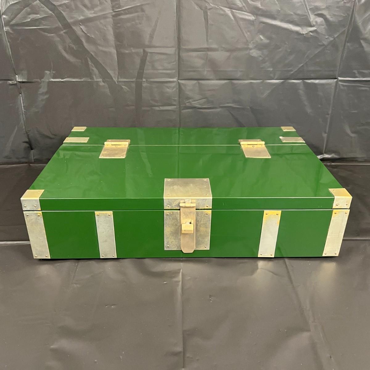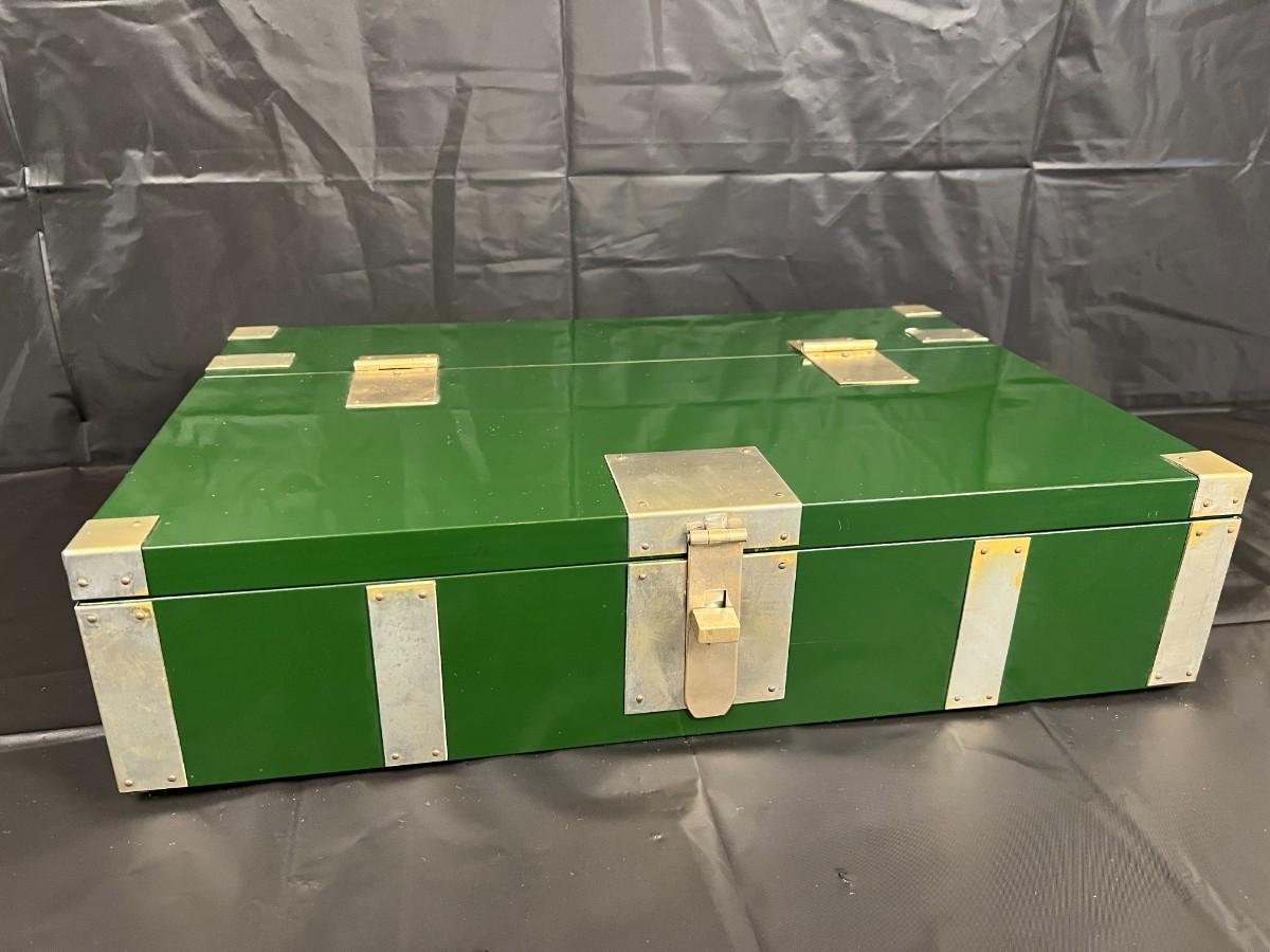 Gorgeous Red and Green Lacquer Wood and Silver-Tone Metal Box Designed by Rae Kasian! A very striking piece, and a rare find. In good condition, with some signs of wear (as shown in photos). This beautiful box was crafted in Korea.