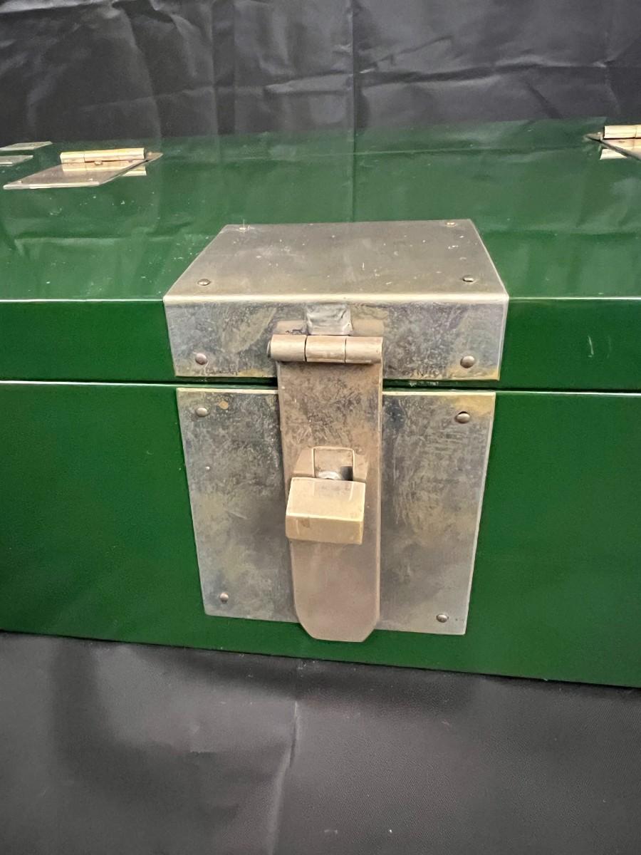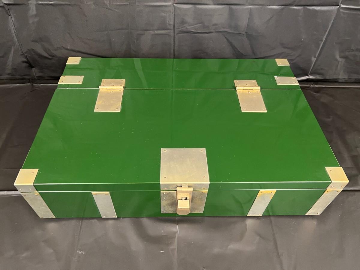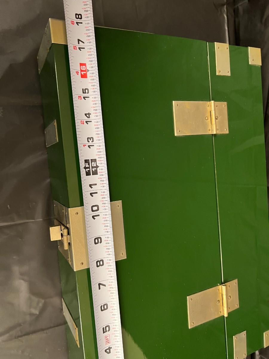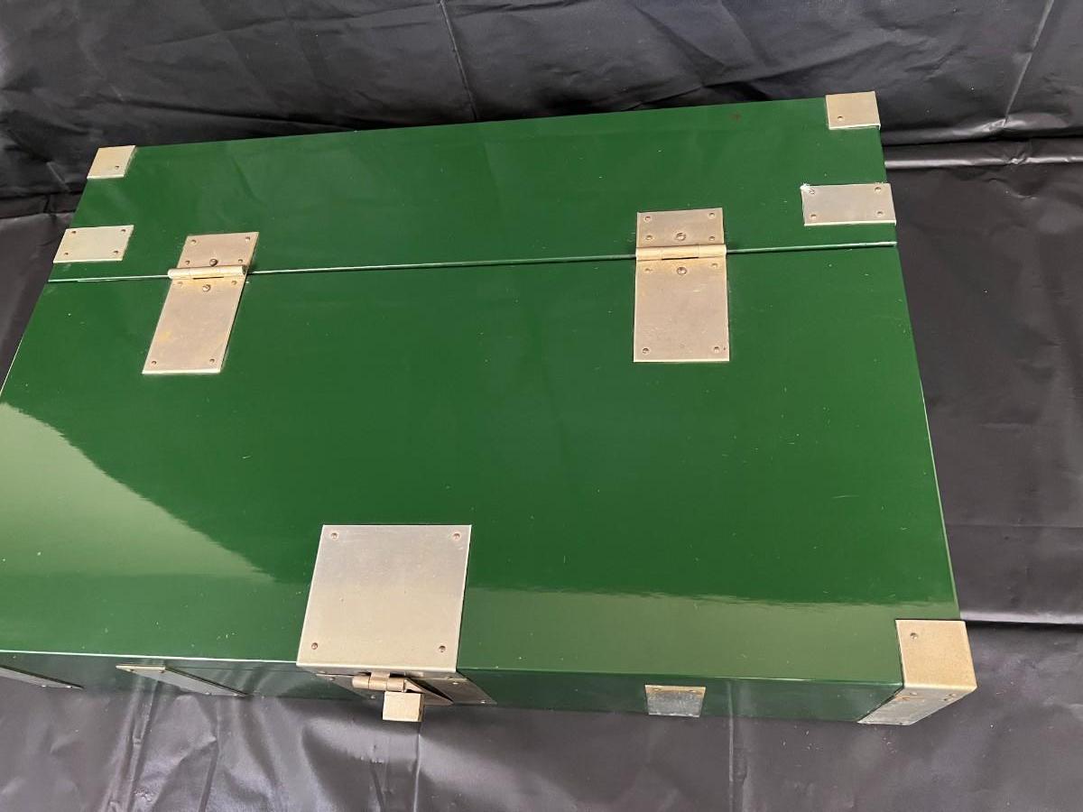 Gorgeous Red and Green Lacquer Wood and Silver-Tone Metal Box Designed by Rae Kasian! A very striking piece, and a rare find. In good condition, with some signs of wear (as shown in photos). This beautiful box was crafted in Korea.
