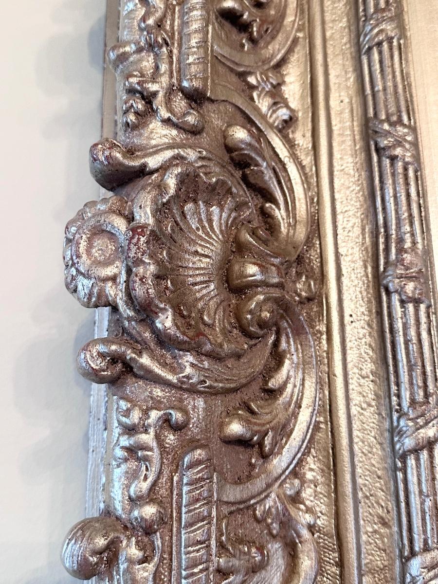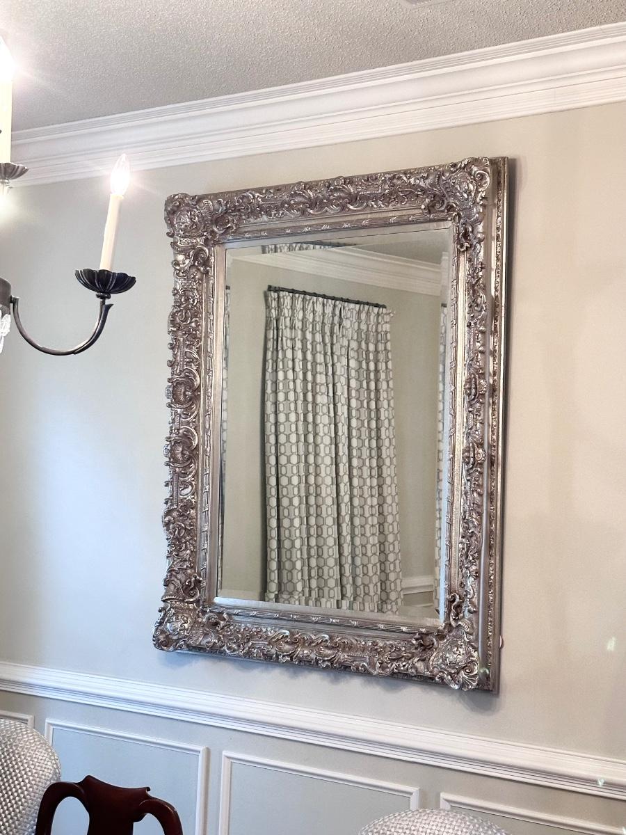 This Mirror WILL NOT disappoint ~ Can be hung vertically or horizontally ~ it appears to be wood however it could be resin. I cannot take it off the wall. Either way it’s beautiful. It has a silvery gold finish with some red undertone peeling through. See photos