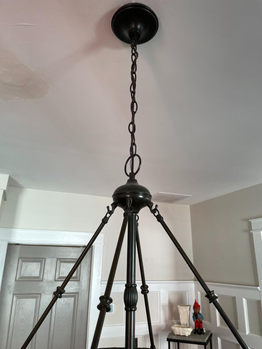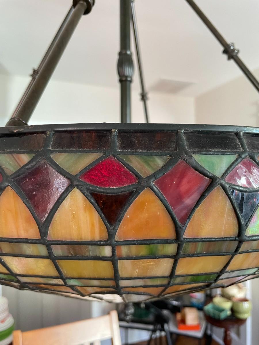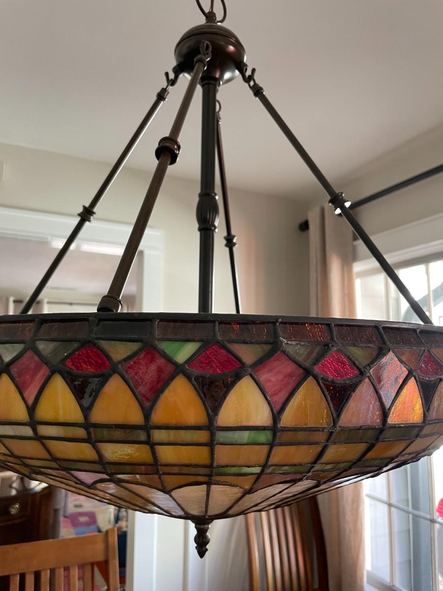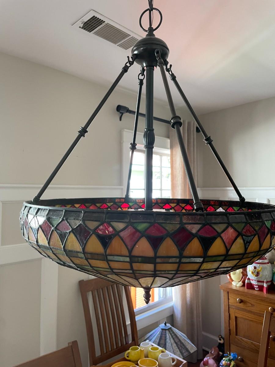 22"w x 46" drop from ceiling, chain can be shortened to adjust drop. Uses 3 standard bulbs.