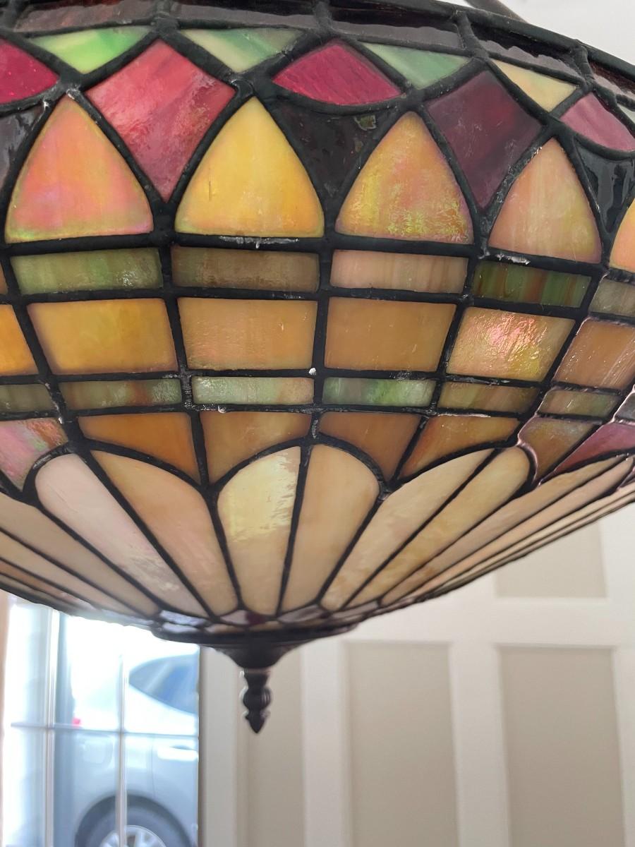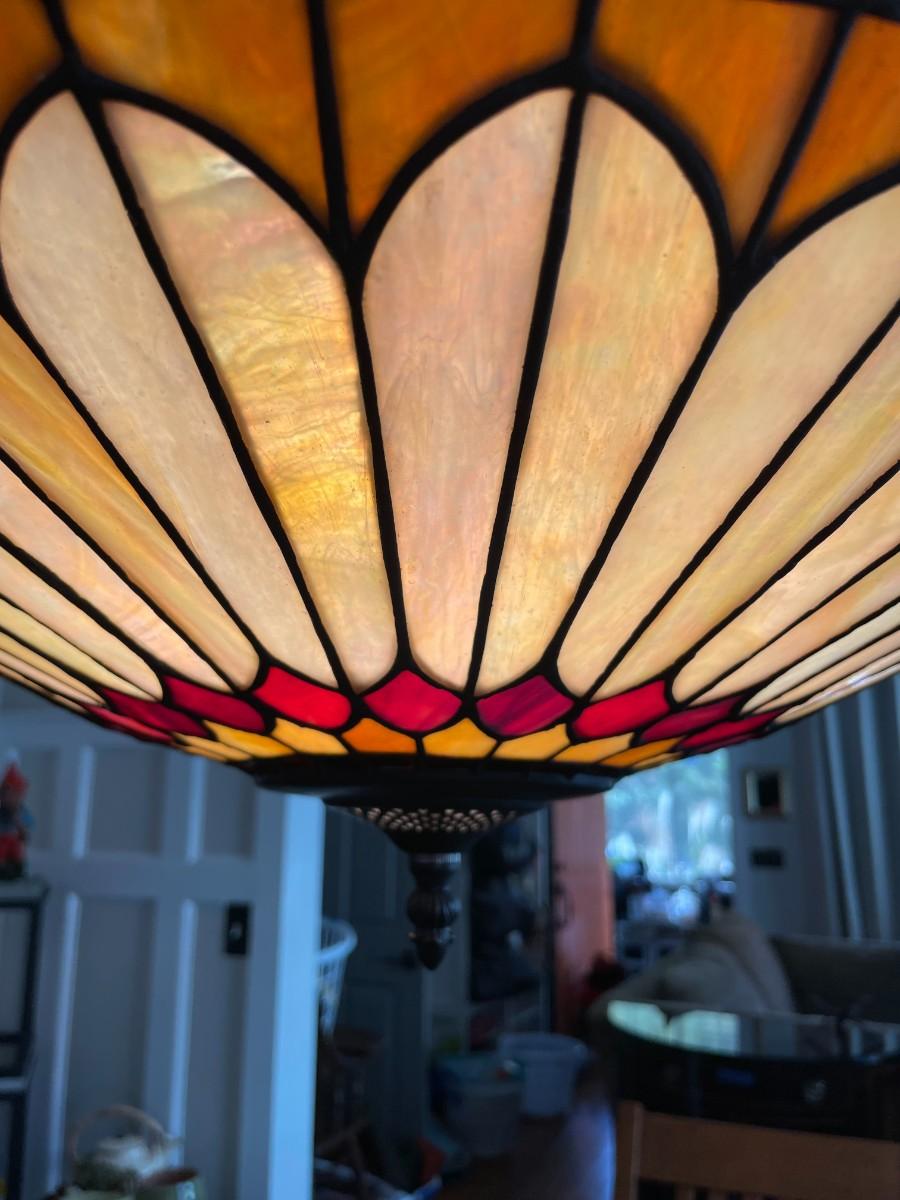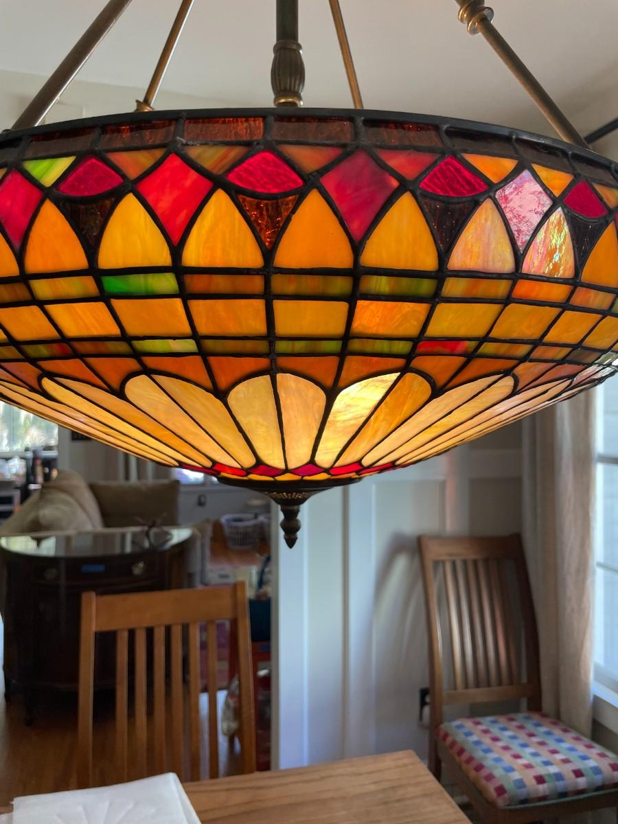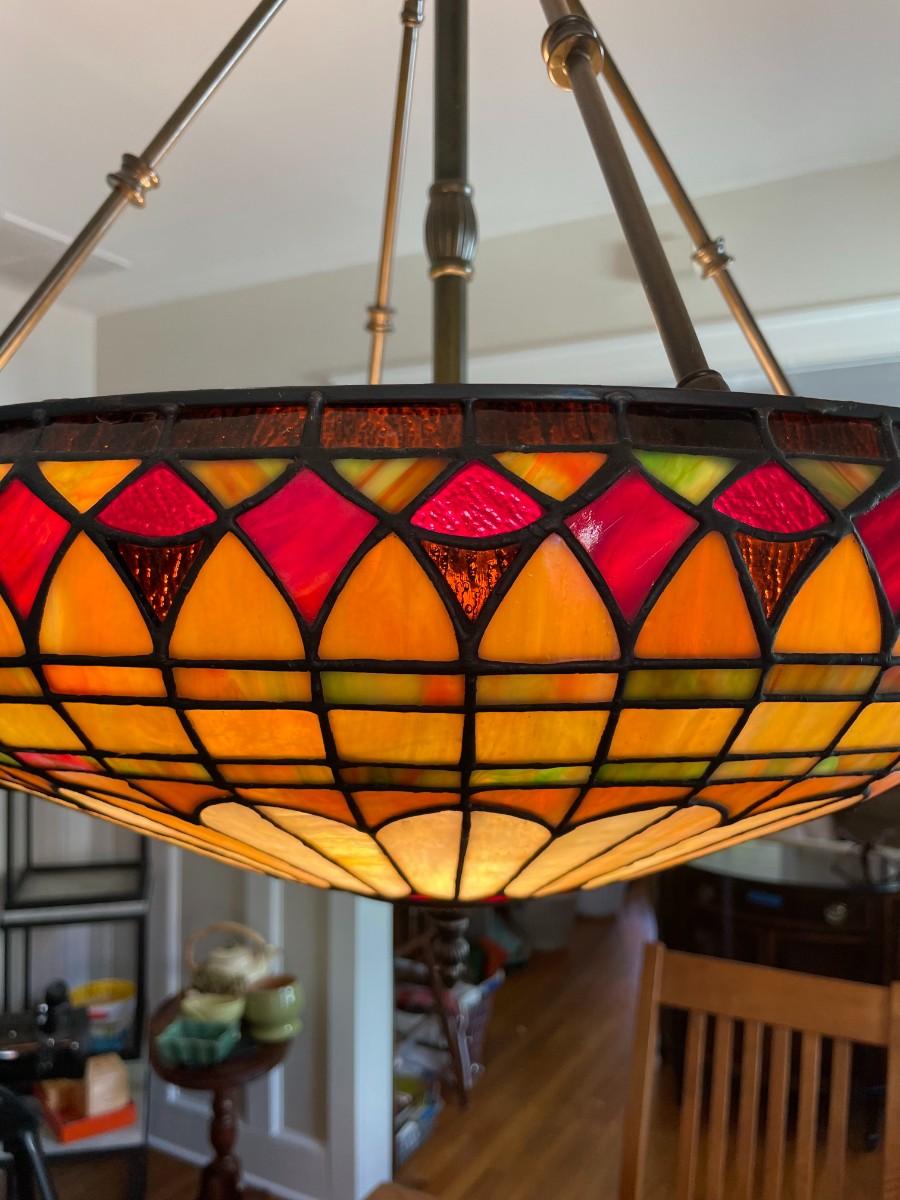 22"w x 46" drop from ceiling, chain can be shortened to adjust drop. Uses 3 standard bulbs.