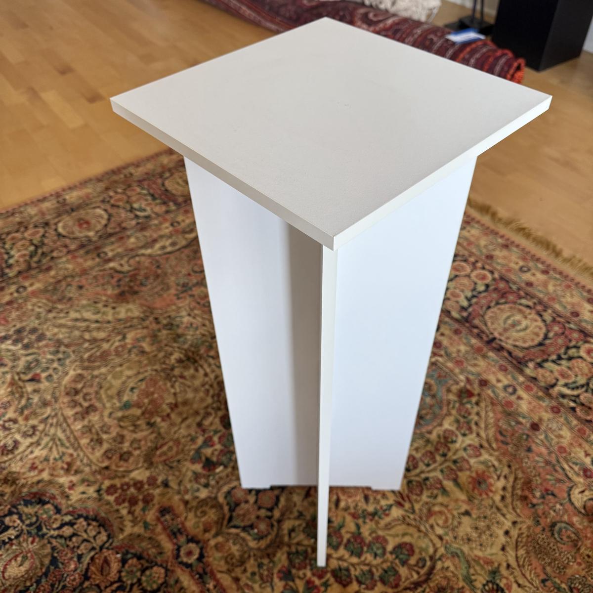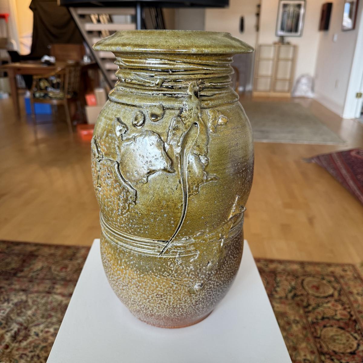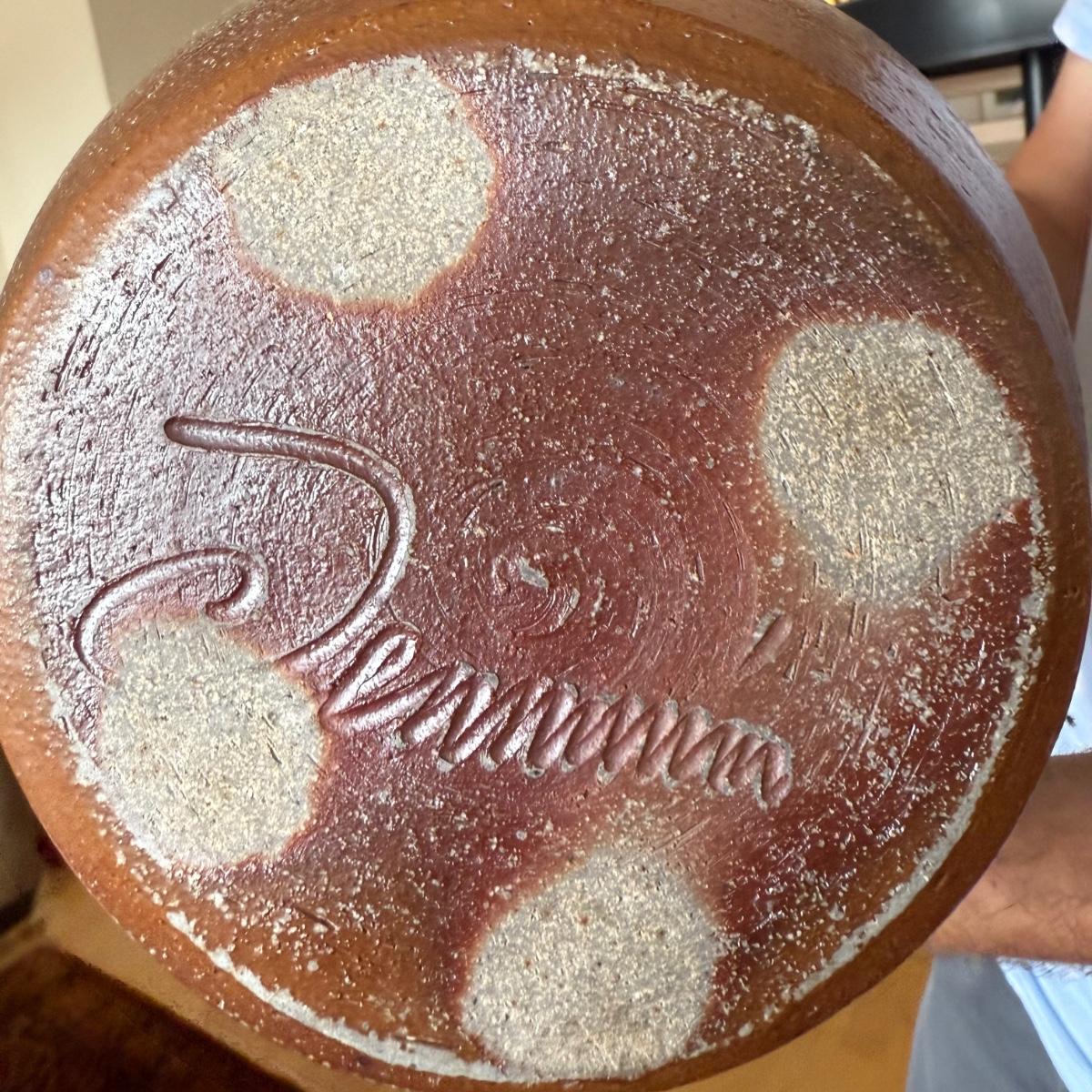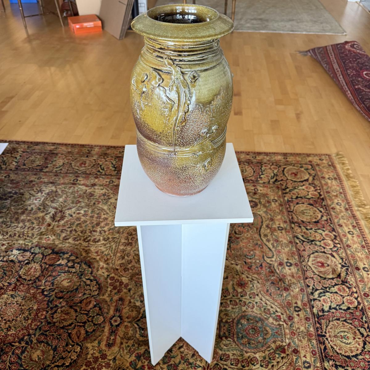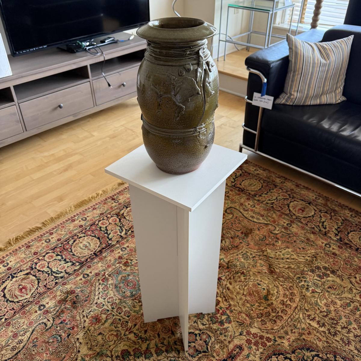 This lot contains a gorgeous handmade vase that comes with a display stand. The Vase is an olive green and rusty orange with speckled glaze that gradually grows the lower you go. It has some texture accents as well. This piece measures 7”D x 14.5”H. There is a signature on the bottom but I could not discern the name, see pictures for details. The stand is a plain white stand that appears to be made from manufactured wood and measures 11.5”SQ x 30”H. Shipping available.