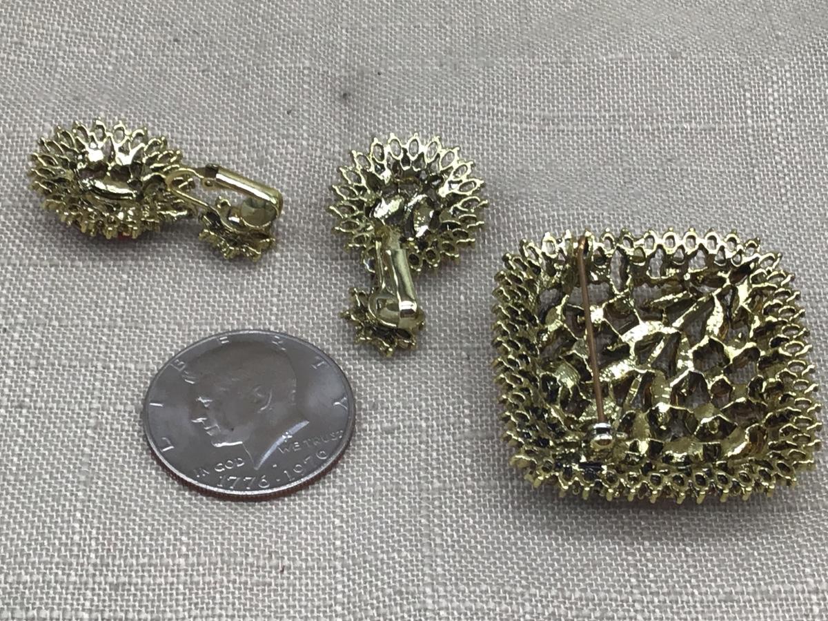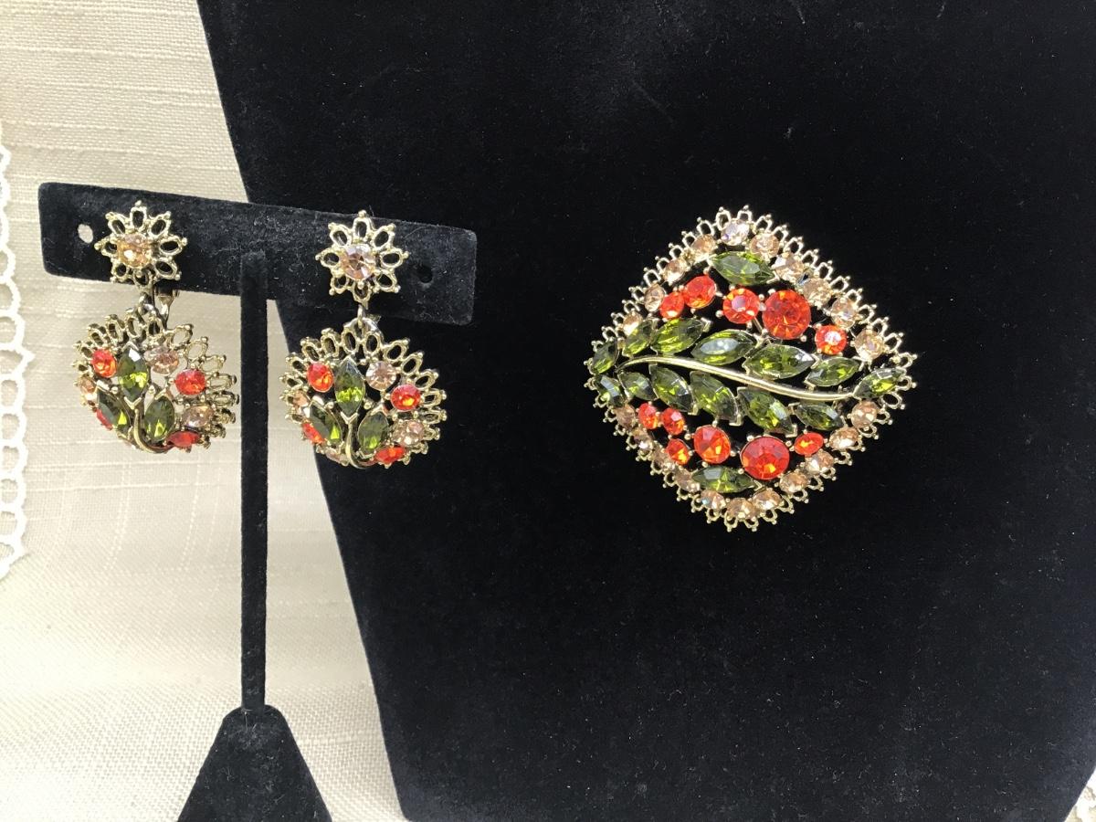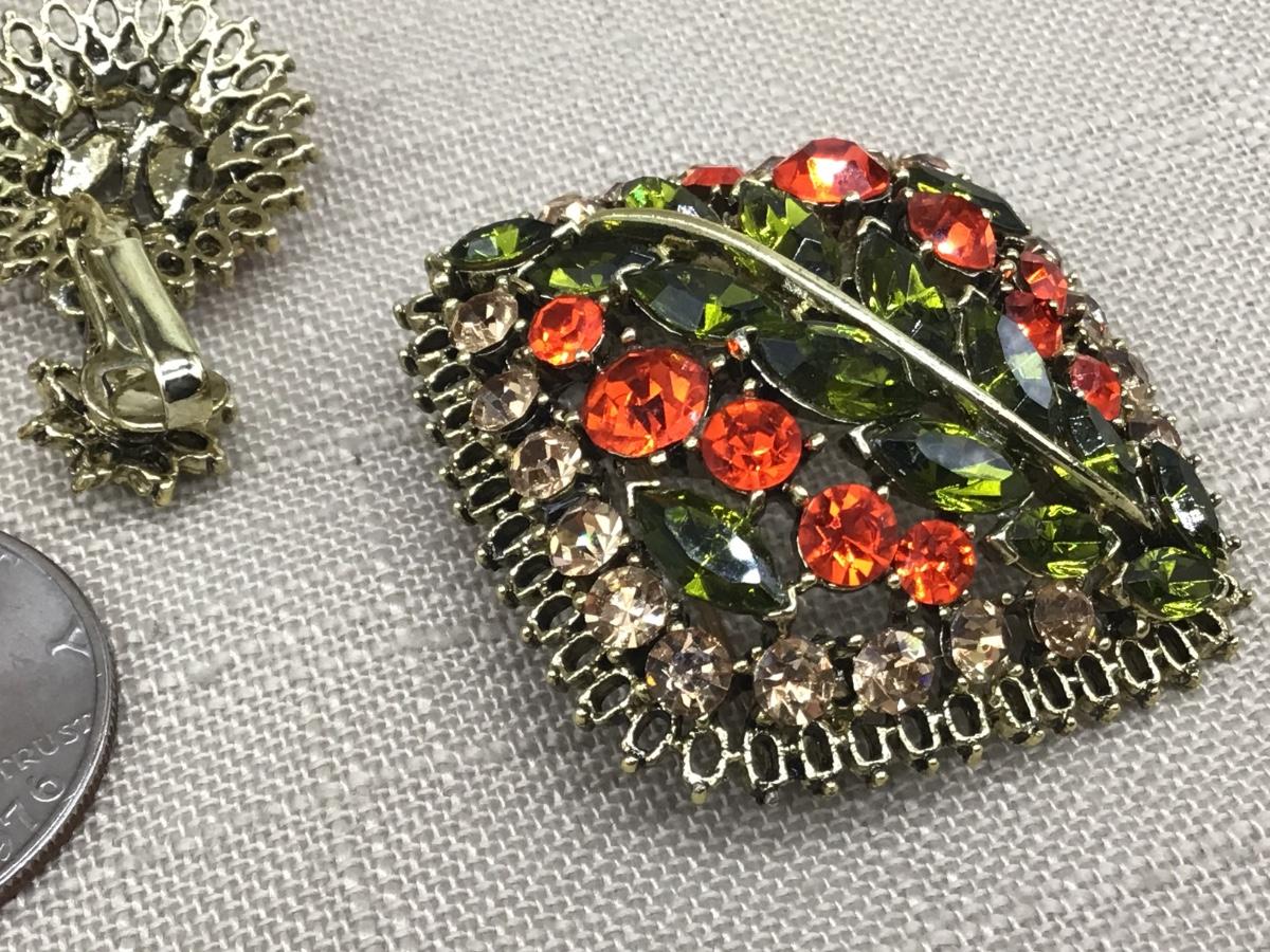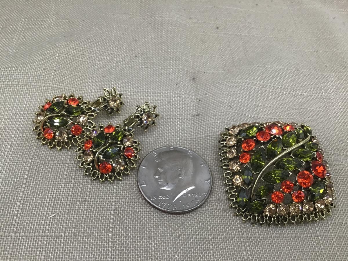 Gorgeous Large Vintage Rhinestone Set Olive Green Orange and Peach Rhinestones