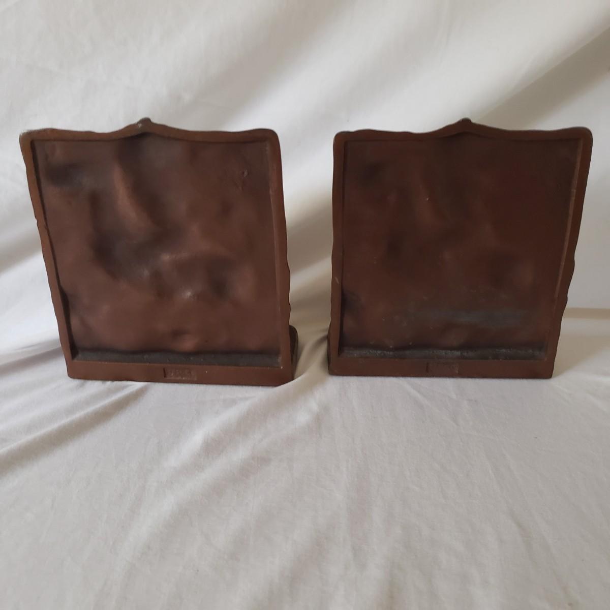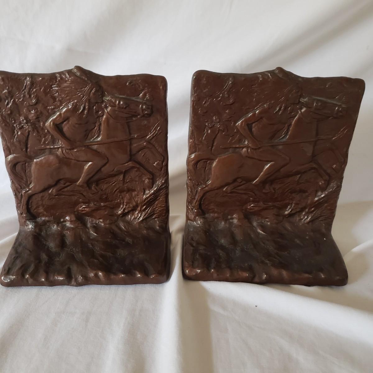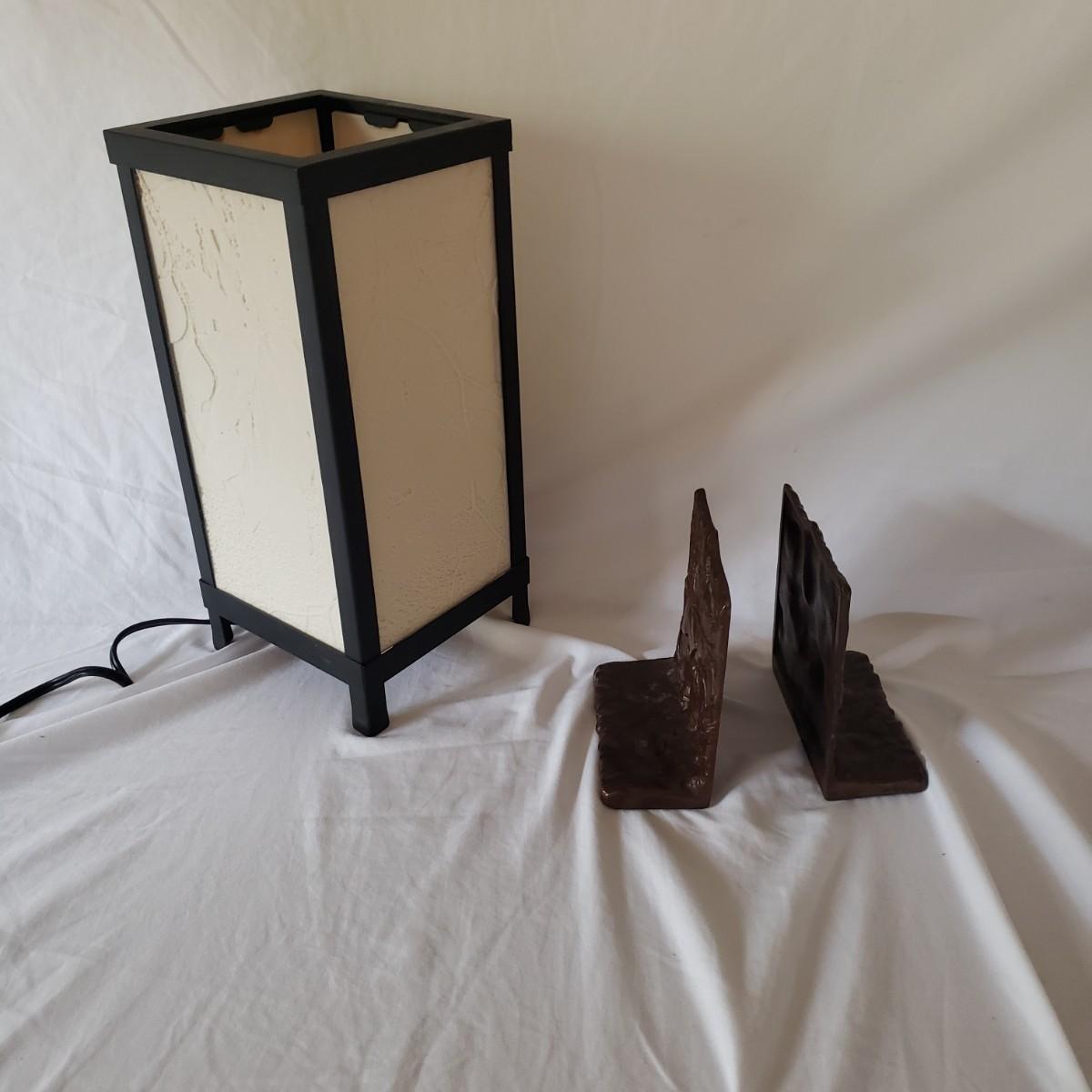 This unique metal and glass lamp lights up a beautiful outdoor scene with a three dimensional view. The lamp powers on when plugged in and has a switch on the cord. The glass panels are molded to get the effect when turned on. The lamp measures 6" x 6" x 13.5"H. The two what appears to be brass bookends features a native American on horseback. The back of each bookend is stamped "9844". They are heavy to the touch.
