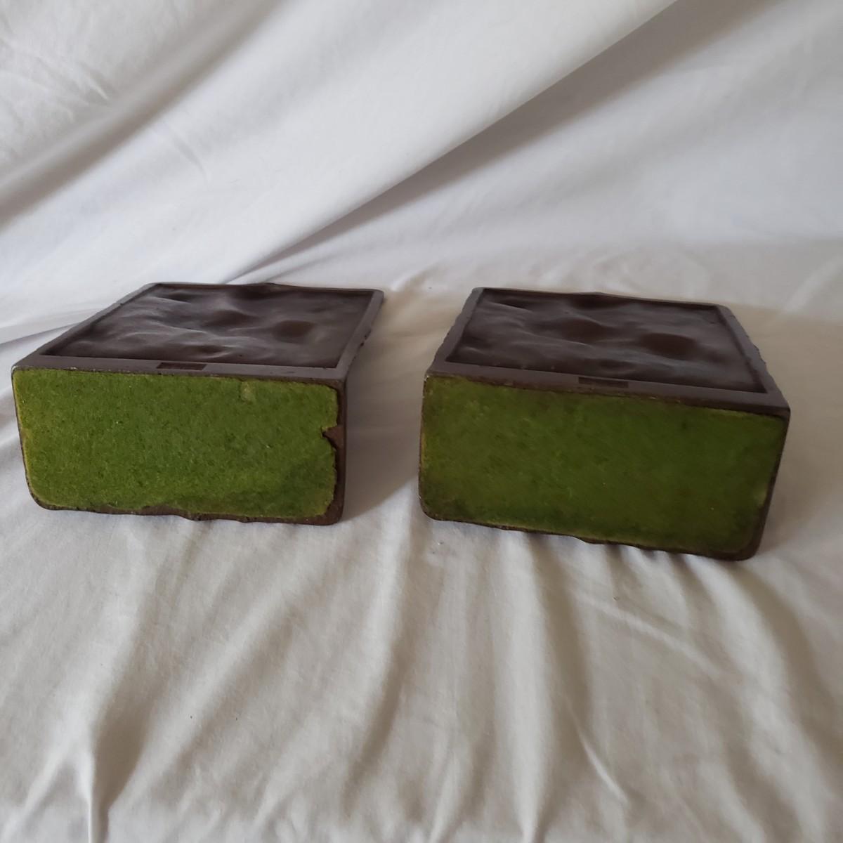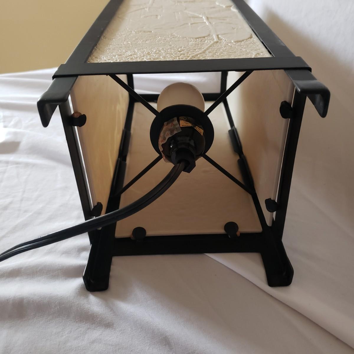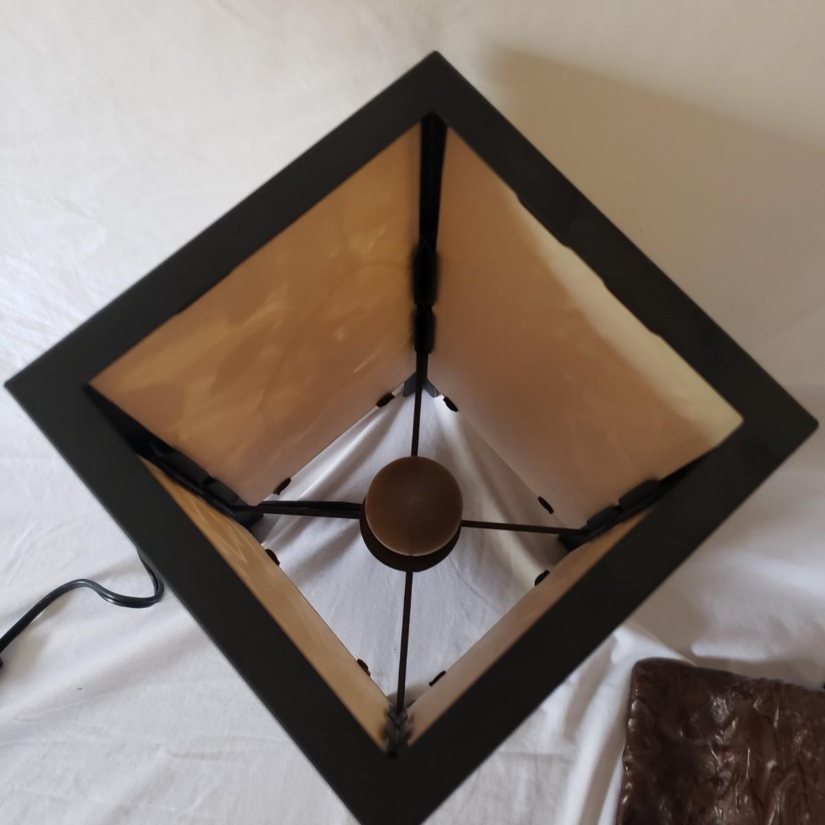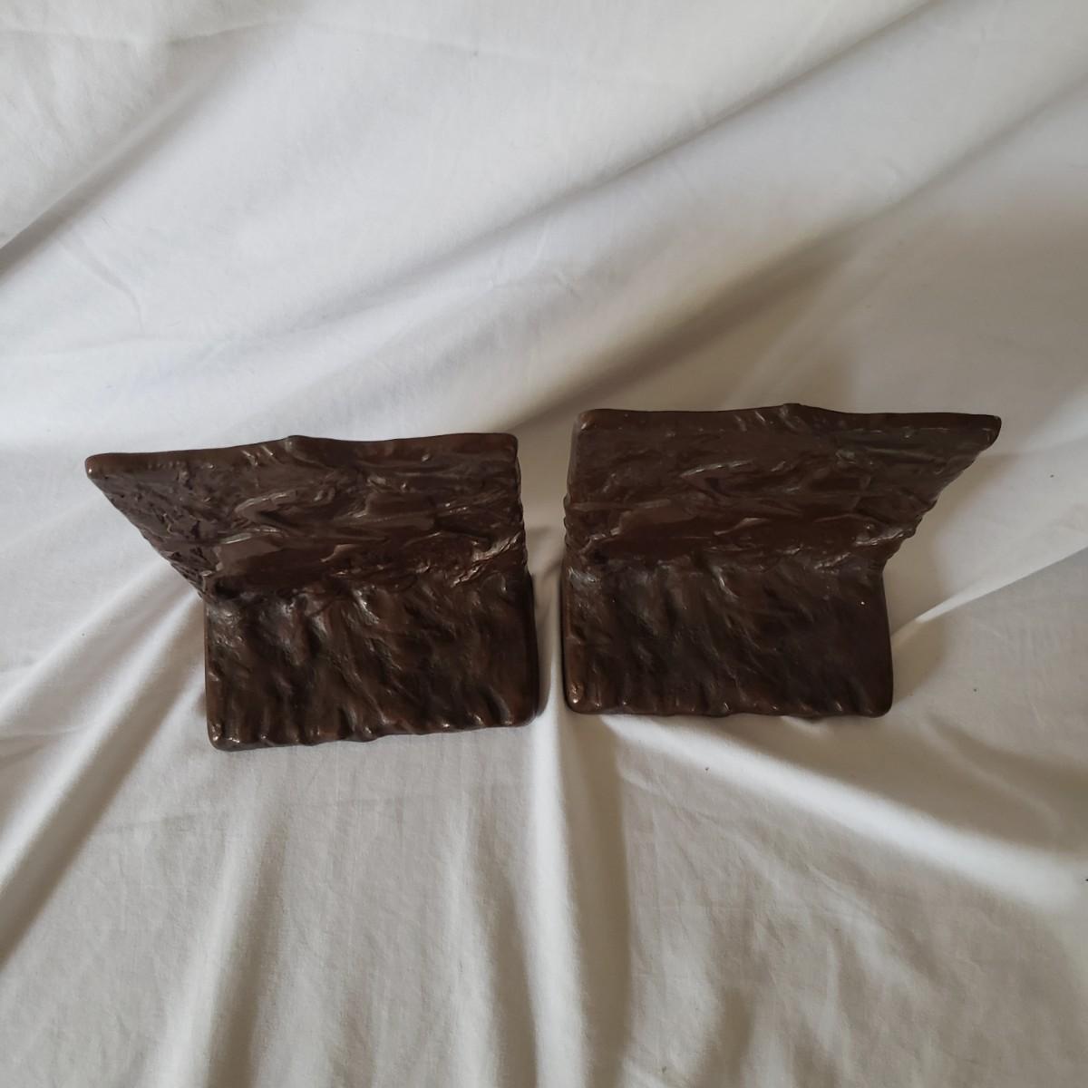 This unique metal and glass lamp lights up a beautiful outdoor scene with a three dimensional view. The lamp powers on when plugged in and has a switch on the cord. The glass panels are molded to get the effect when turned on. The lamp measures 6" x 6" x 13.5"H. The two what appears to be brass bookends features a native American on horseback. The back of each bookend is stamped "9844". They are heavy to the touch.