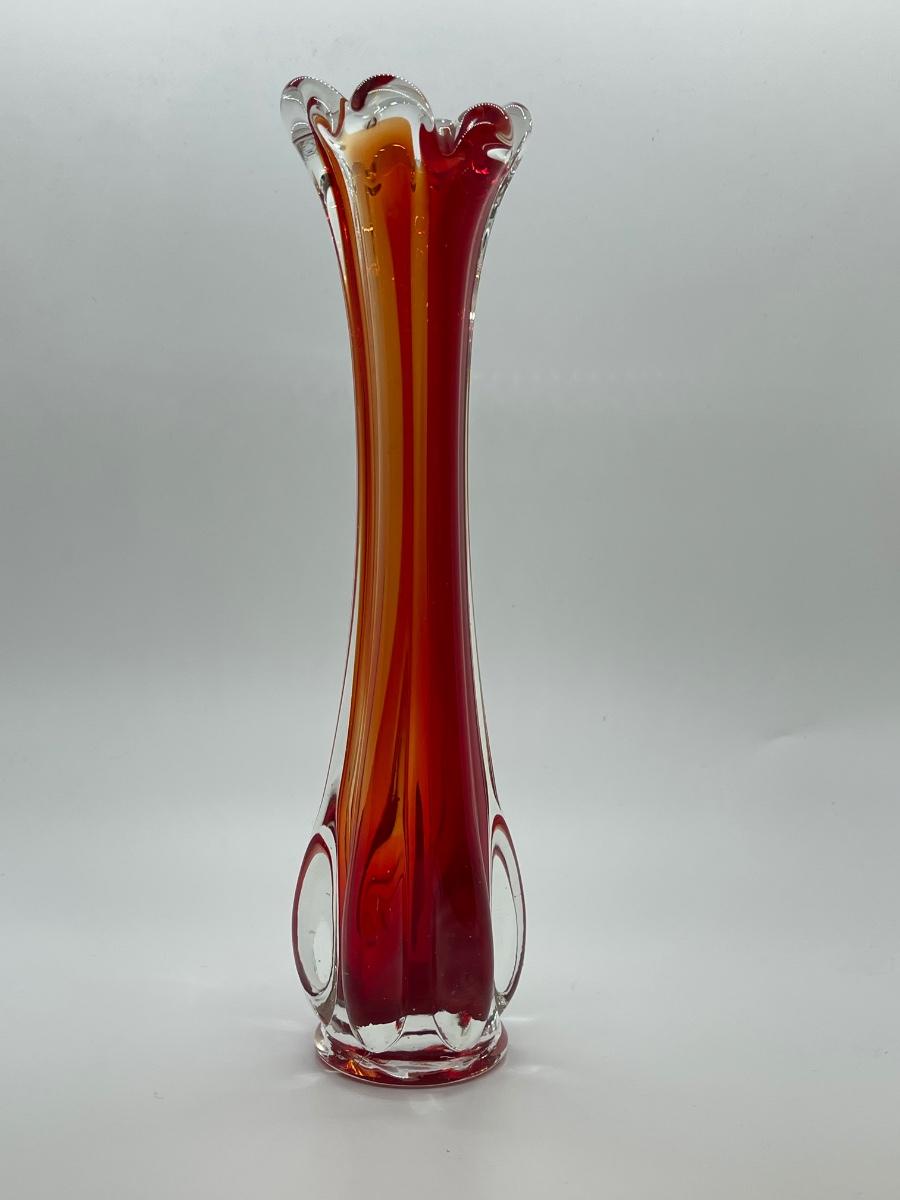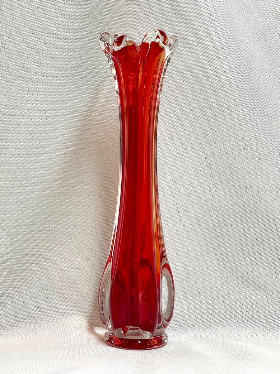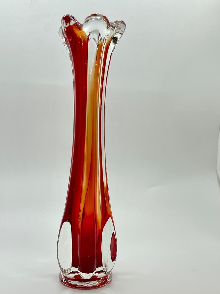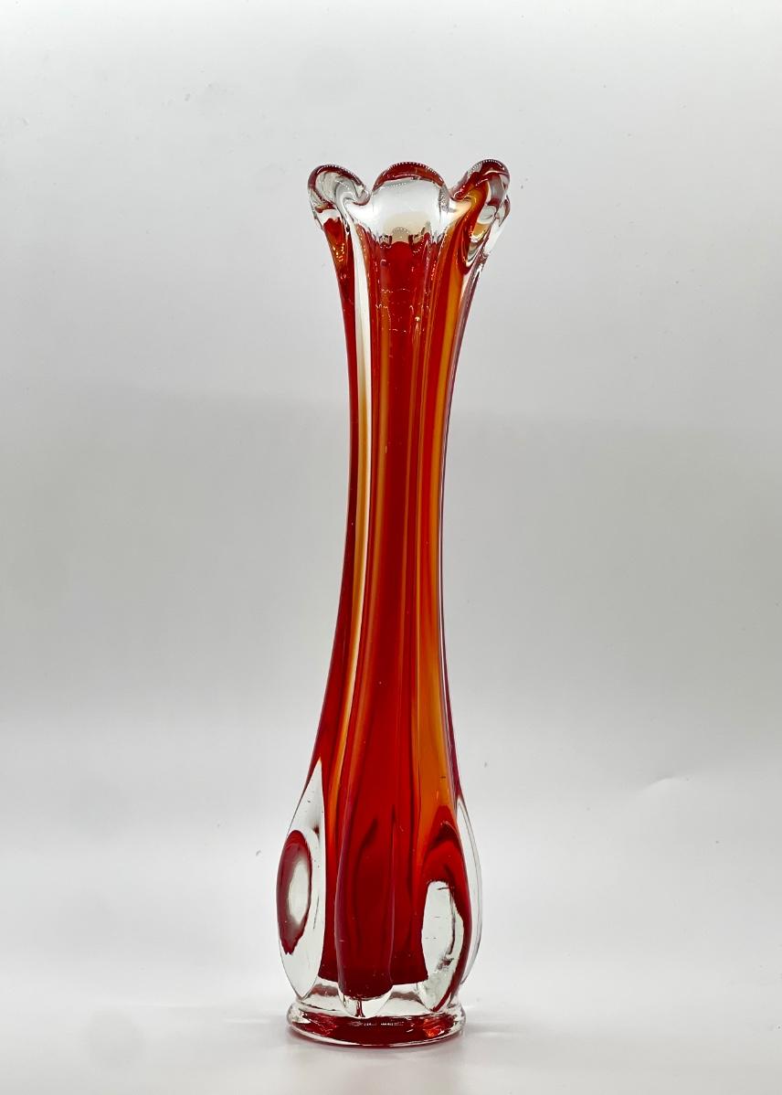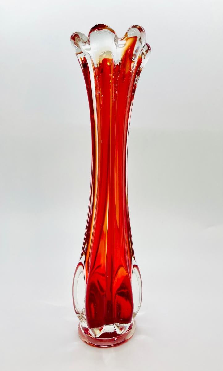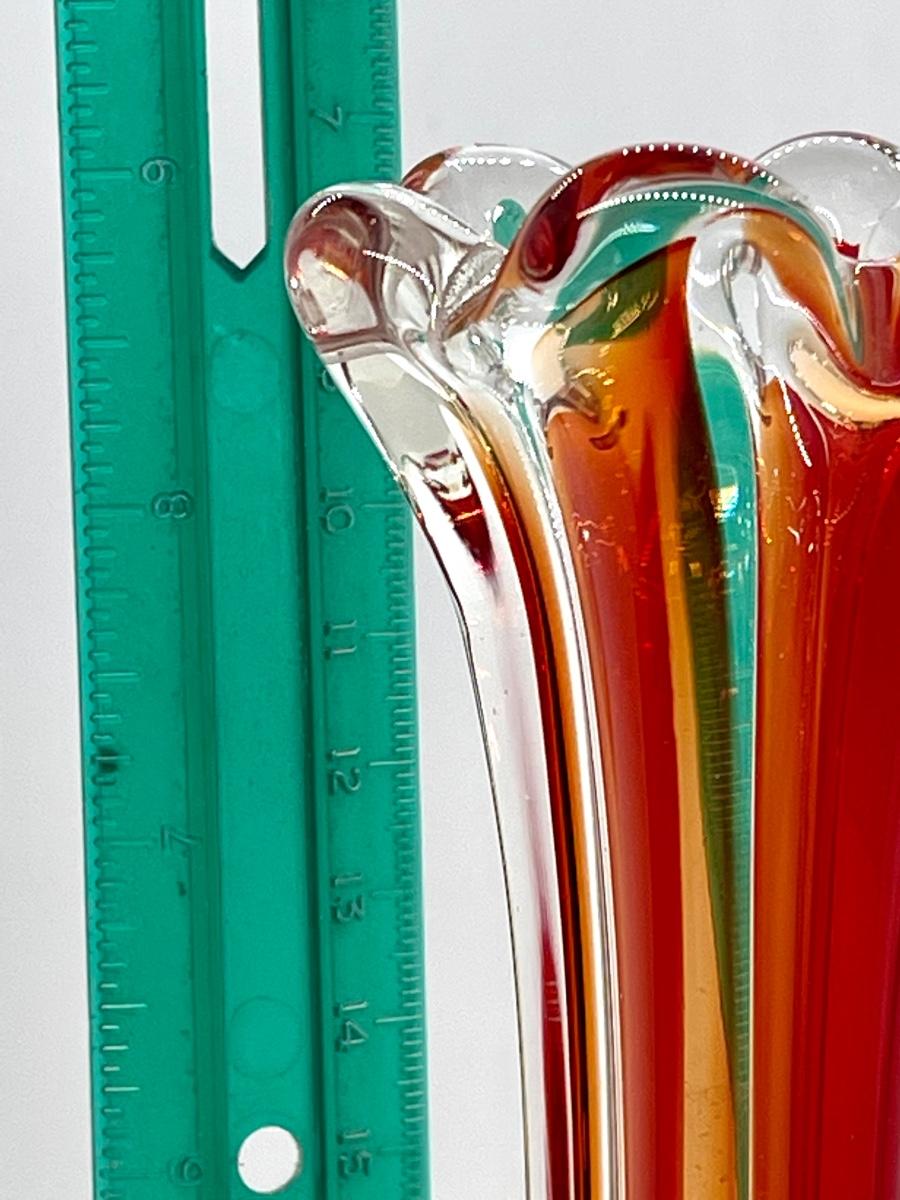 Beautiful orange and red in this glass! Lovely example of a cool vintage piece of glass. Highly desirable vase in a great color! Let this bring a pop of MCM color to your home! Fill with some yellow daffodils and what a pretty display! No chips or cracks.