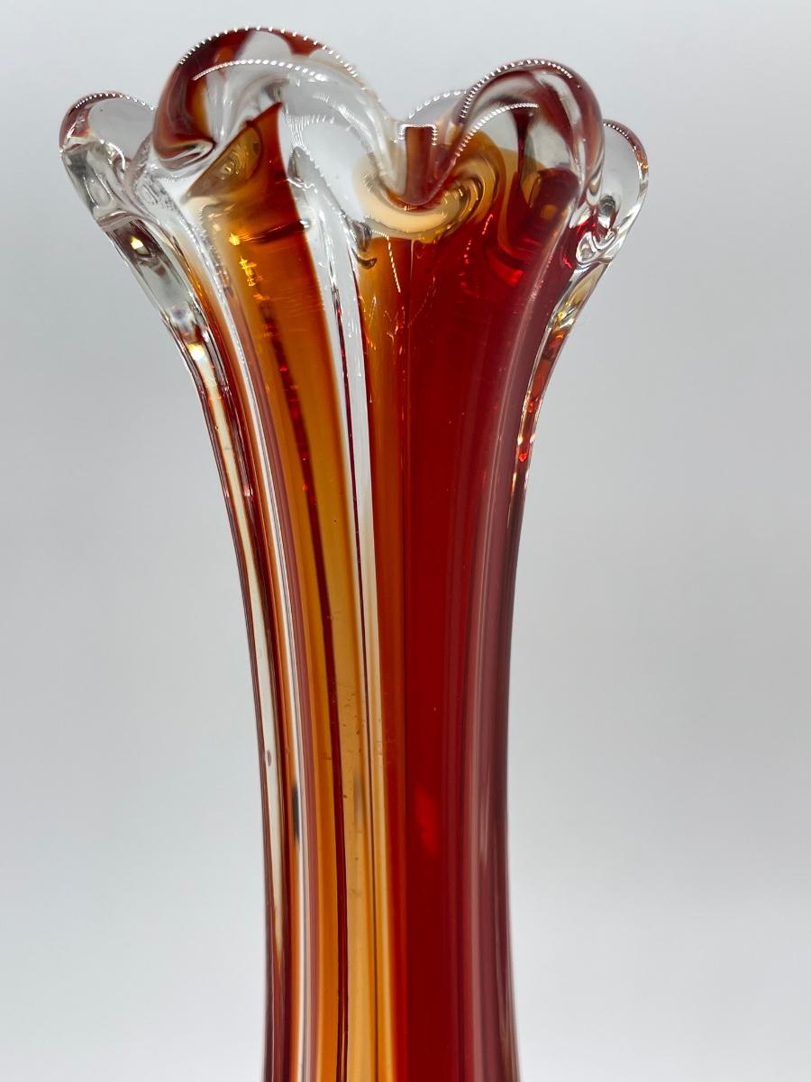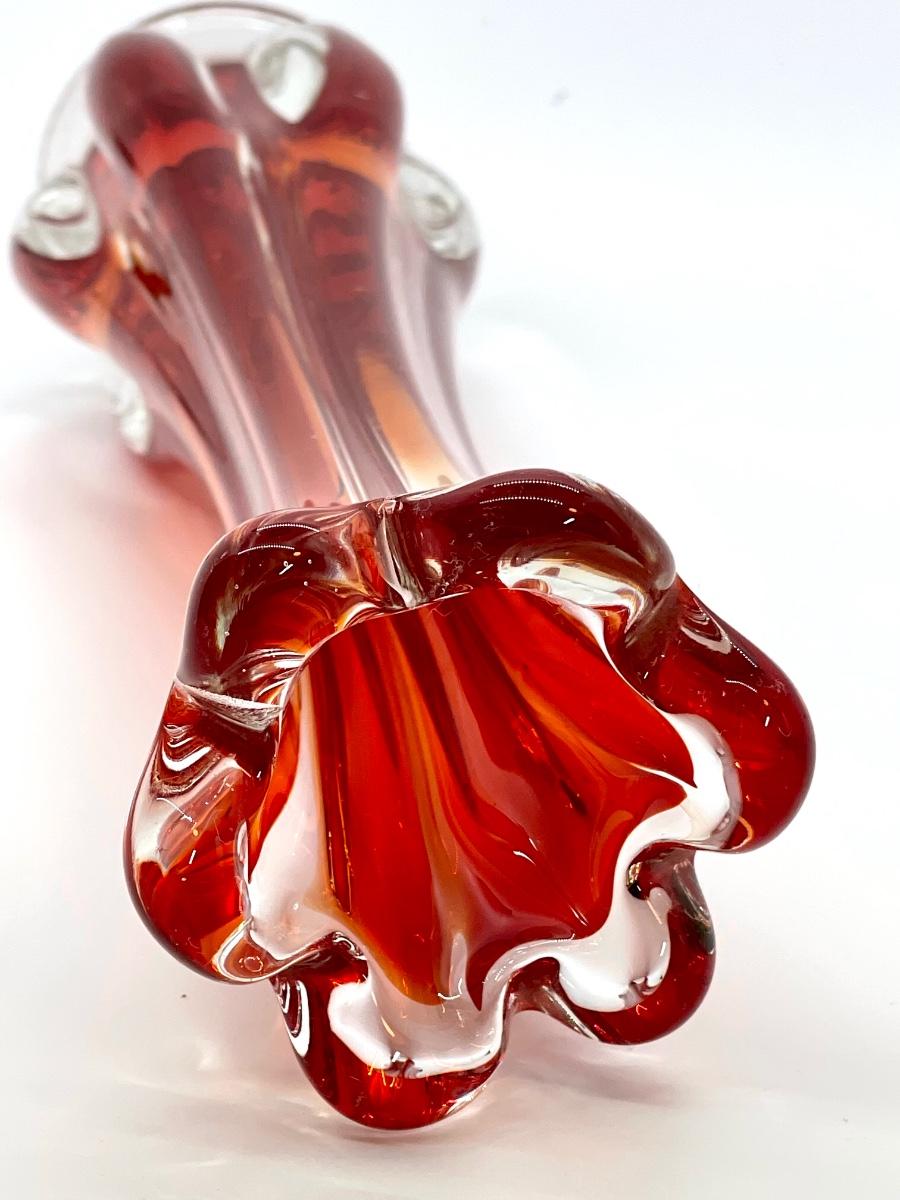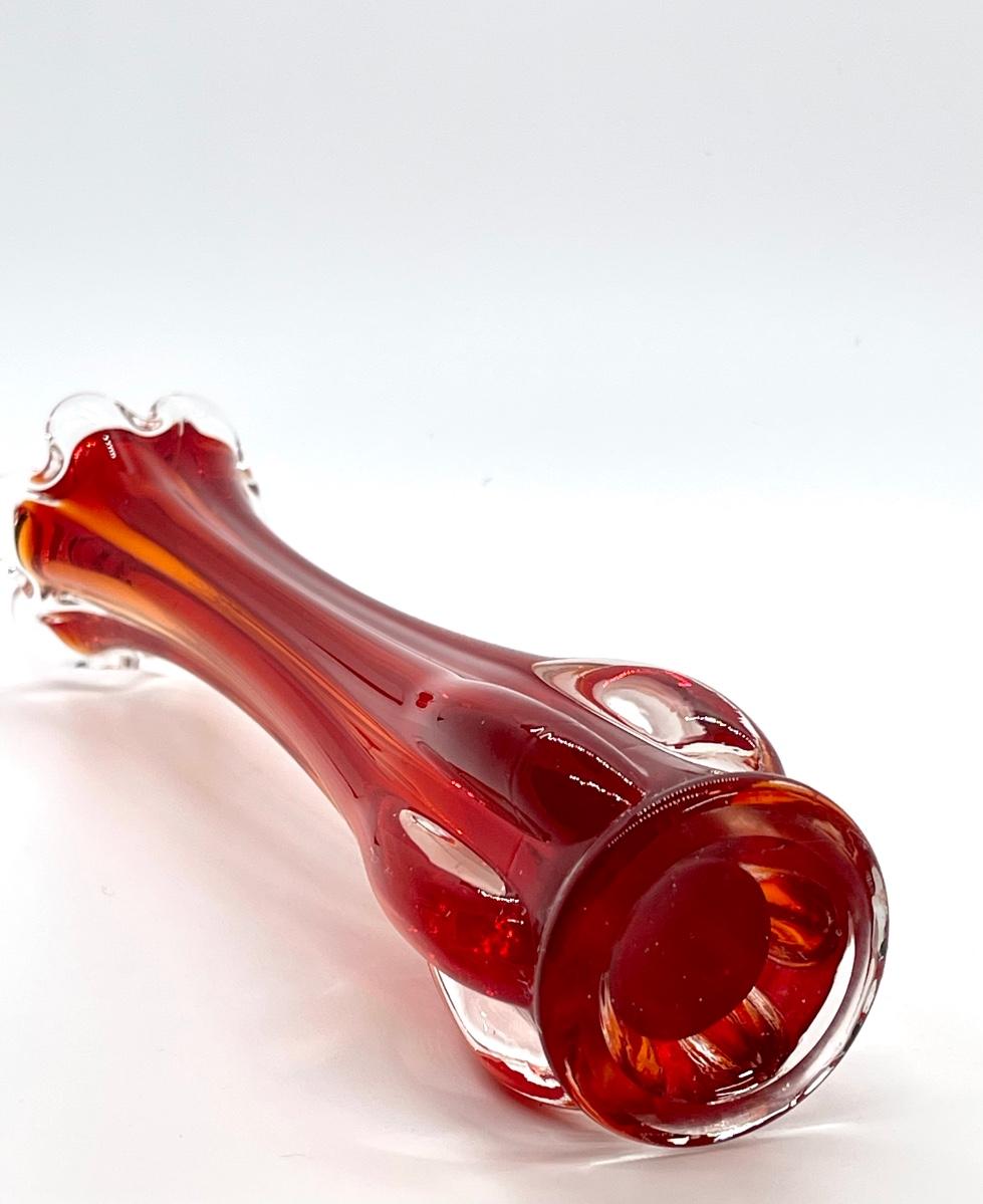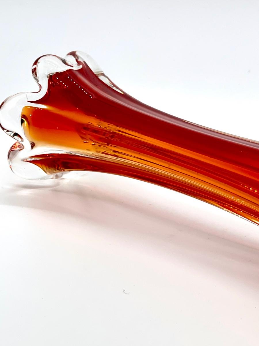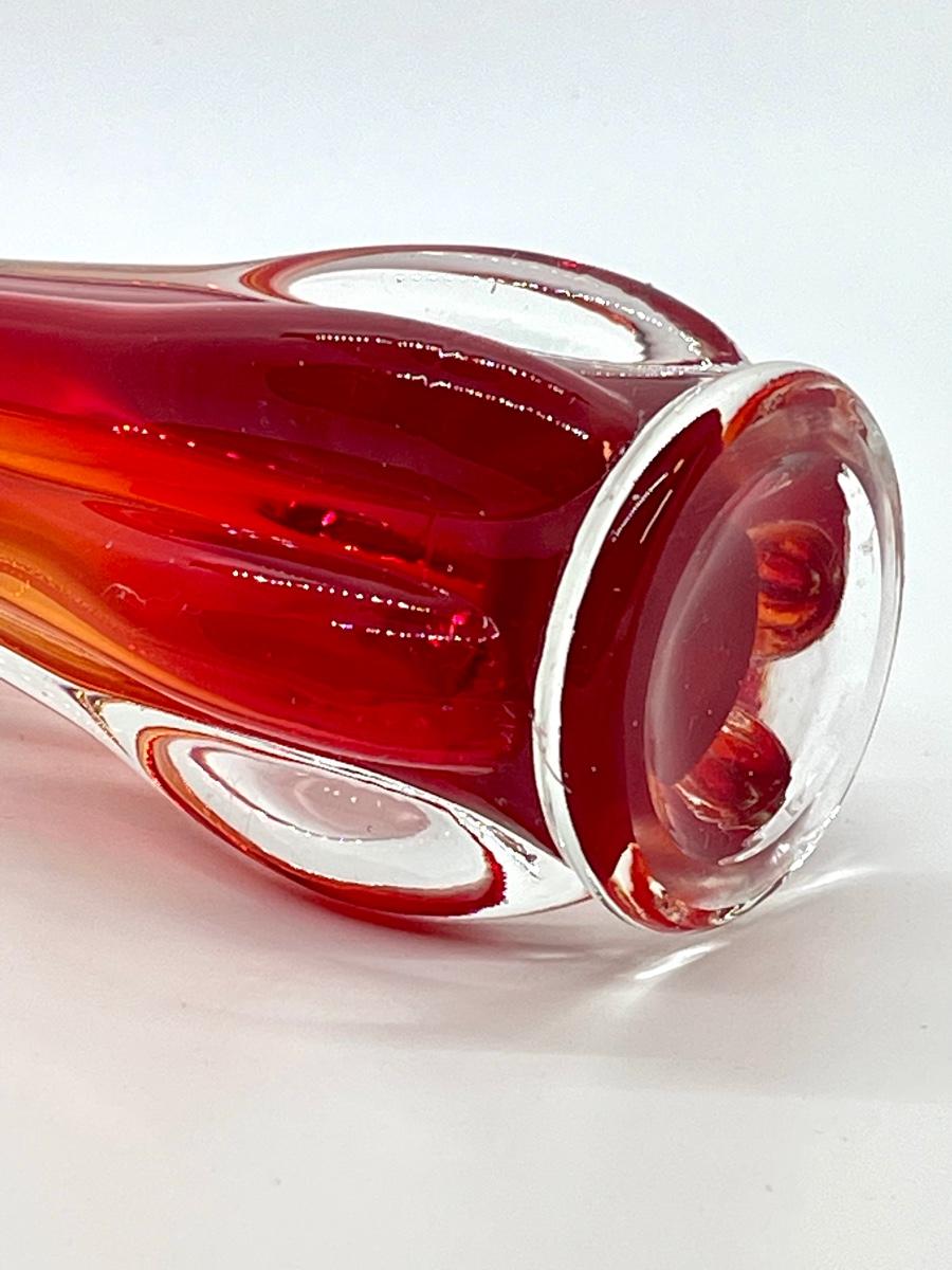 Beautiful orange and red in this glass! Lovely example of a cool vintage piece of glass. Highly desirable vase in a great color! Let this bring a pop of MCM color to your home! Fill with some yellow daffodils and what a pretty display! No chips or cracks.