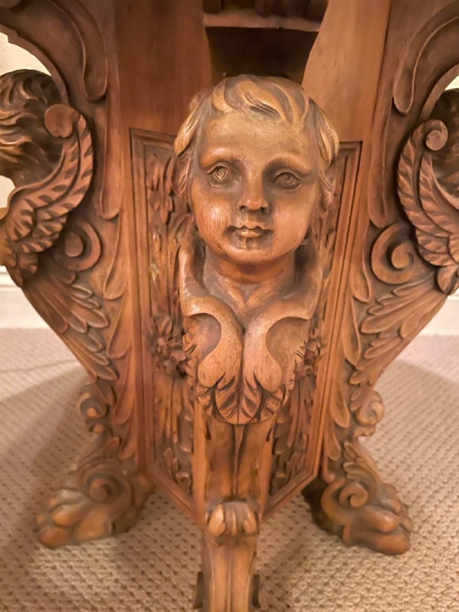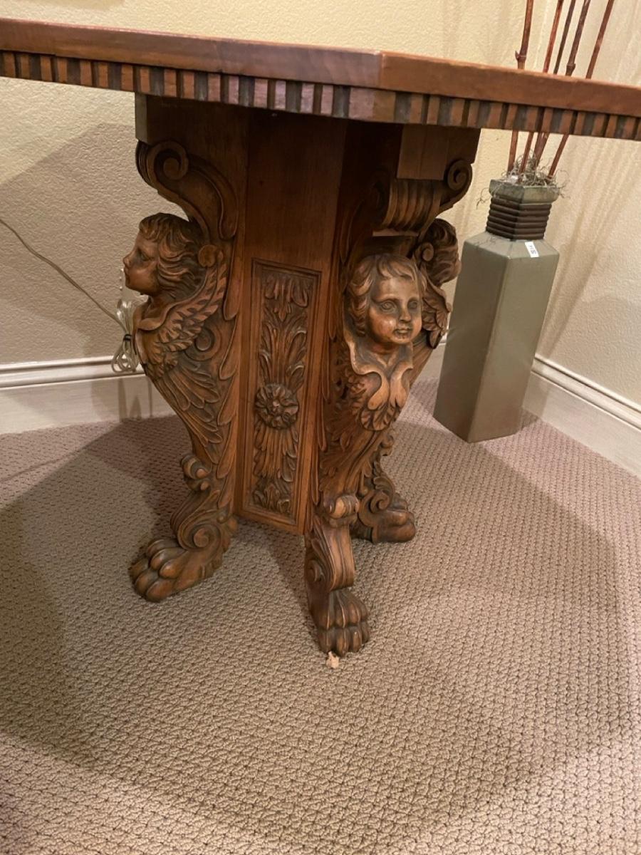 Beautiful solid wood table with beautiful hand carved details. 27x27x25 1/2