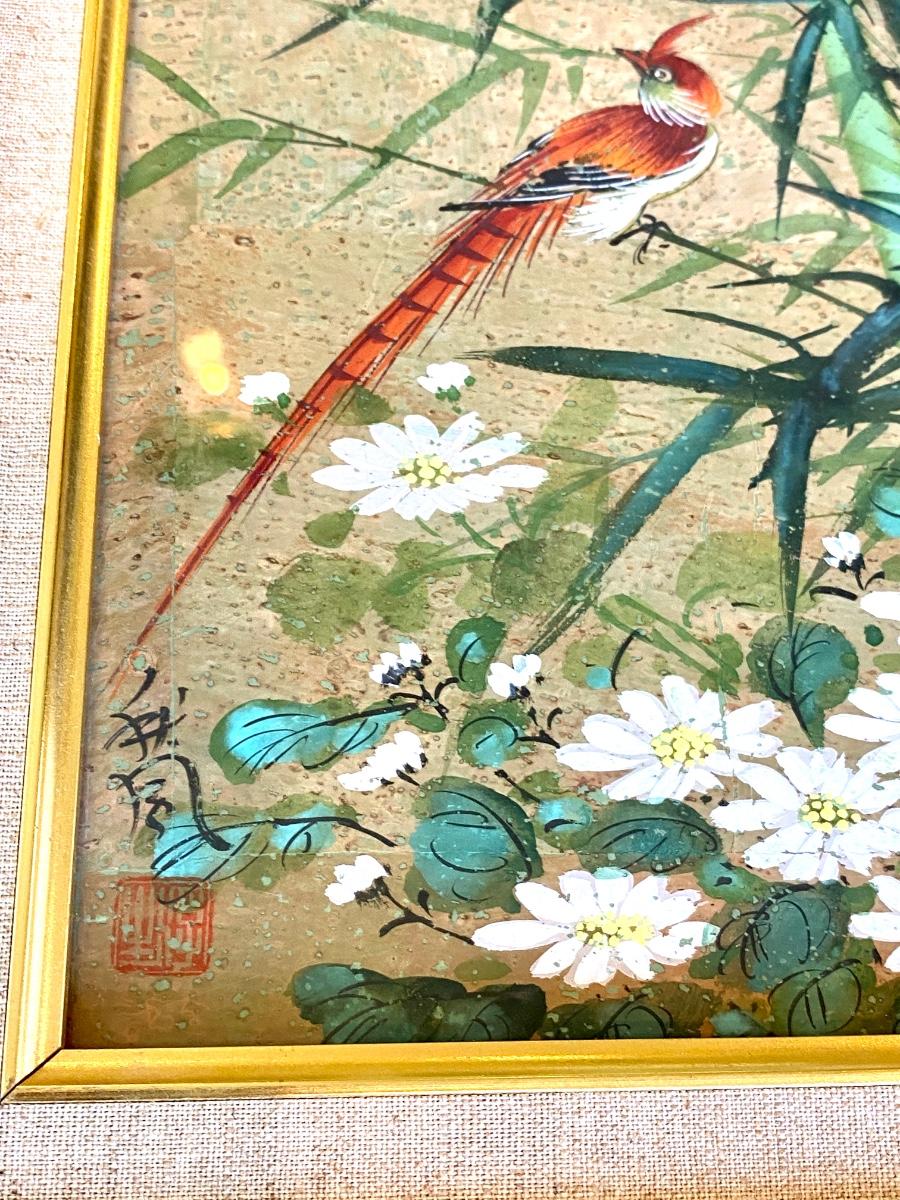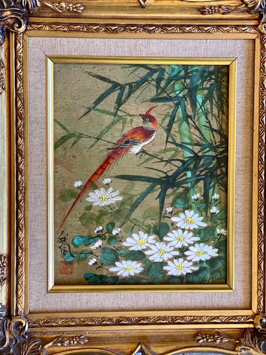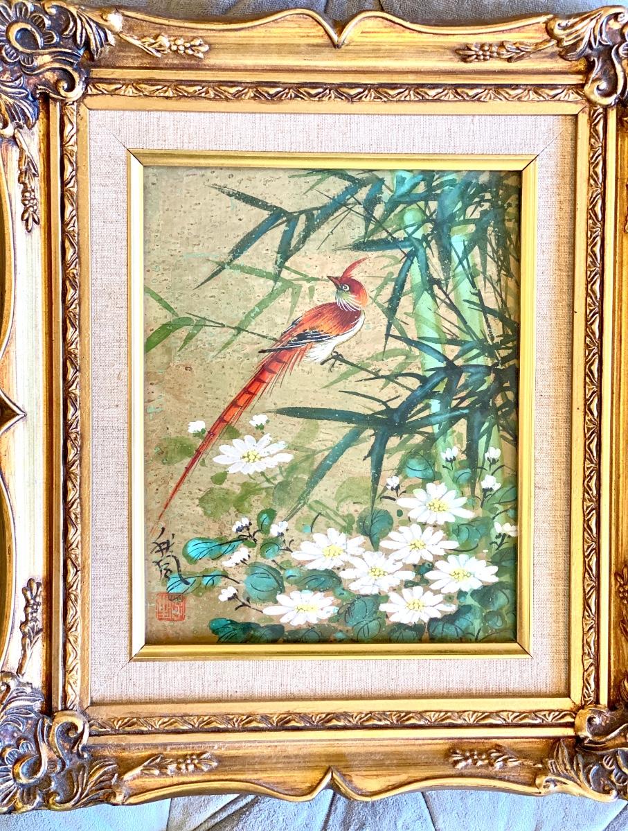 Lovely original artwork of Asian bird in the bamboo and above lily pads. It’s shows layers of color ,wonderful old look. Signed with stamp and written ink. Frame marked made in Taiwan.
