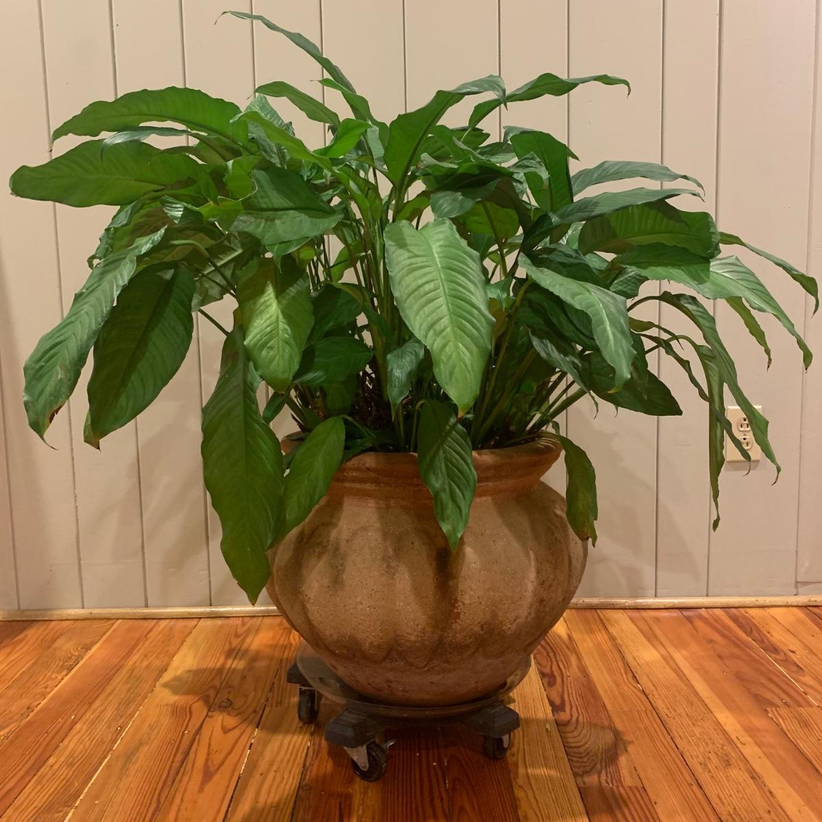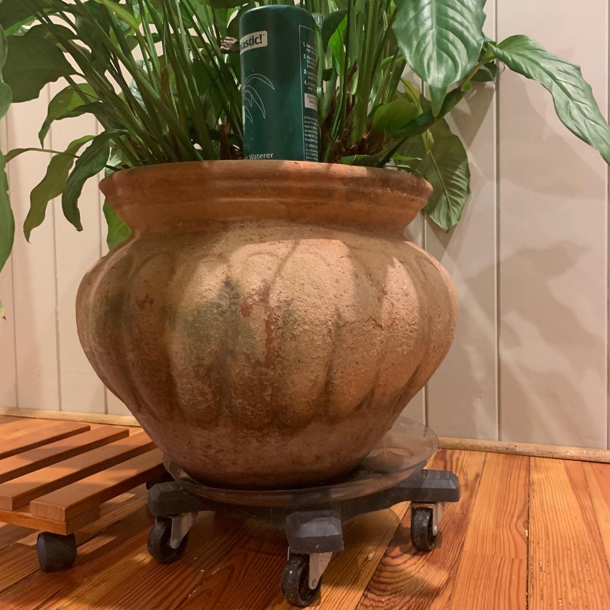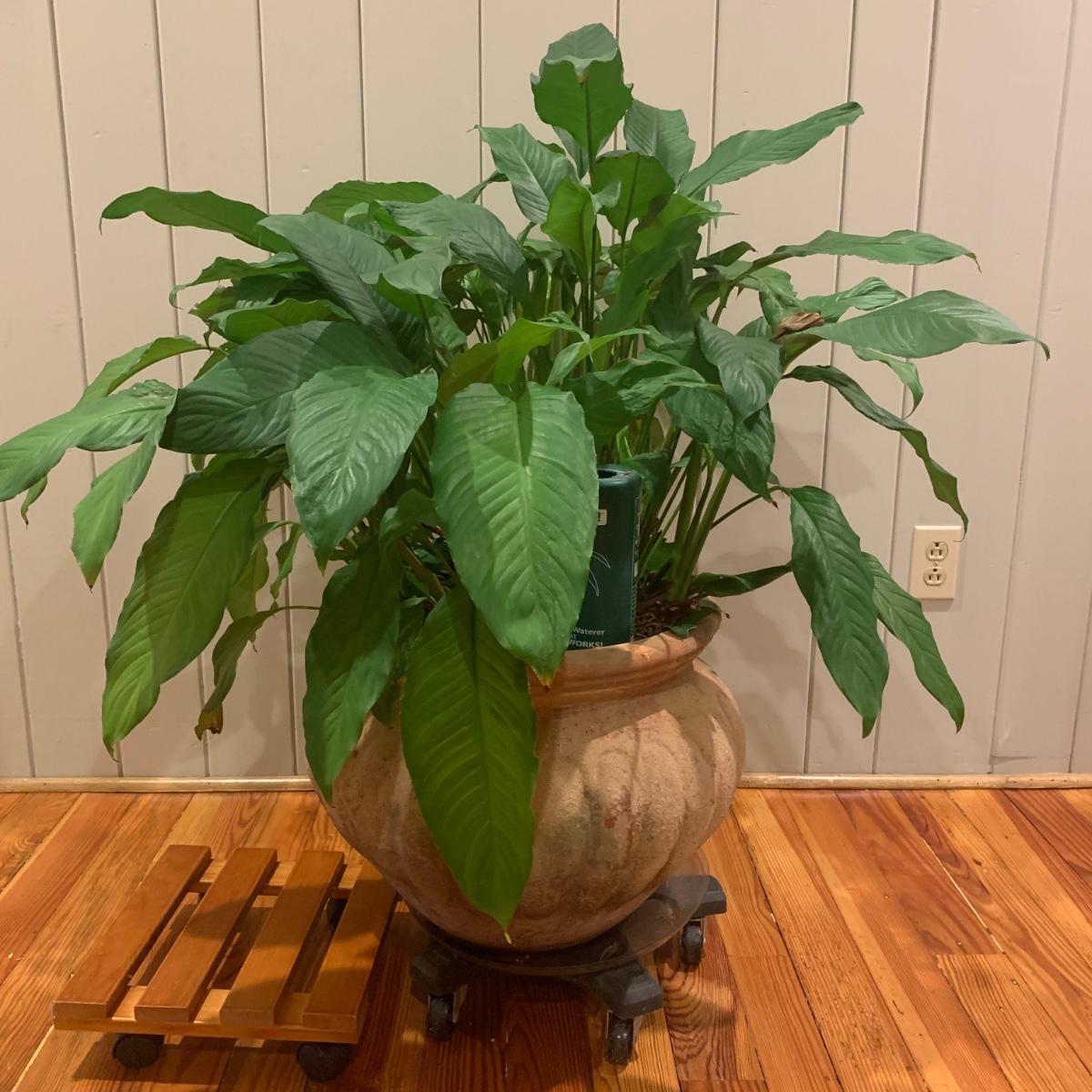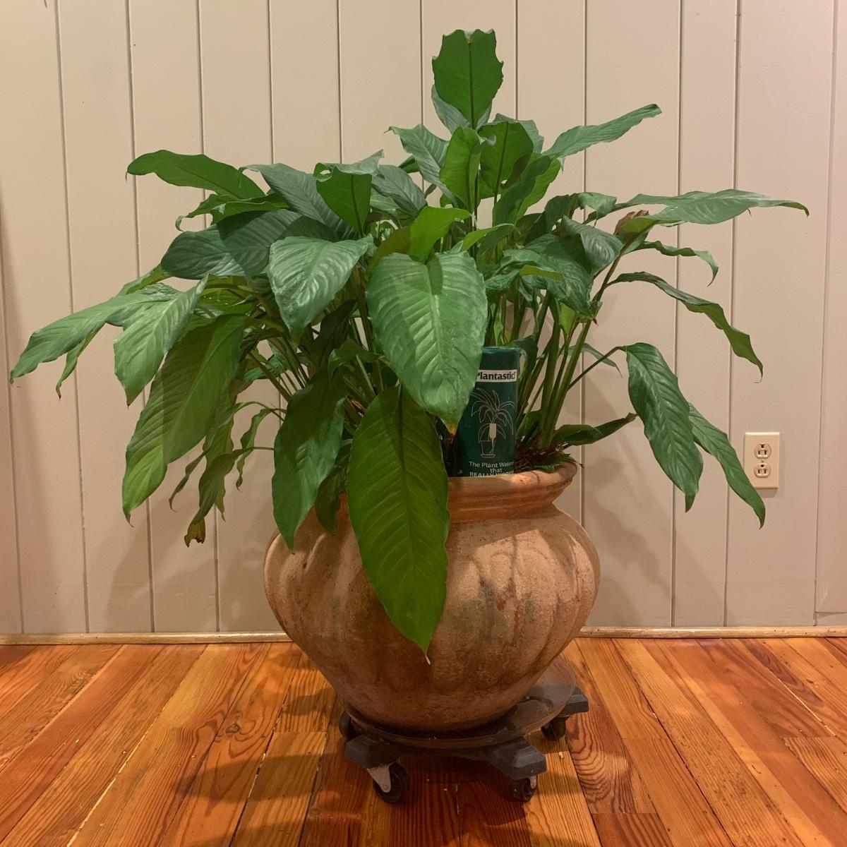 This live Peace Lily is thriving! Though we cannot guarantee the condition of the plant upon pickup. Lot includes potted lily, Plantastic Plant Waterer, and two rolling plant stands.