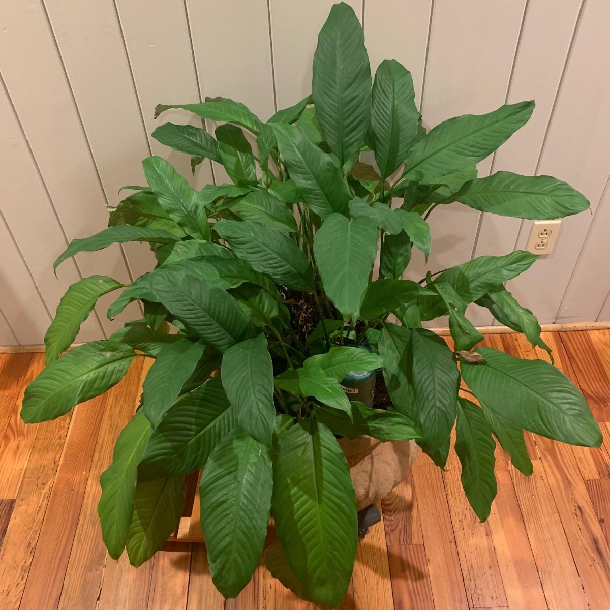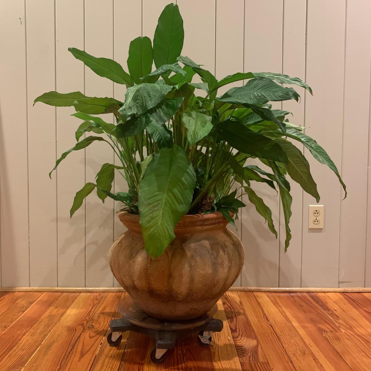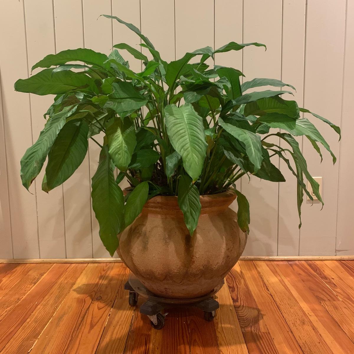 This live Peace Lily is thriving! Though we cannot guarantee the condition of the plant upon pickup. Lot includes potted lily, Plantastic Plant Waterer, and two rolling plant stands.