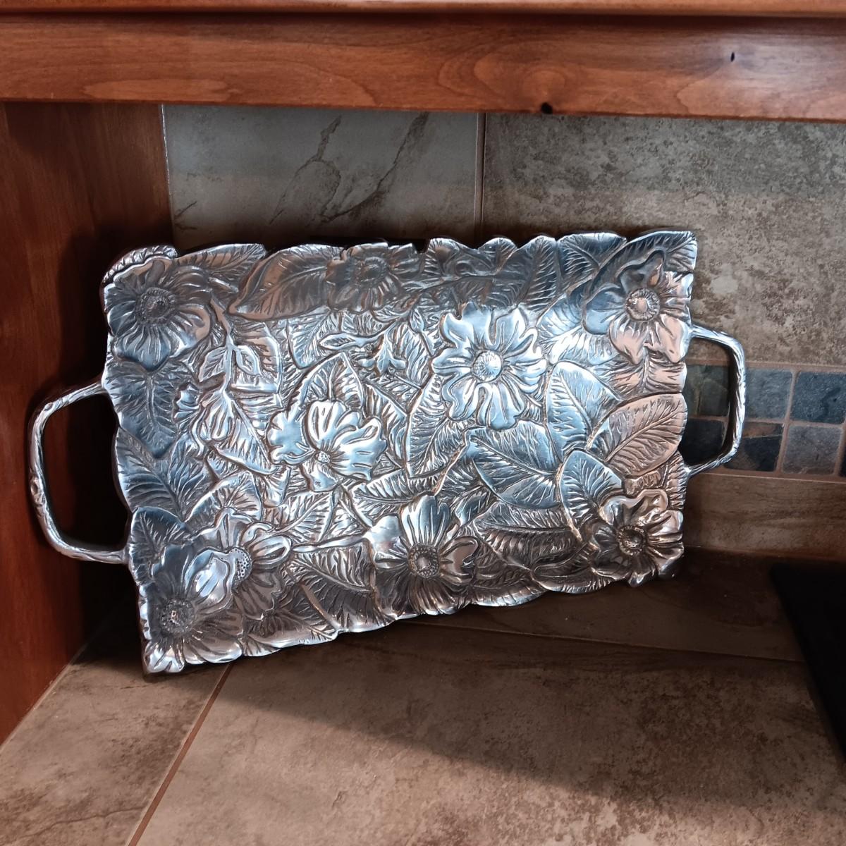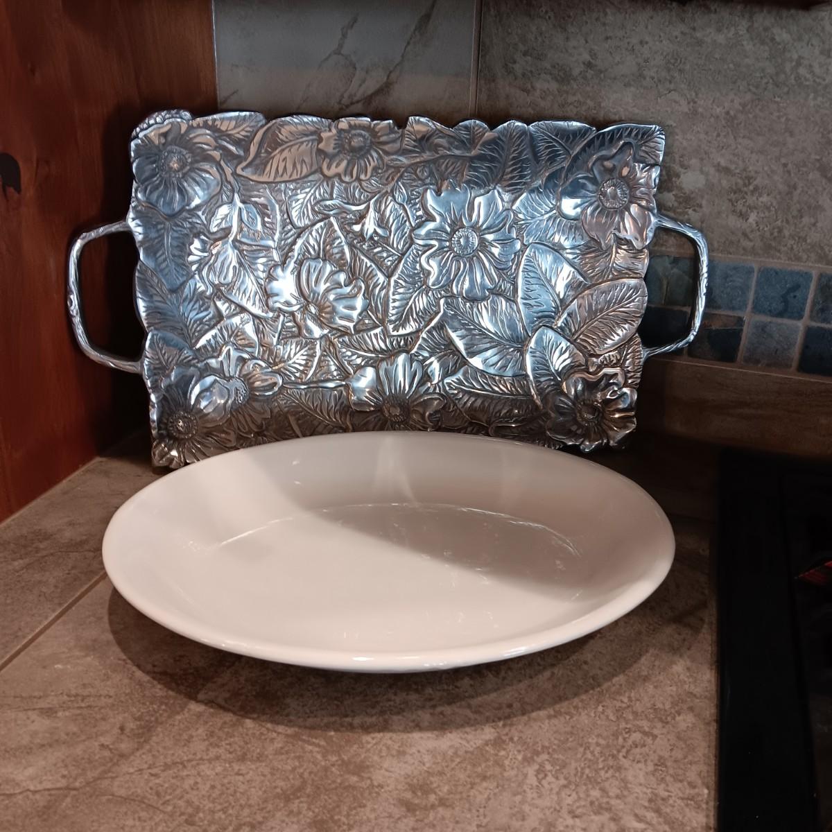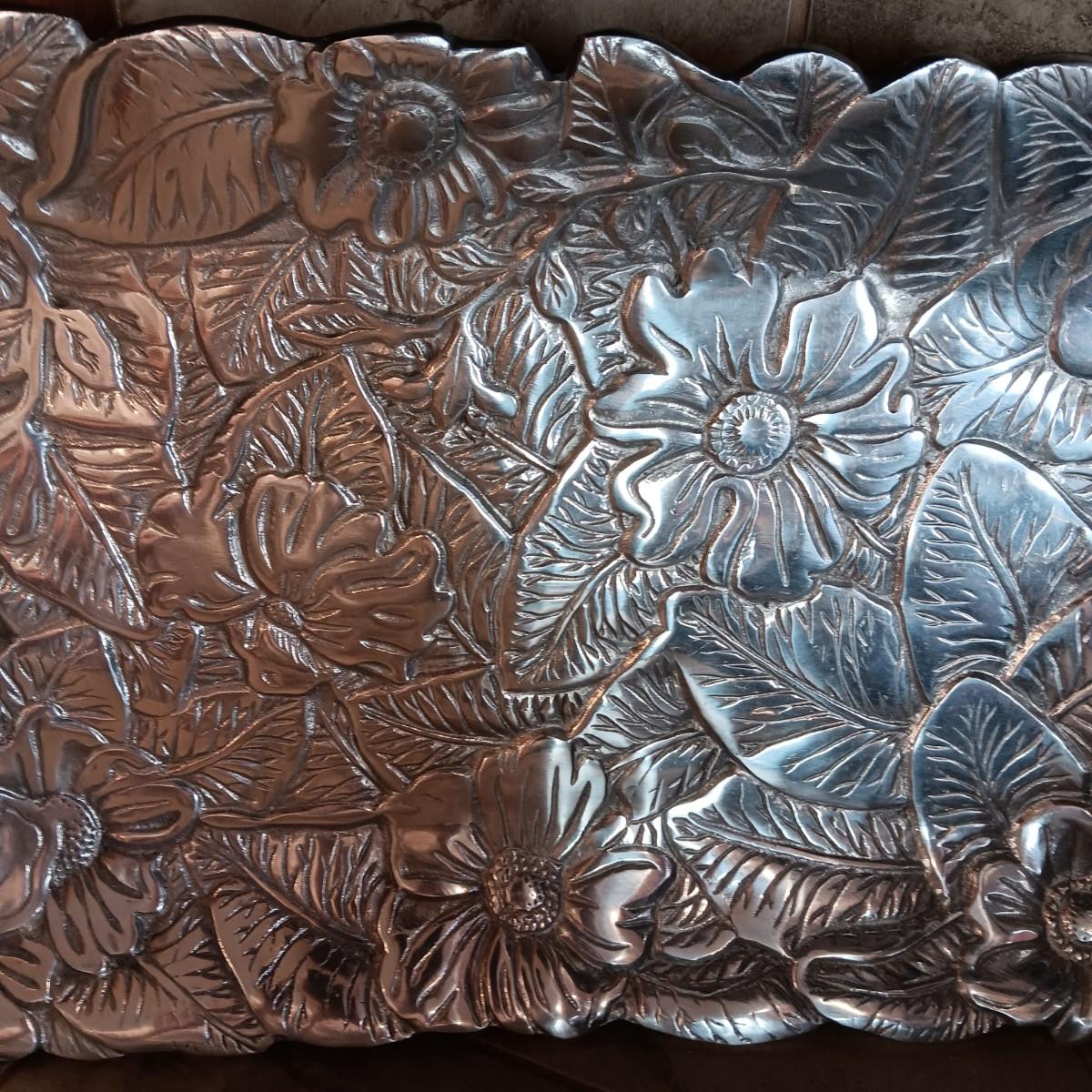 GORGEOUS PEWTER TRAY WITH RAISED DESIGN AND OVAL PLATTER