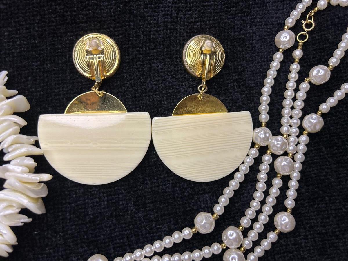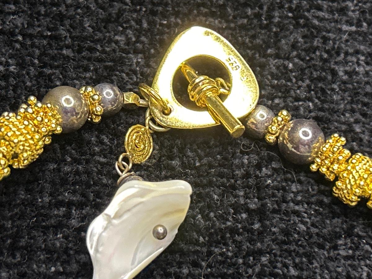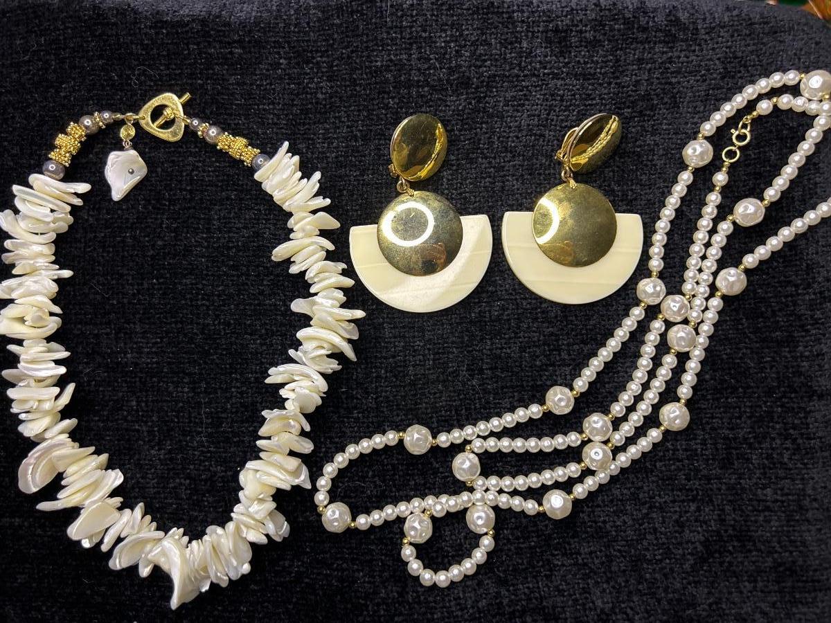 The Shell necklace has a 925 clasp. The earrings are clip on. The other necklace is faux pearl. It’s just stunning!