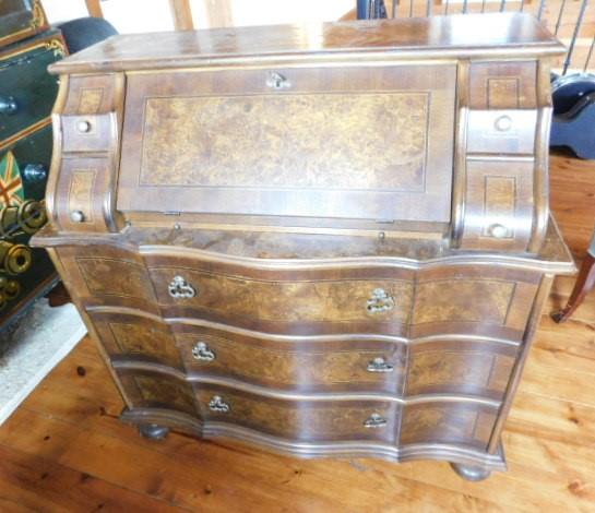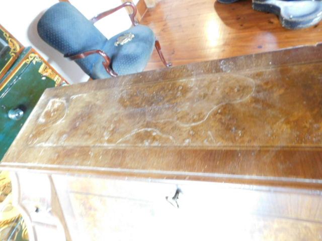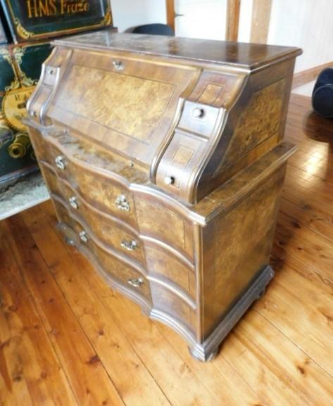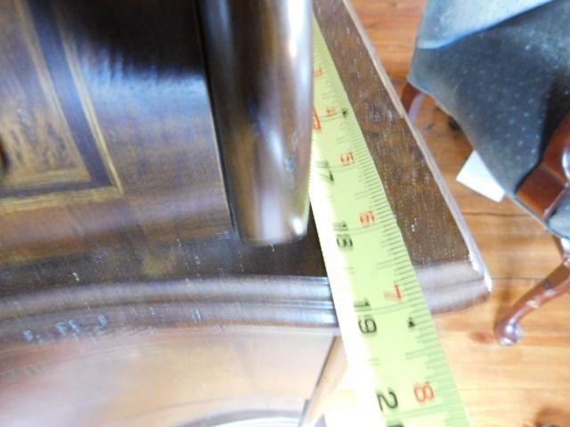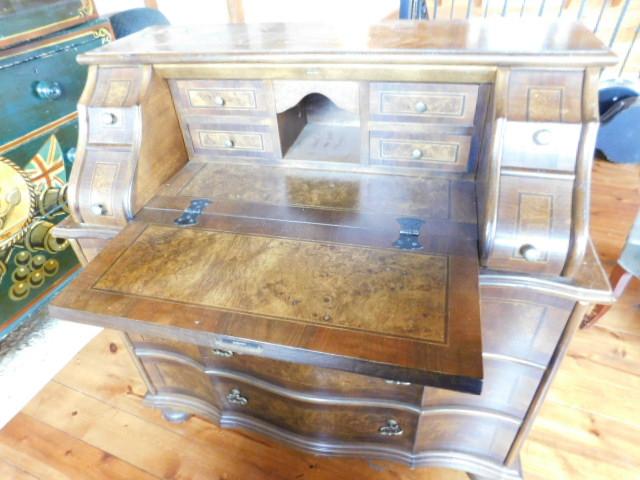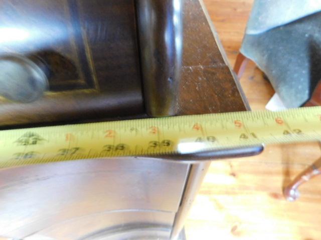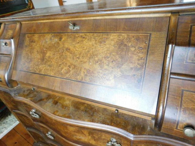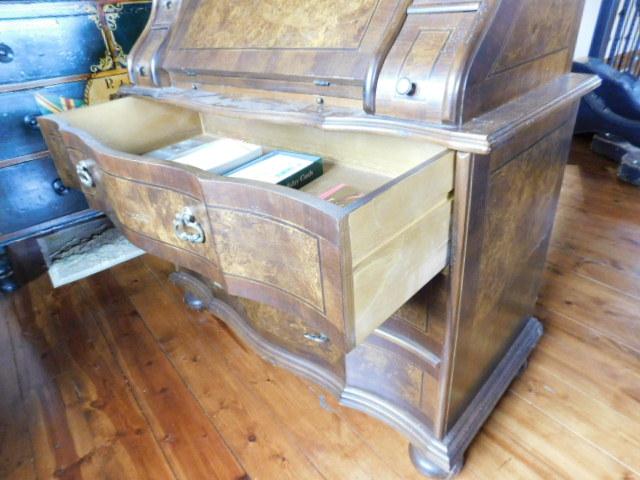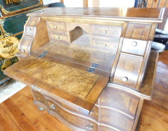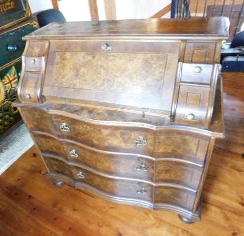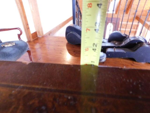 Gorgeous Solid Wood Curly Maple Finish Writing Desk 41"x19"x41" has some wear to the top as shown. Dry cracks at ends as shown. Upstairs item. 2 person removal