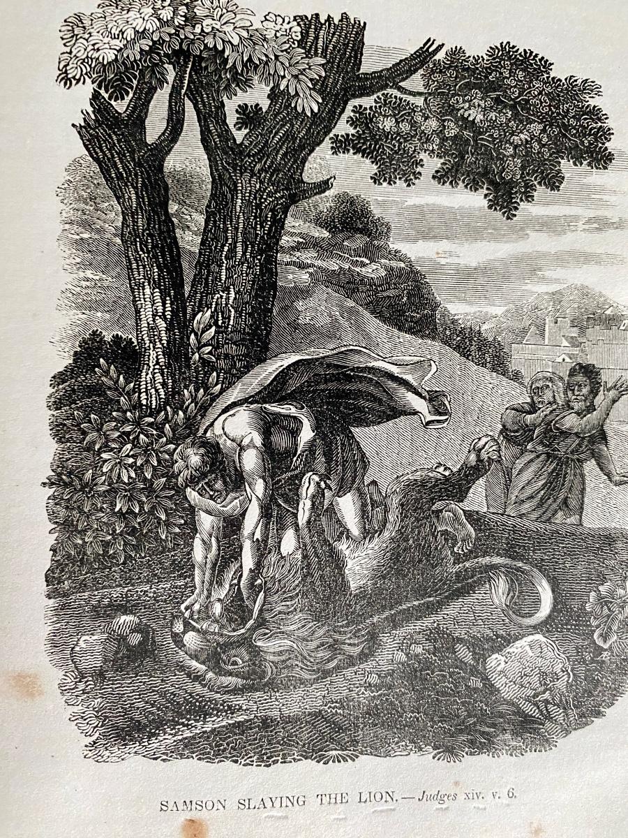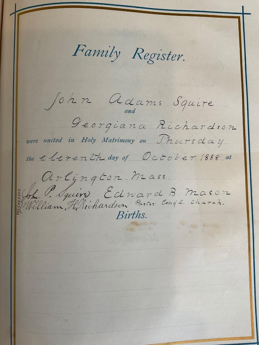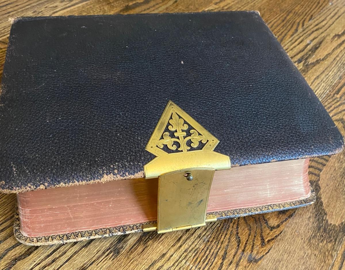 Wonderful antique bible that was wedding gift for John A. Squire of Boston and Palo Alto California and his wife Georgianna Richardson of Boston . 1884 leather with fabulous working brass clasp, gilt pages, clean interior with amazing engravings throughout. Squire family dates between testaments. Wear to leather cover as shown