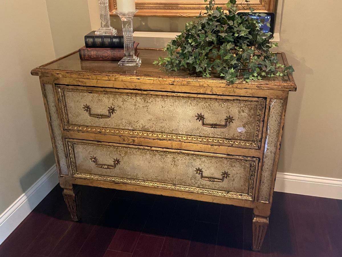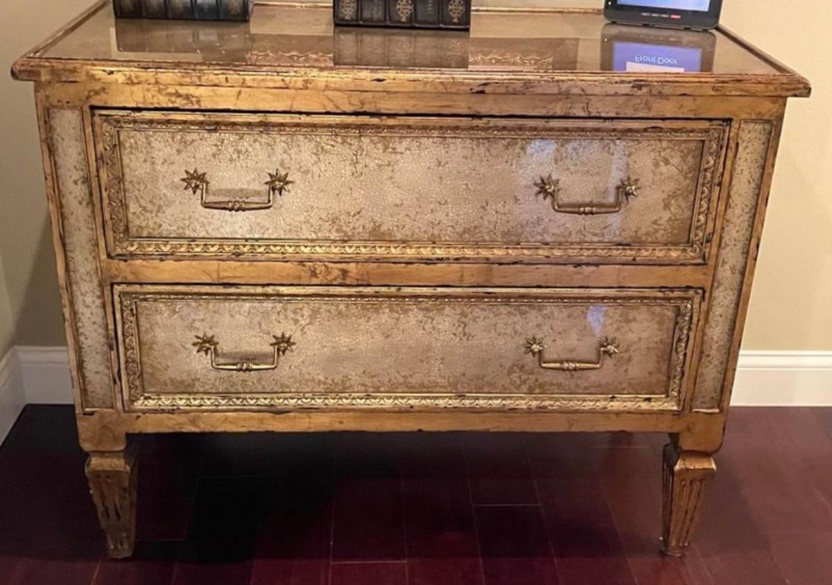 Theodore Alexander Palazzo chest. A Venetian silvered and gilt verre églomisé paneled chest features two deep drawers with brass drop handles. Tapered square legs and the lustrous gold leaf style finish.