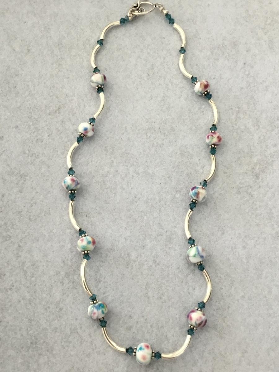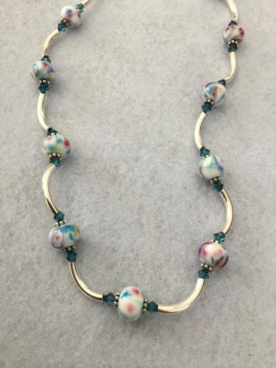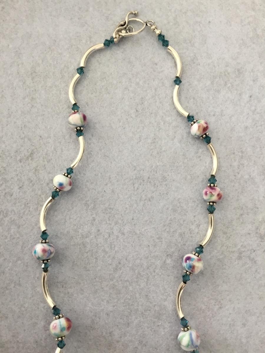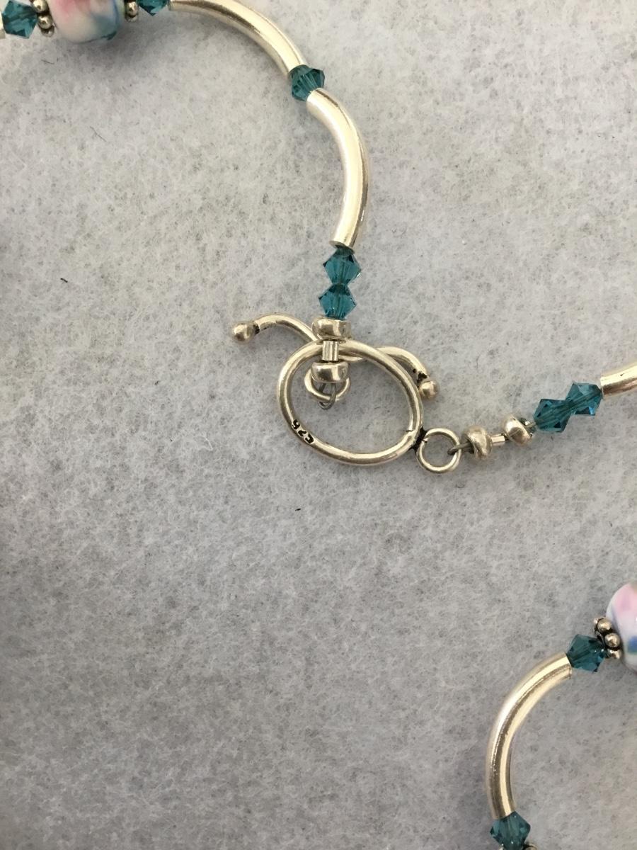Gorgeous, vintage 925 silver necklace with light blue, crystal and floral beaded necklace