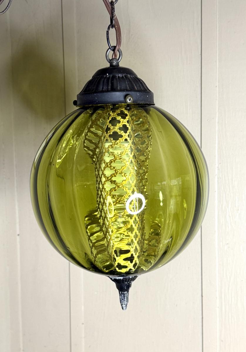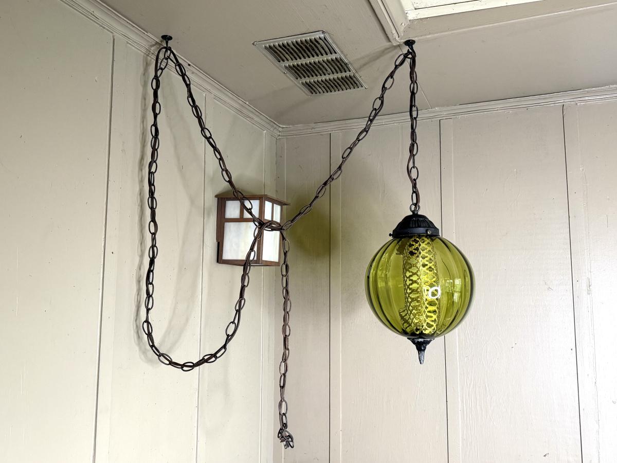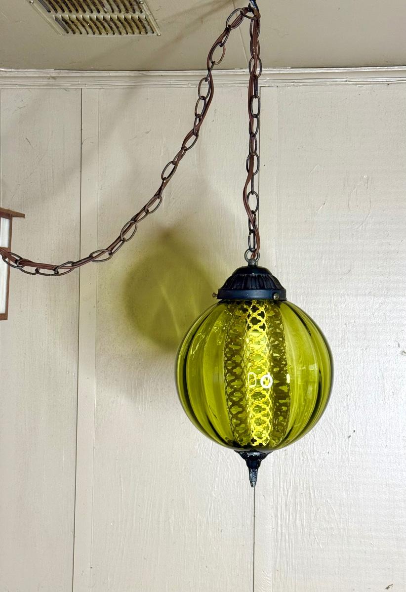 This light works as shown in the 4th picture. The green lamp is 15” tall from top to bottom and 9-1/2” wide in the middle. The chain/cord is 130” long.
