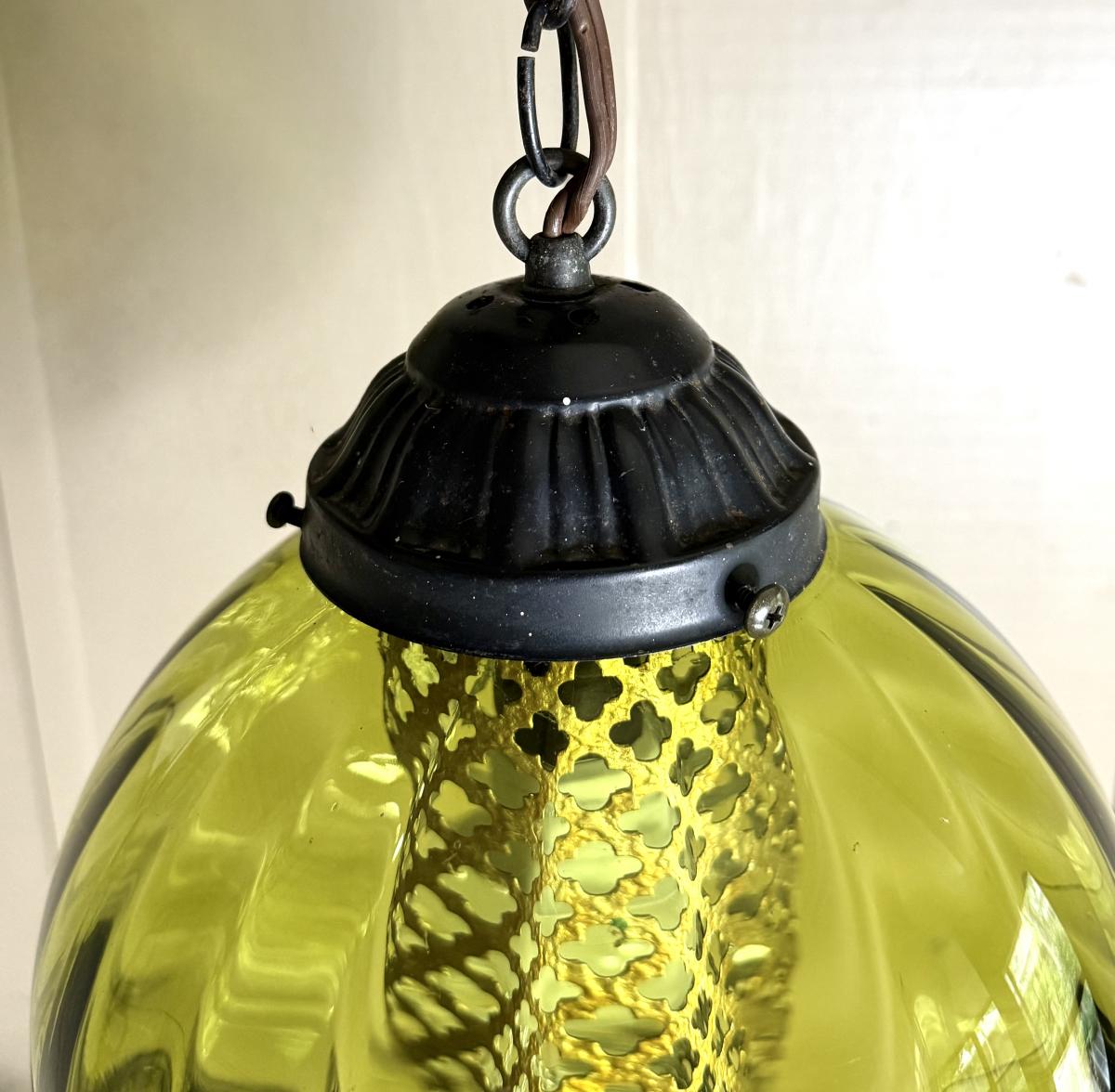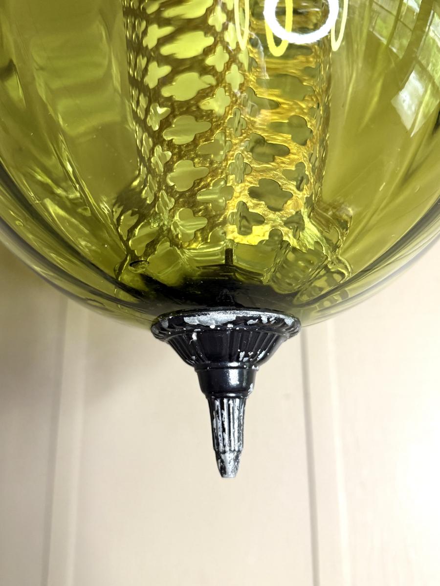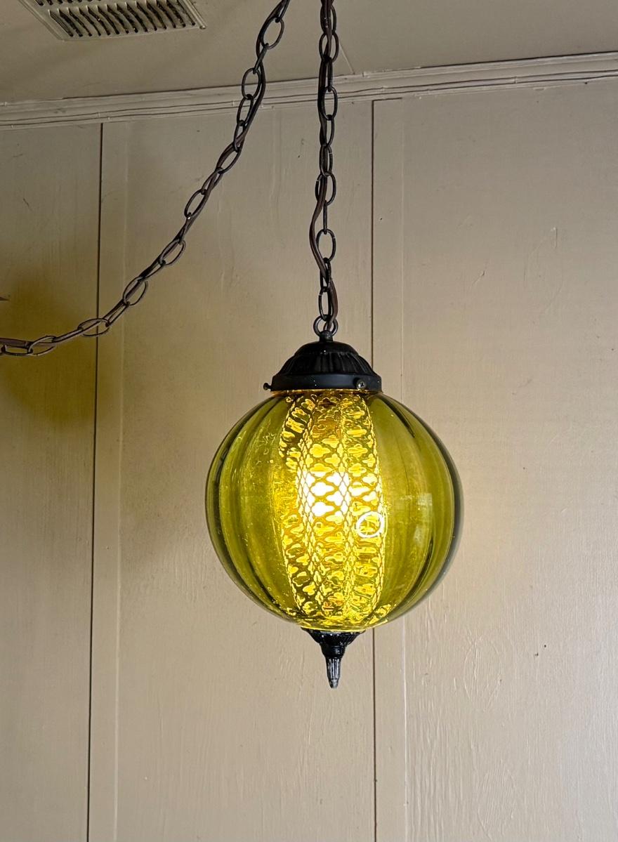 This light works as shown in the 4th picture. The green lamp is 15” tall from top to bottom and 9-1/2” wide in the middle. The chain/cord is 130” long.