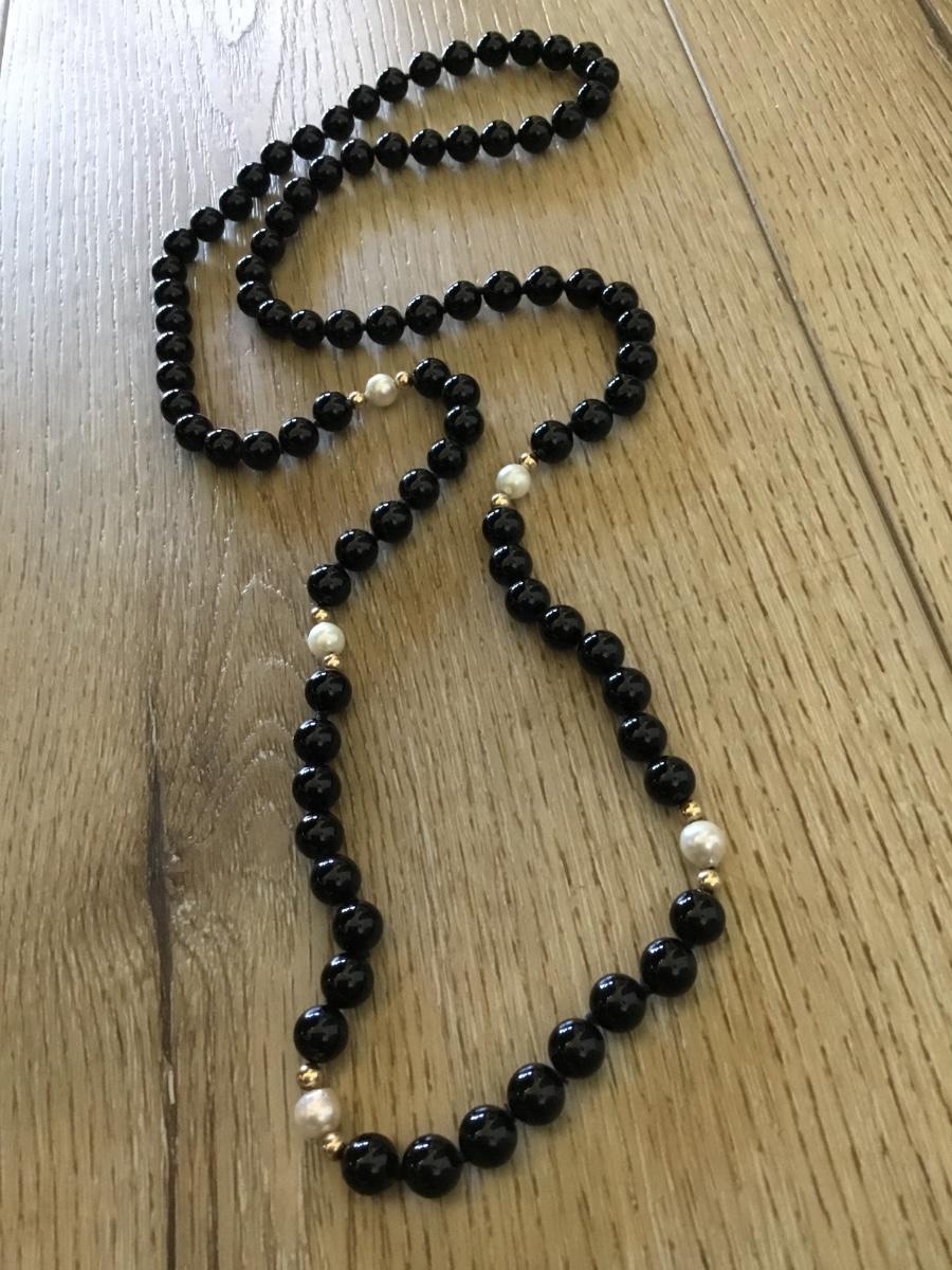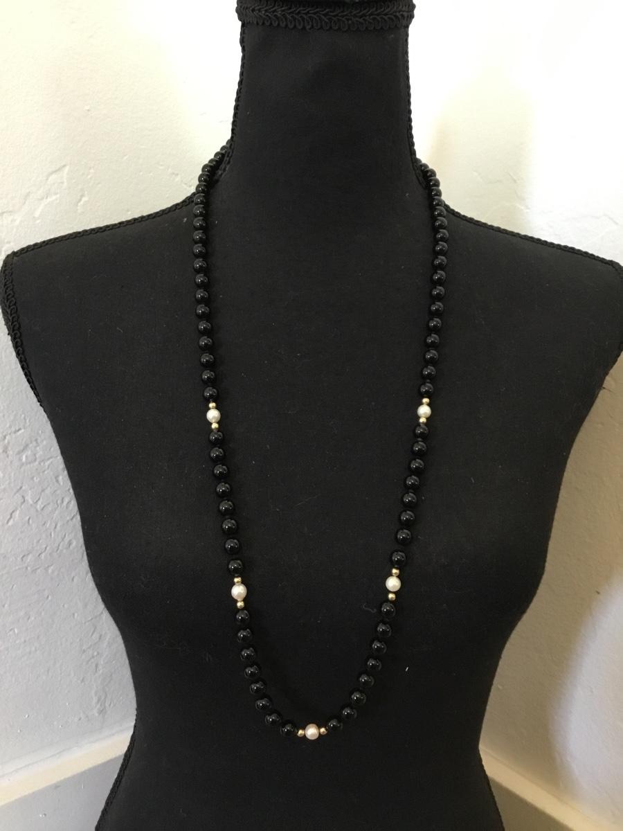 Gorgeous vintage, Blackstone or glass. Double knotted. Genuine pearl necklace very nice.