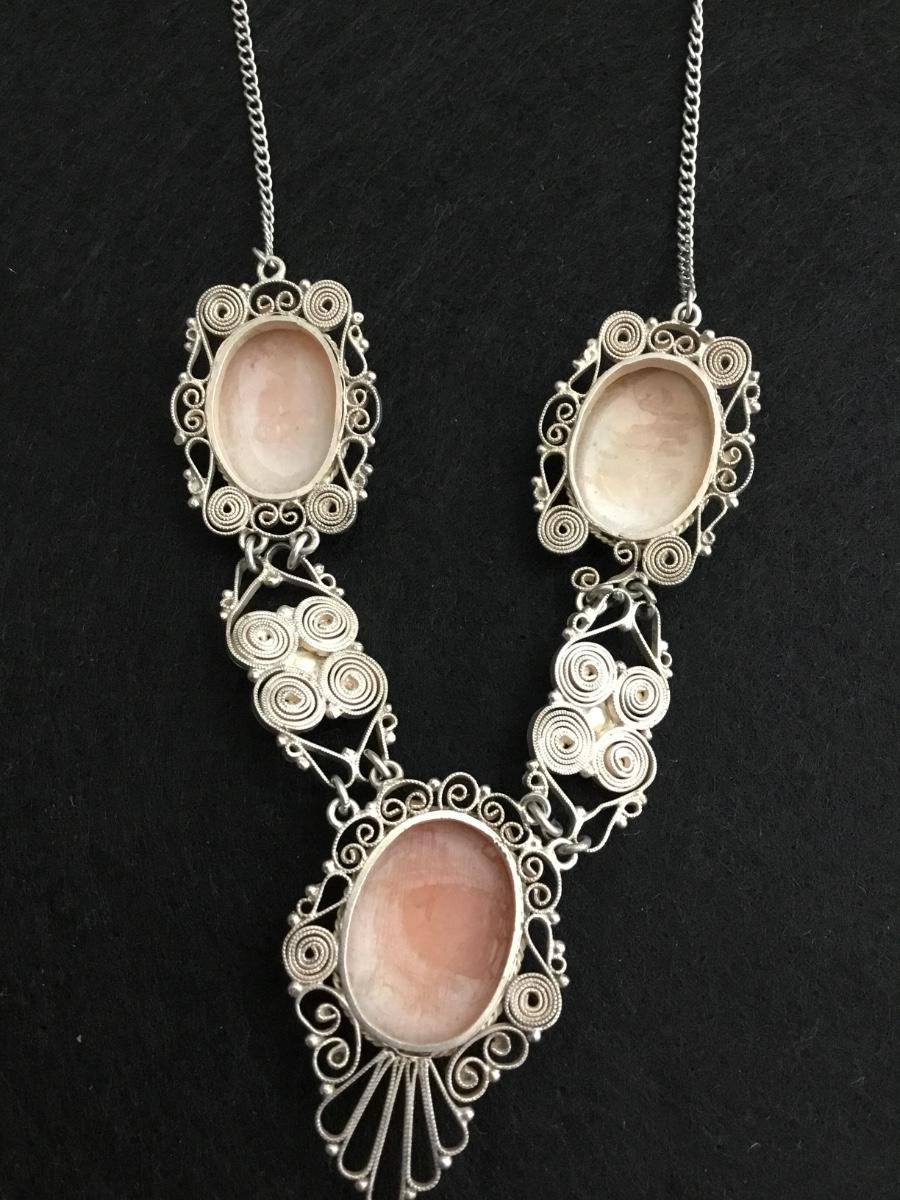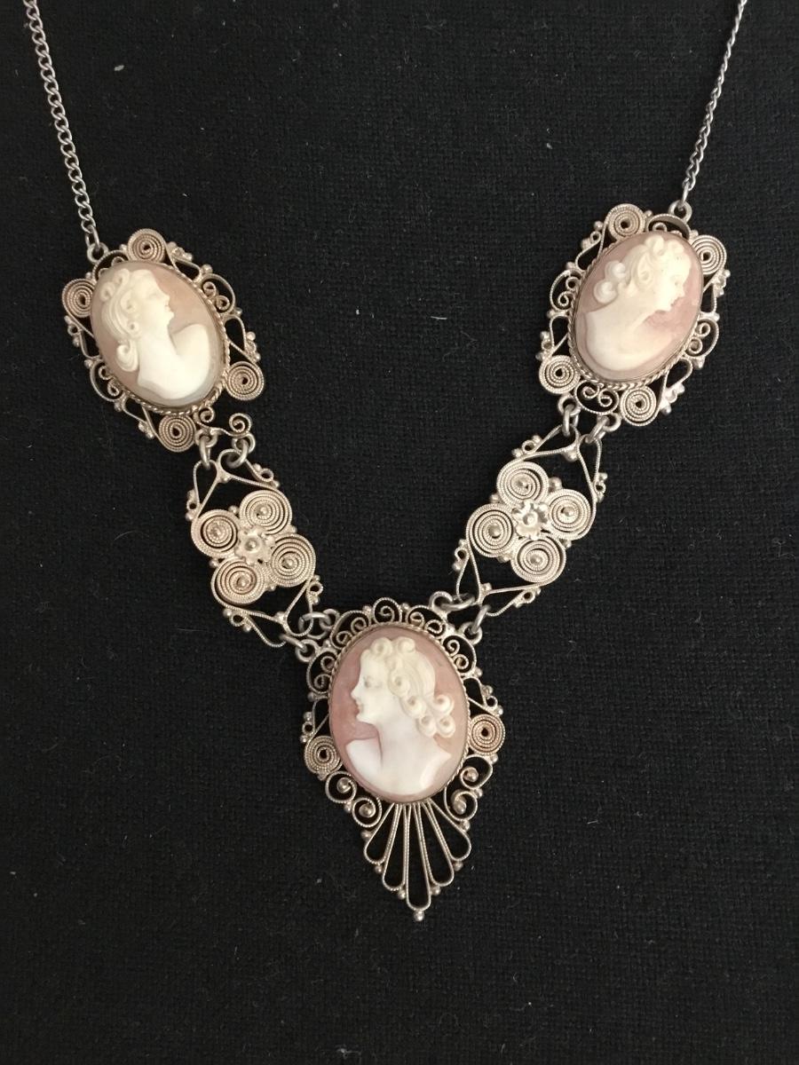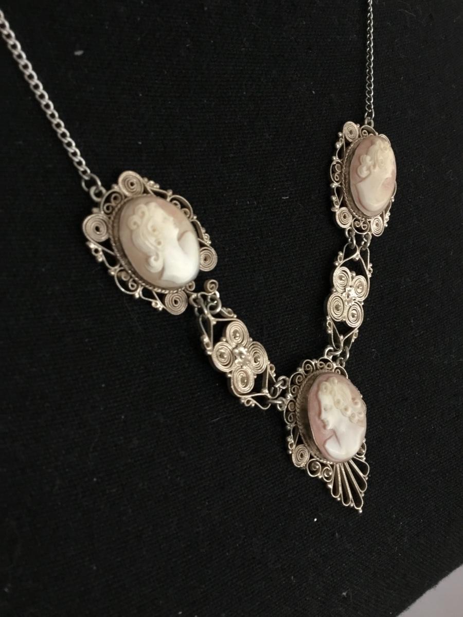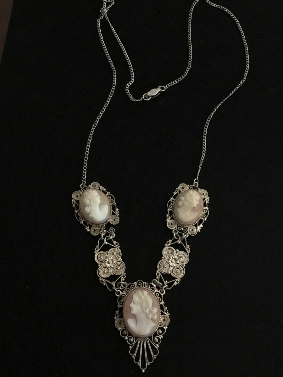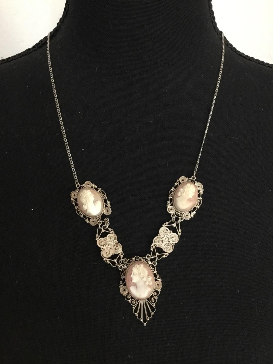 Gorgeous vintage, carved shell cameo , sterling, silver chain statement necklace