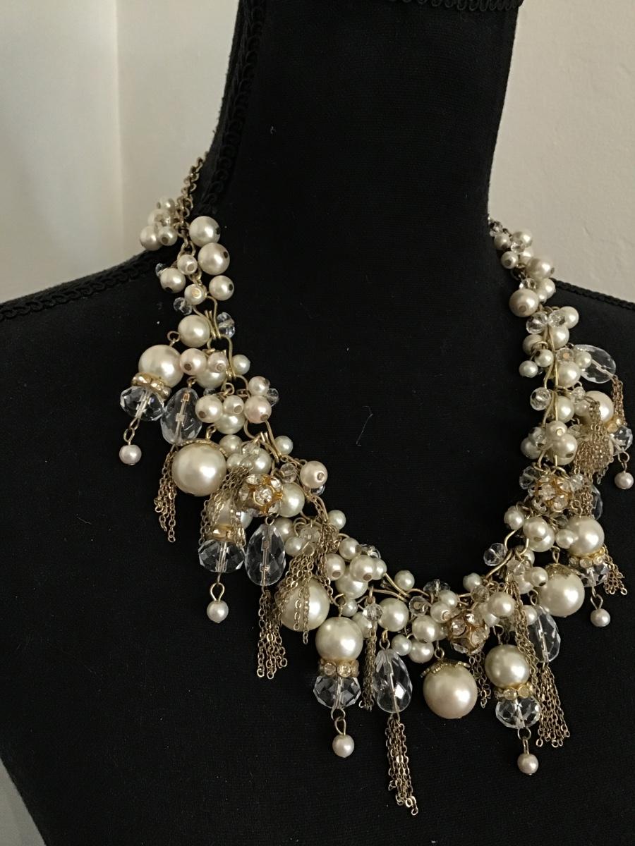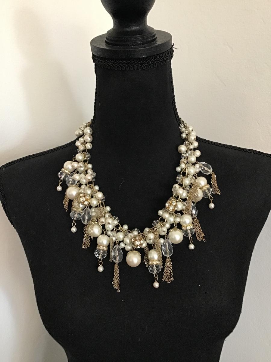 Gorgeous, vintage, gold tone, faux, pearl, crystal beard, statement, necklace
