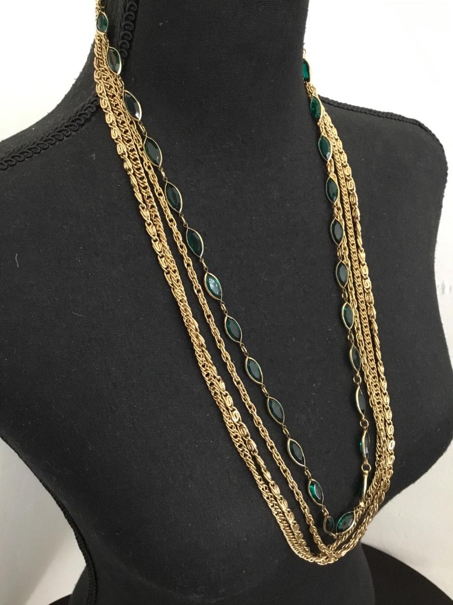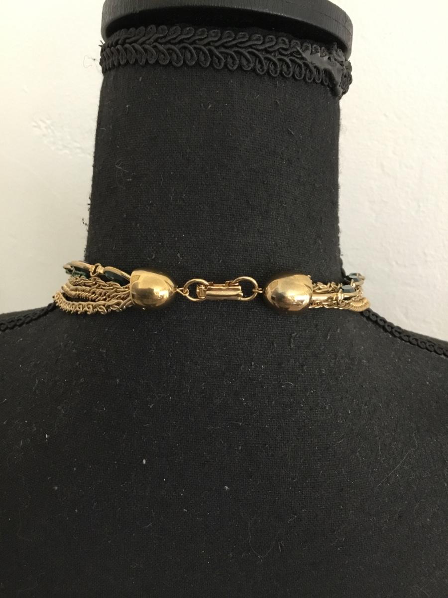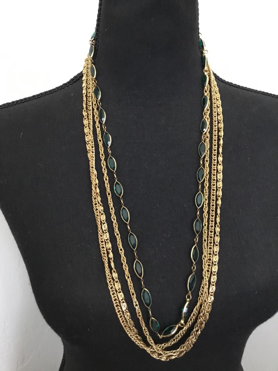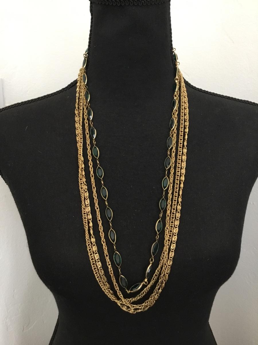 Gorgeous, vintage, gold, toned, faceted, green glass, multi strand, chain statement, necklace