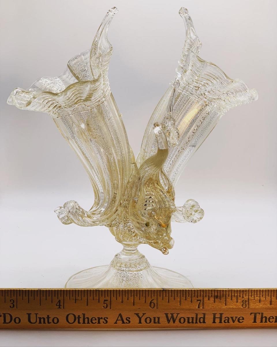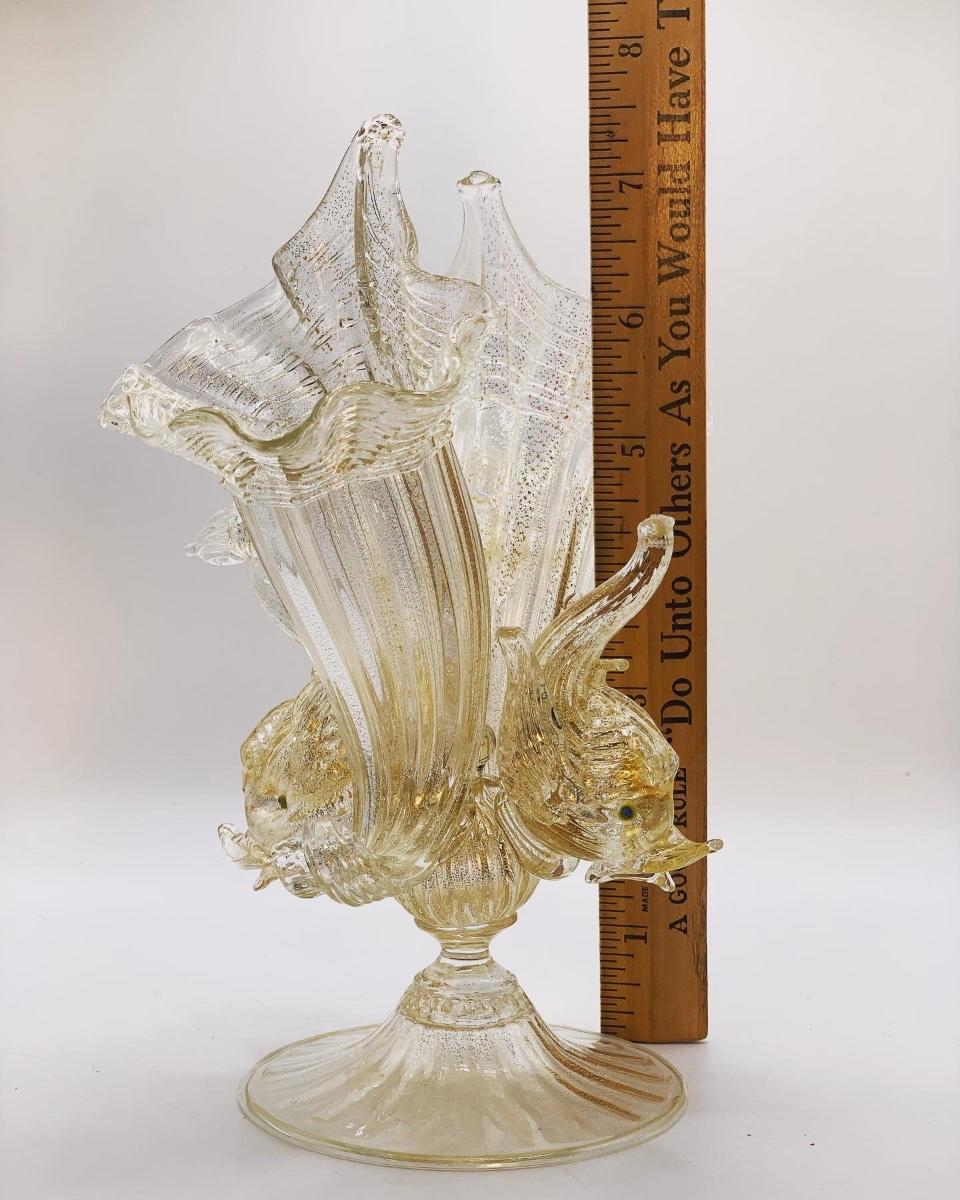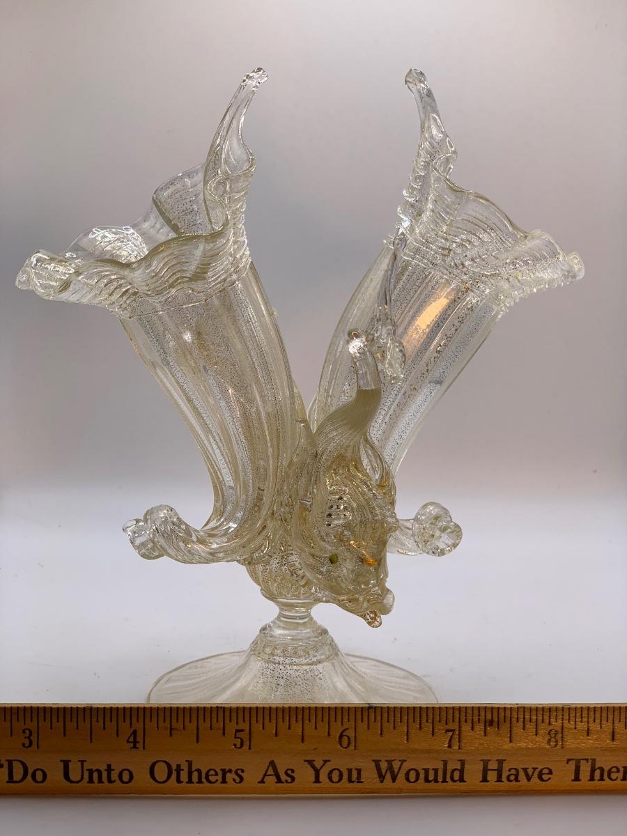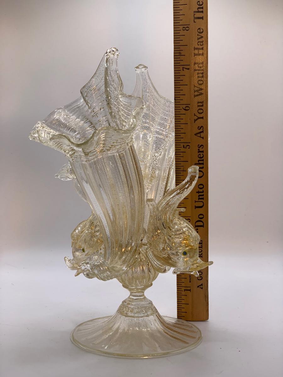 Gorgeous Vintage Murano Italian Art Glass Fish Stem Fisarmonica Vase w/ Gold Flecks