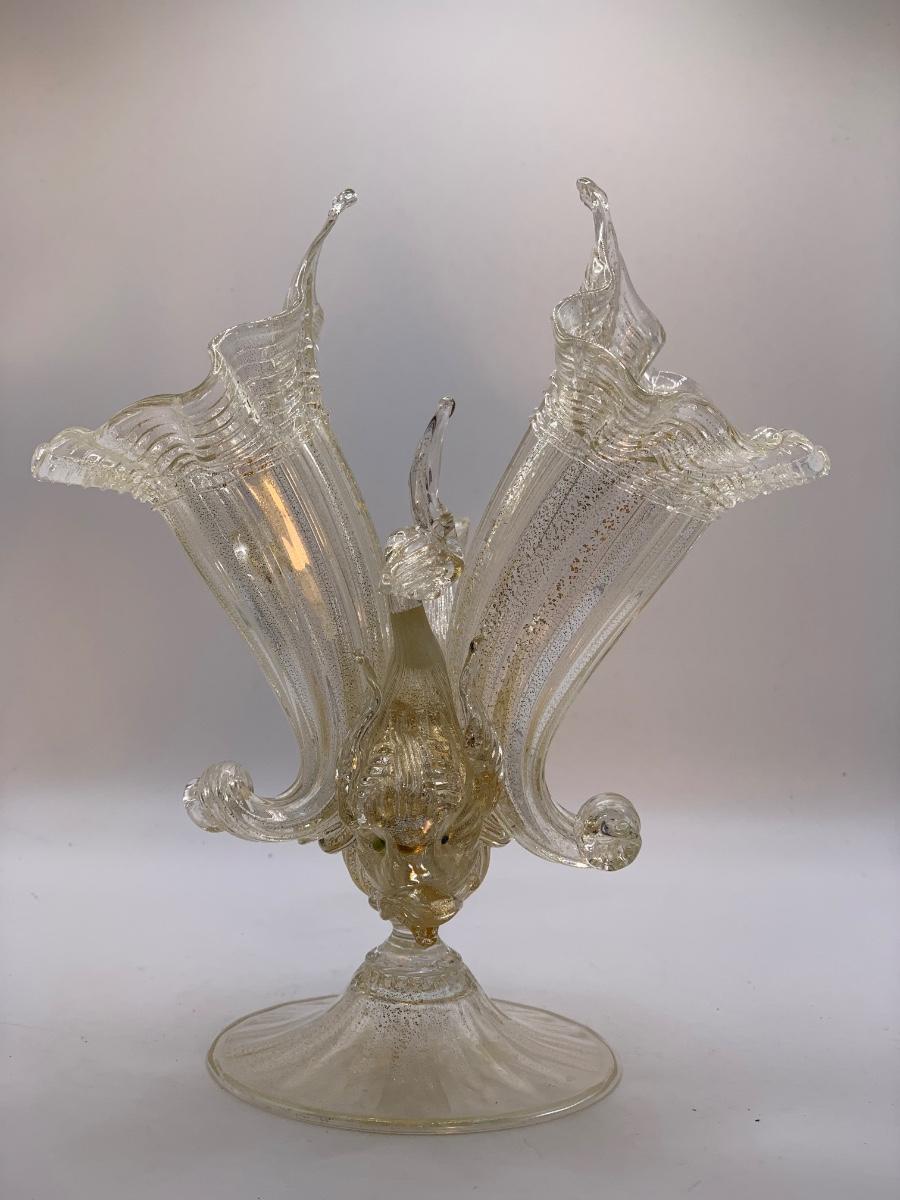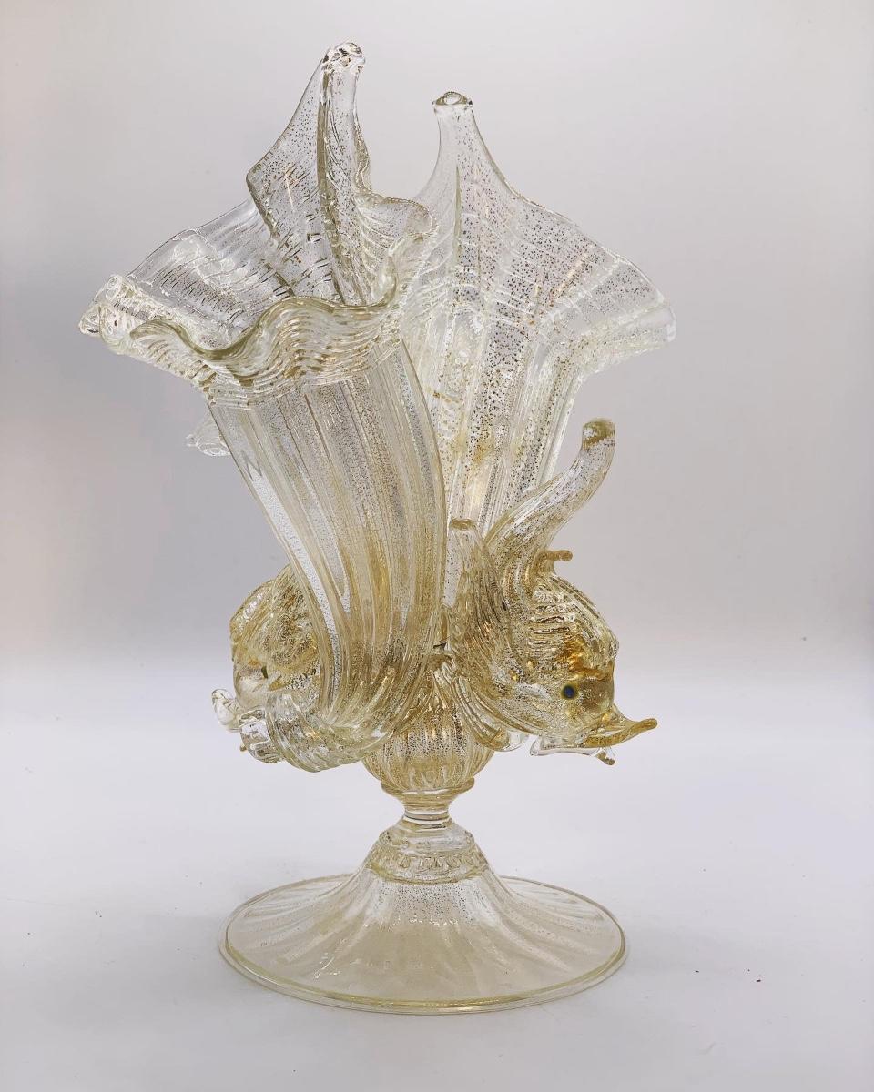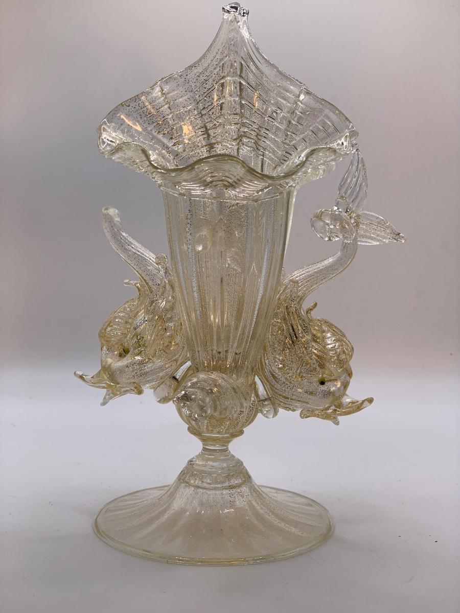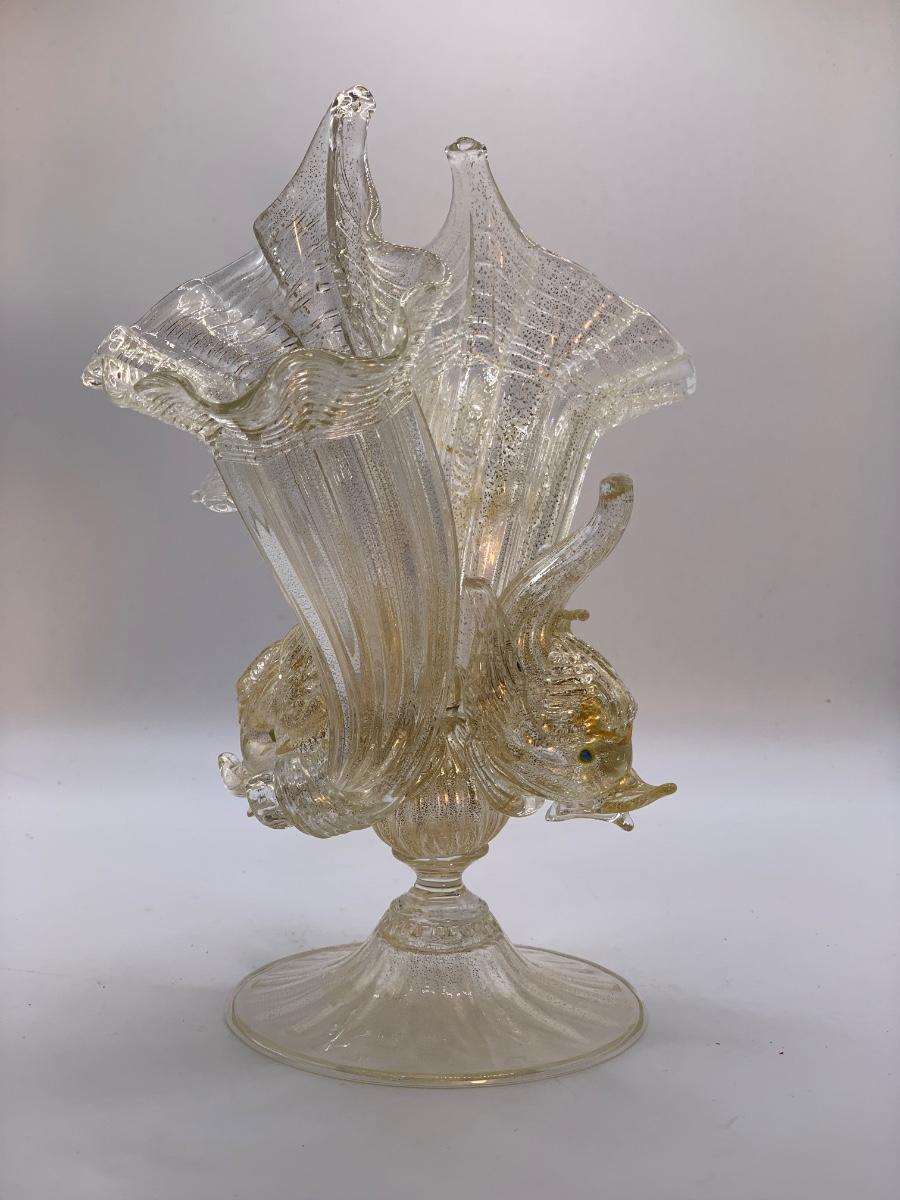 Gorgeous Vintage Murano Italian Art Glass Fish Stem Fisarmonica Vase w/ Gold Flecks