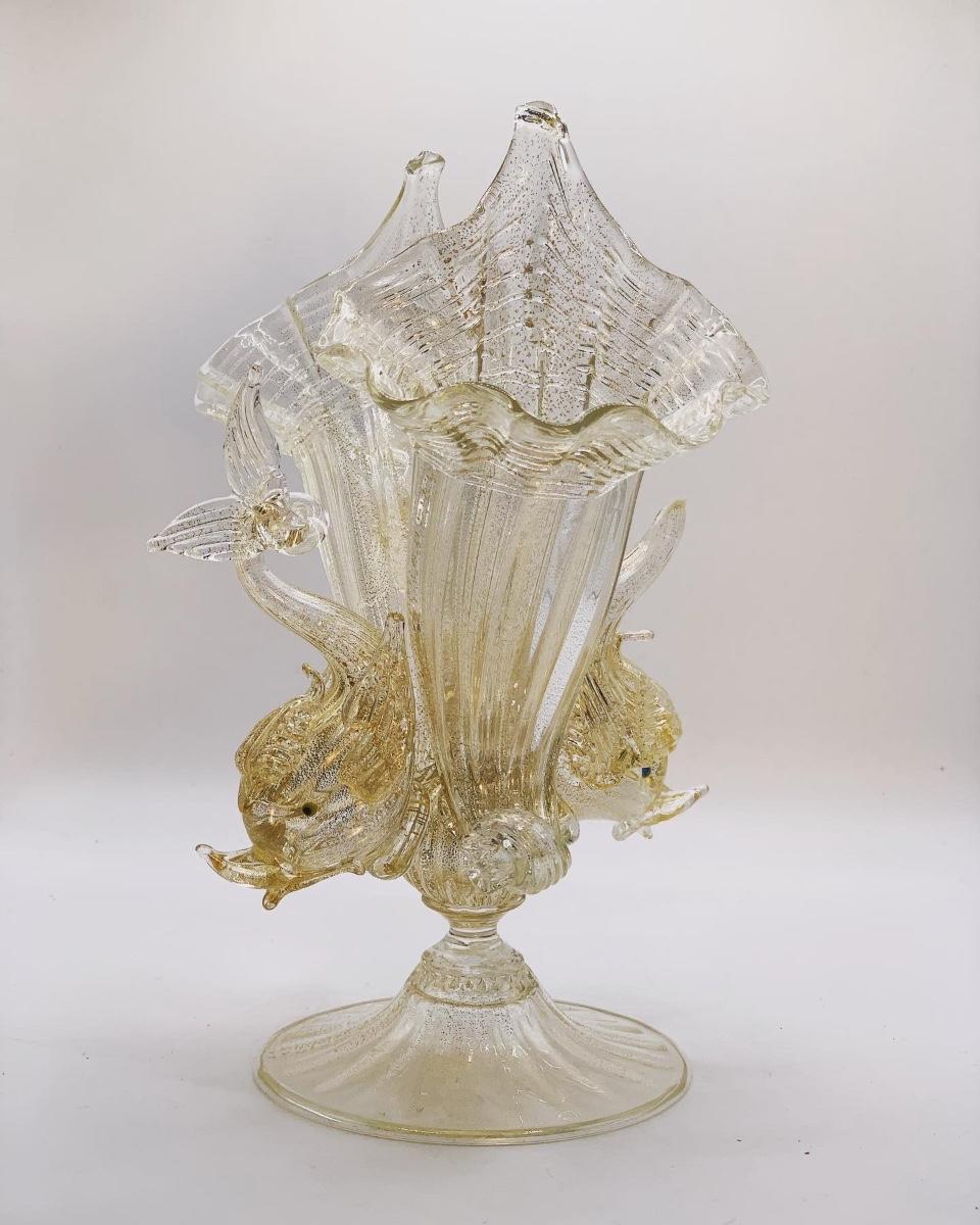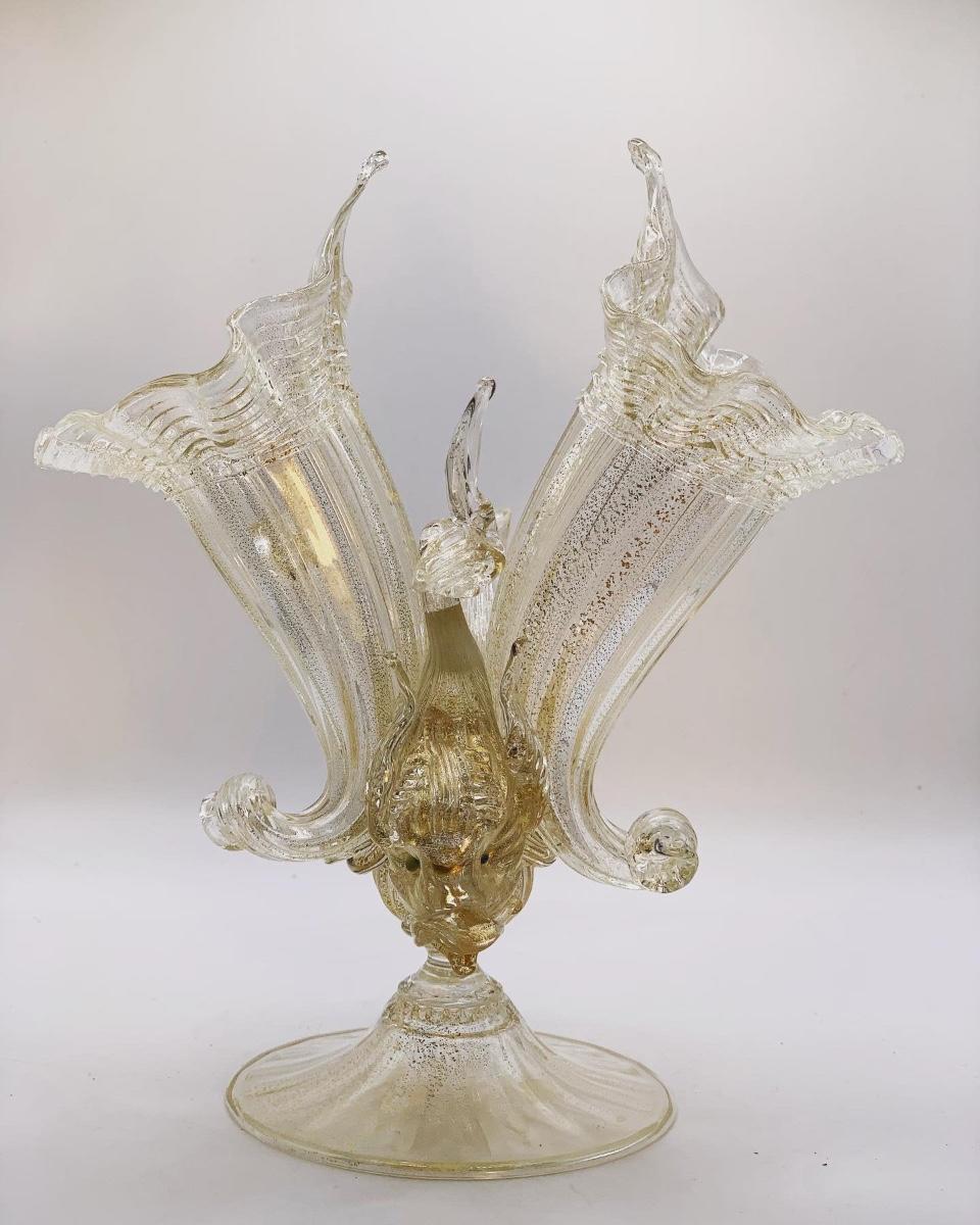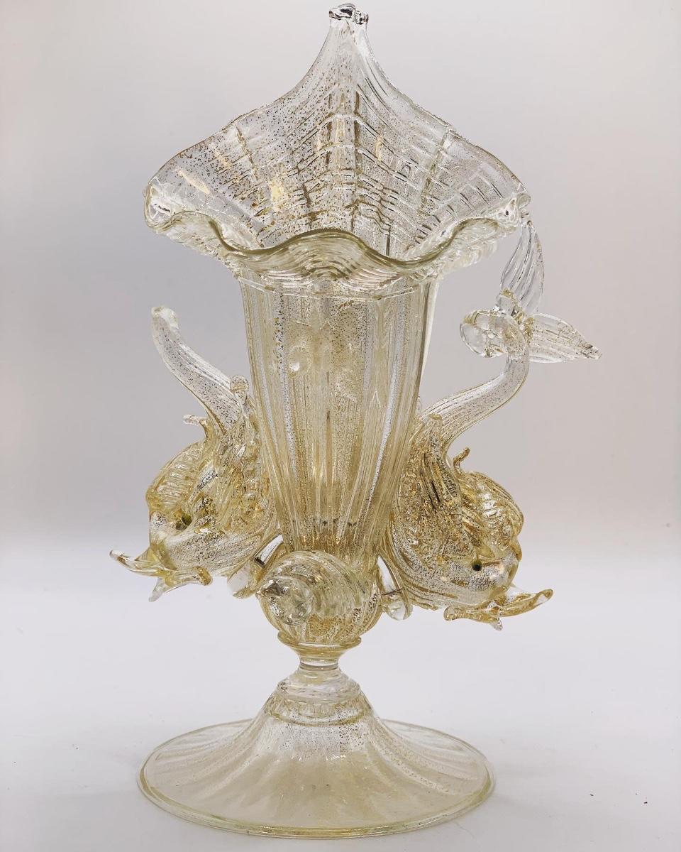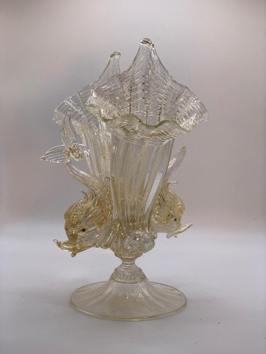 Gorgeous Vintage Murano Italian Art Glass Fish Stem Fisarmonica Vase w/ Gold Flecks