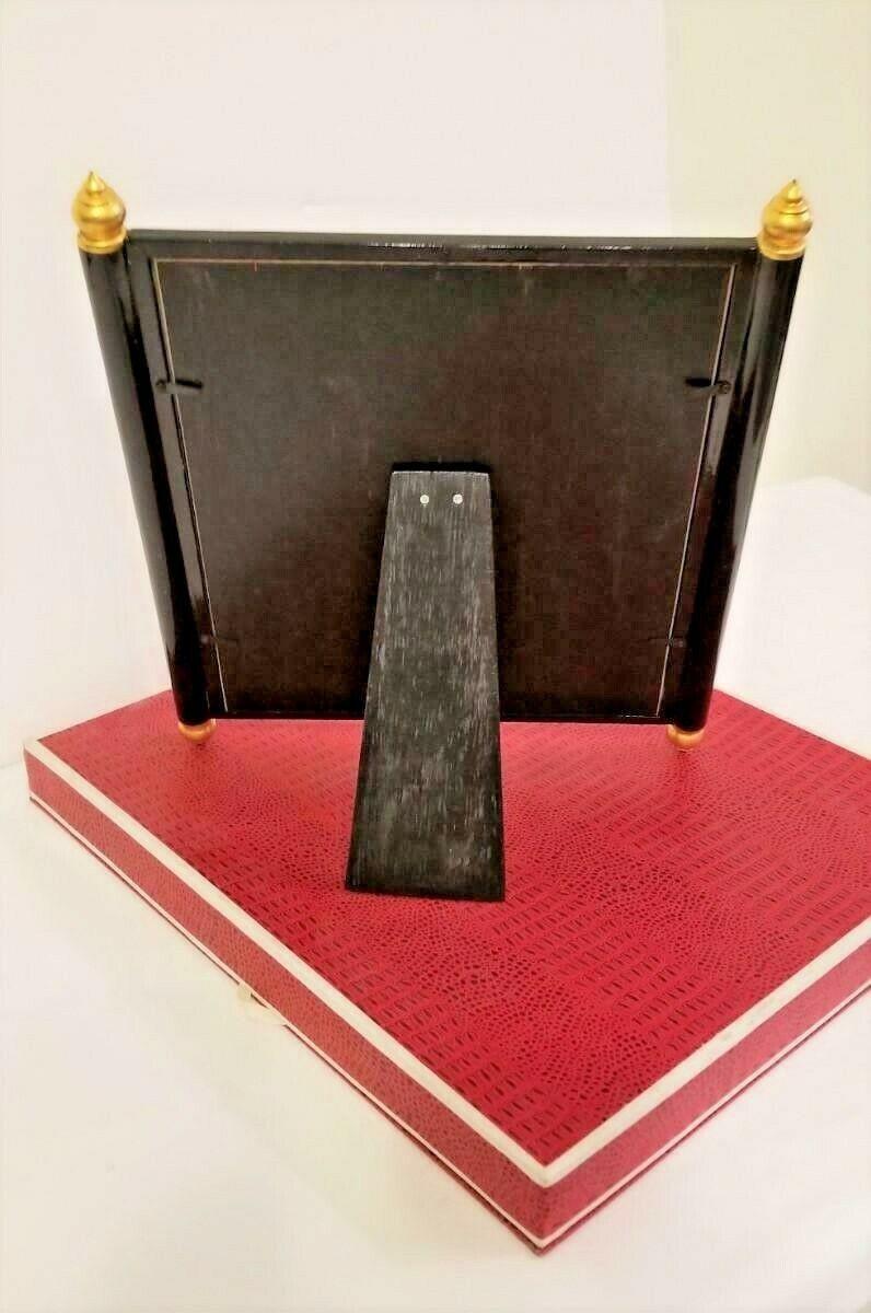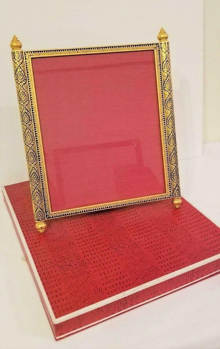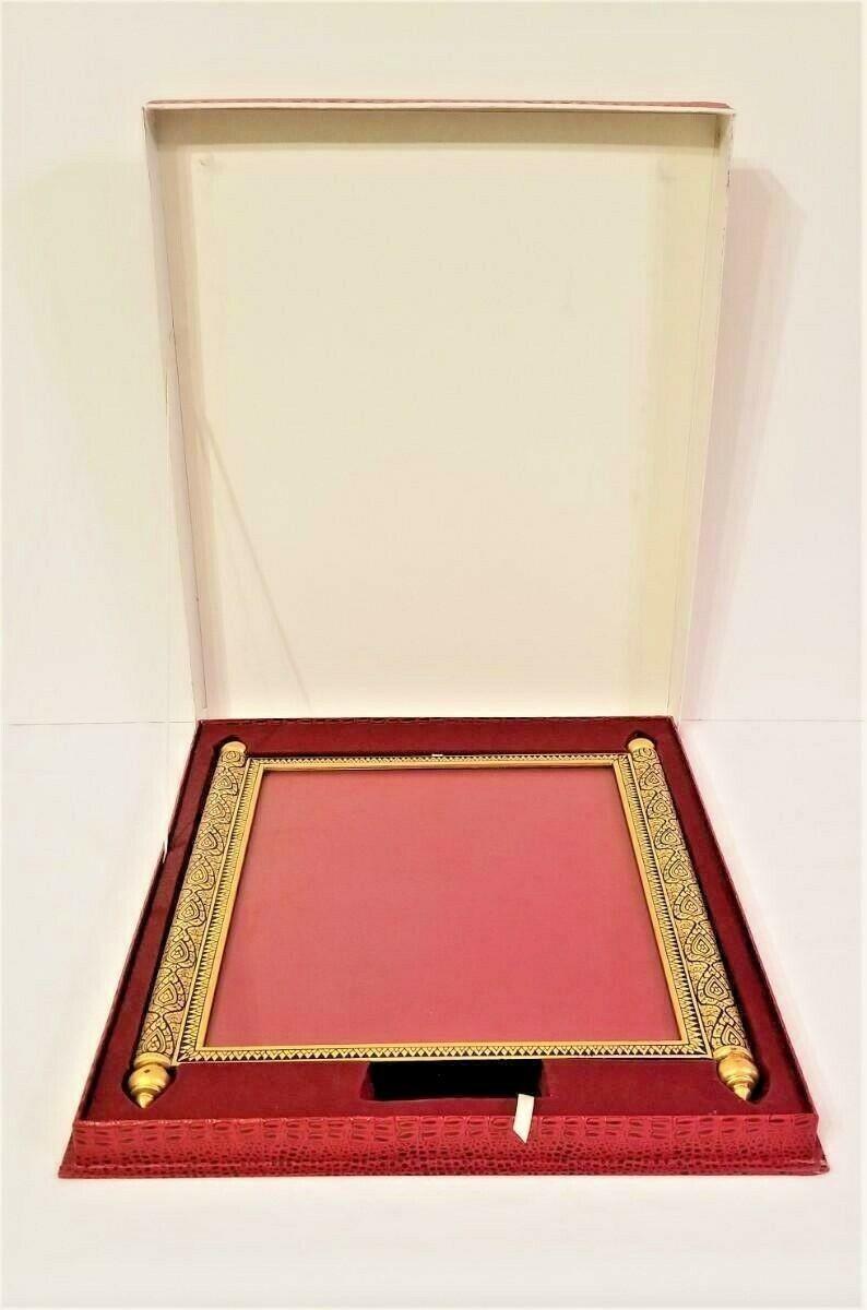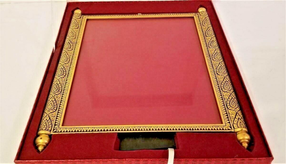 Never used still in box beautiful Moorish Design Photo Frame. Frame comes in original box. Photo opening is about 9.25" x 10.25". Total is 12" across and 14.5" tall. Moorish Design - wooden lacquer. Very substantial weighing over 4 pounds