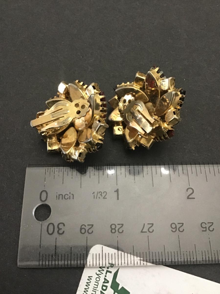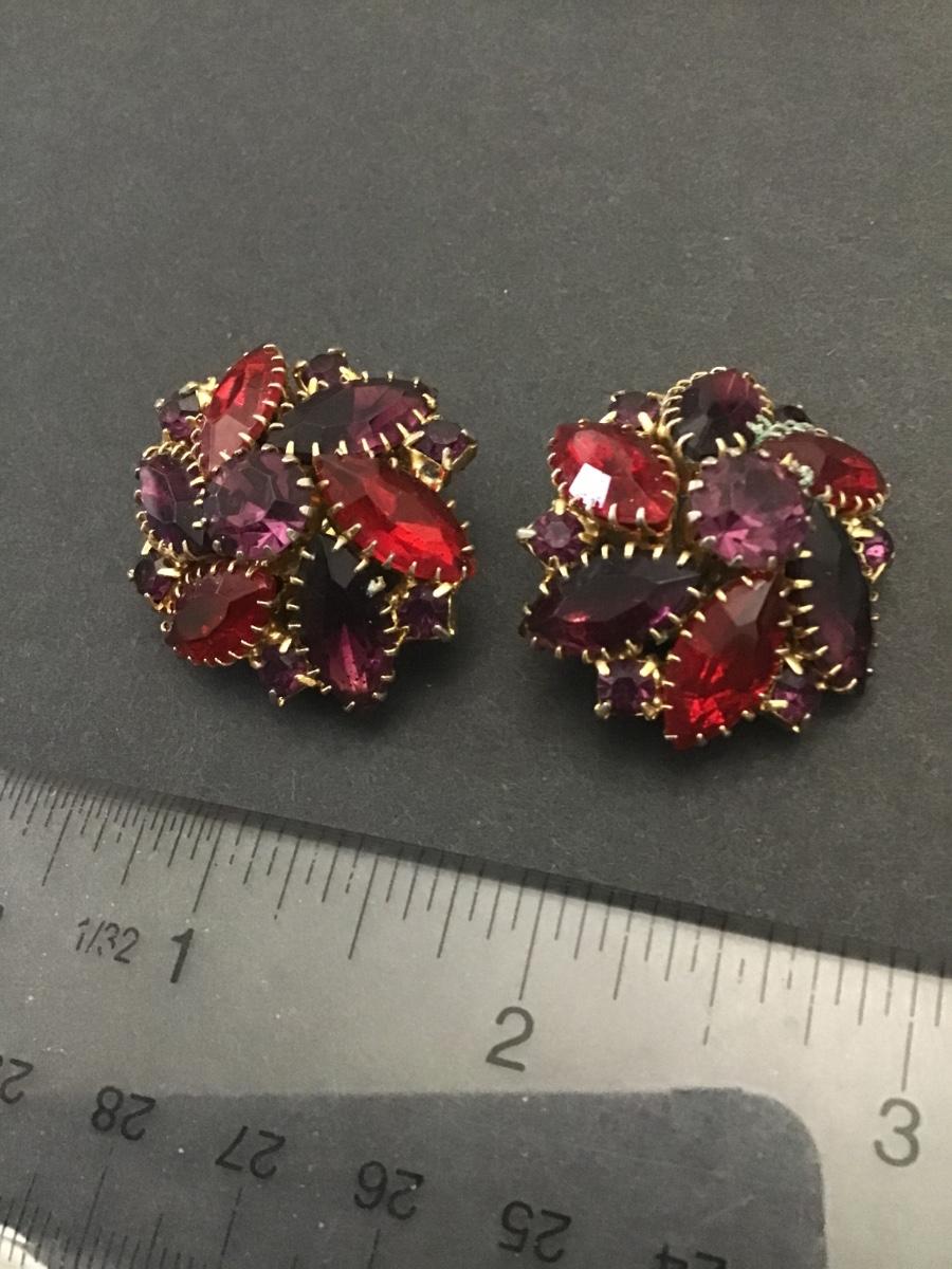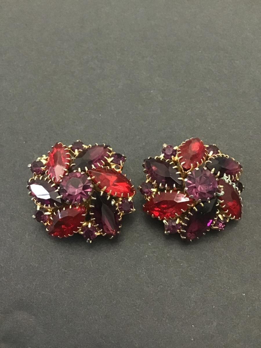 Gorgeous, vintage rhinestone cluster clip on earrings, red and purple stones gold toned