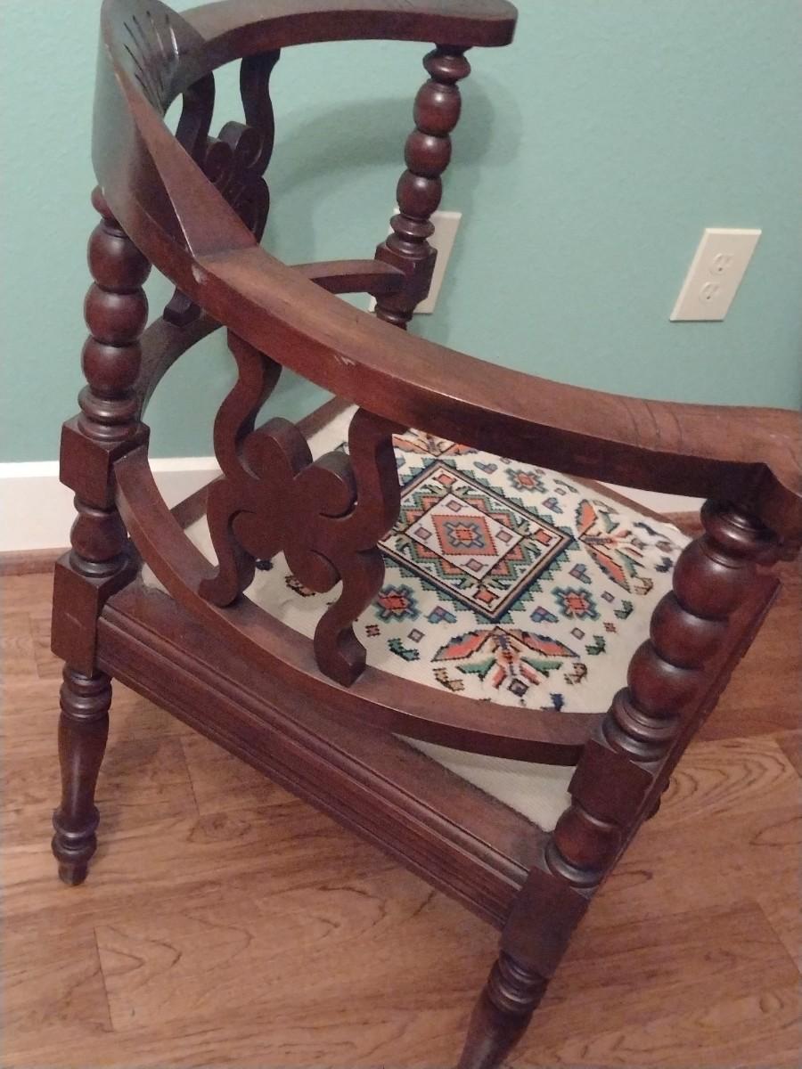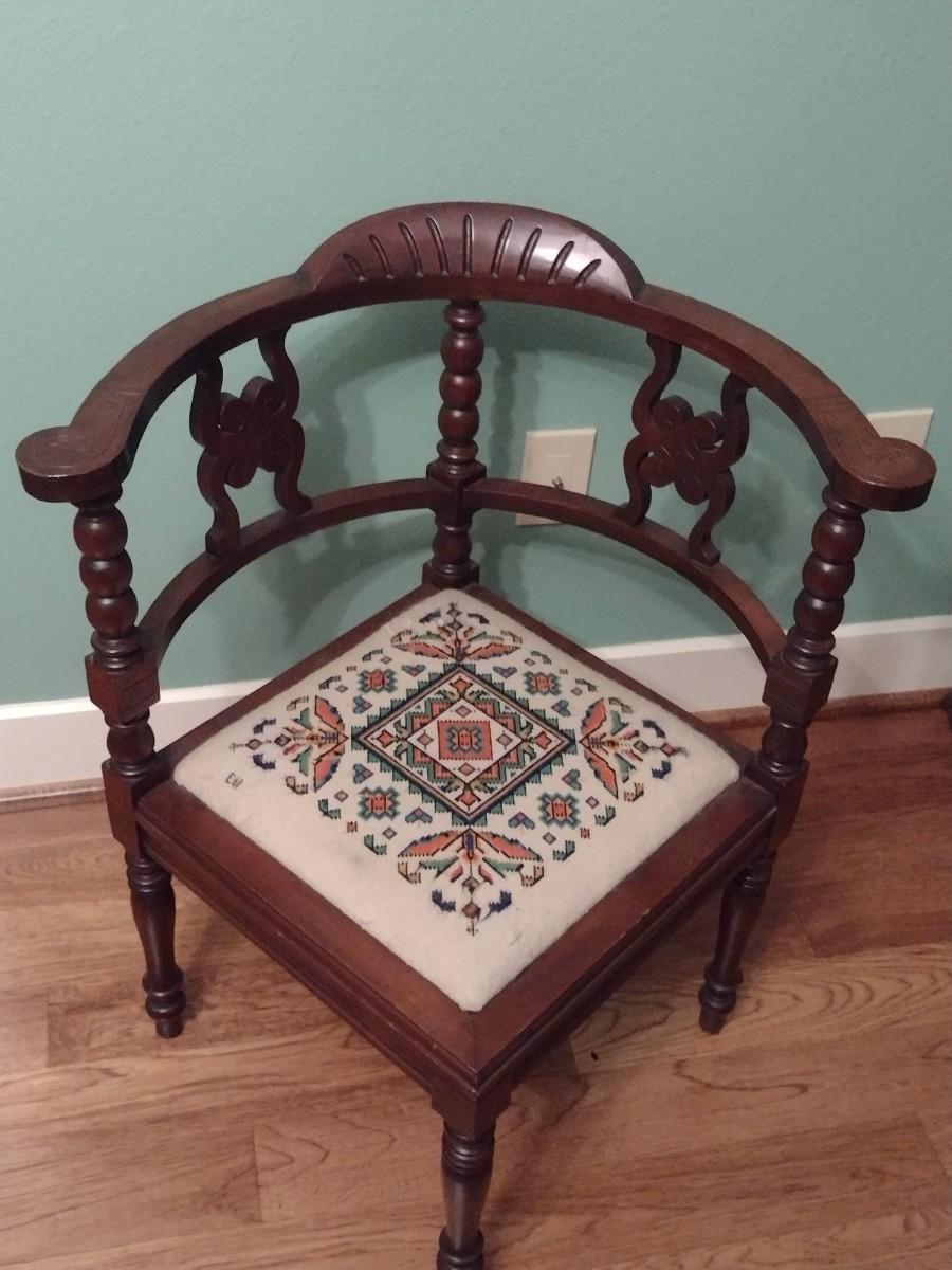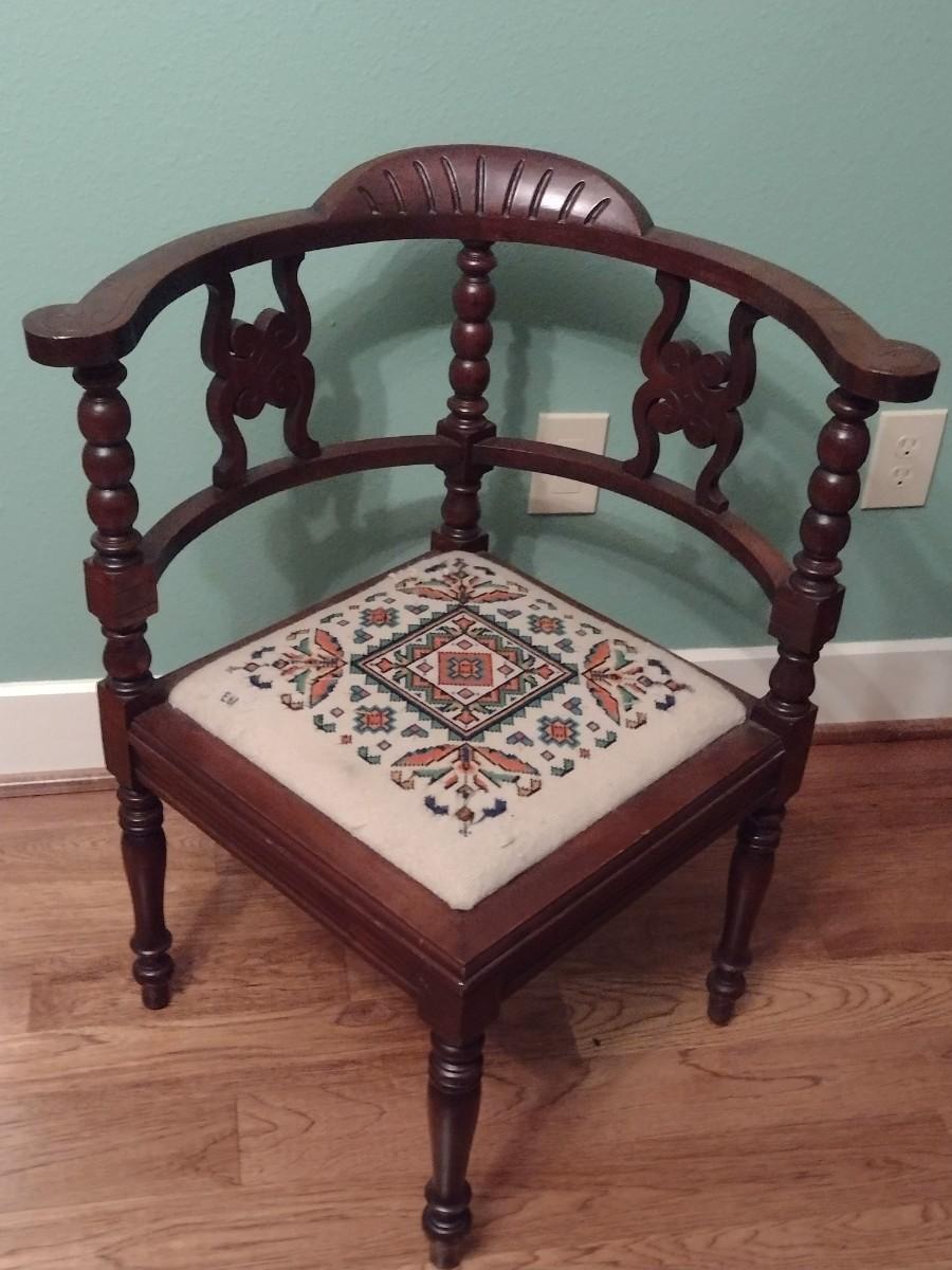 Gorgeous Vintage Solid Wood Framed Corner Chair with Needlework Cushioned Seat