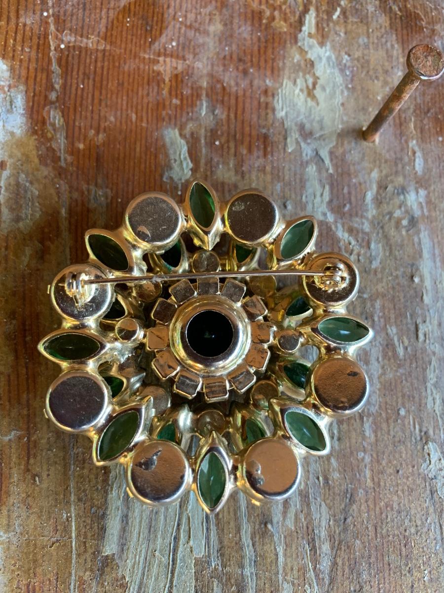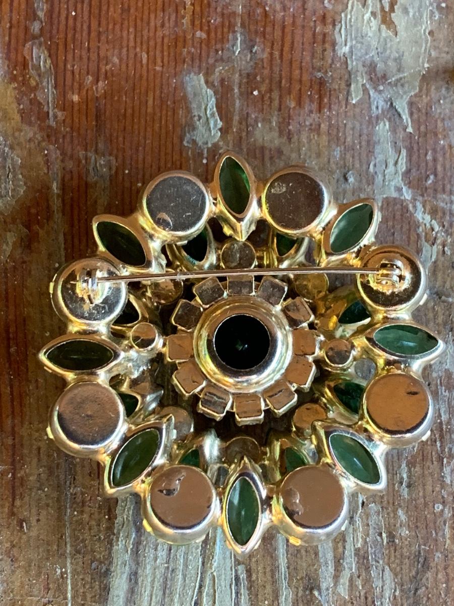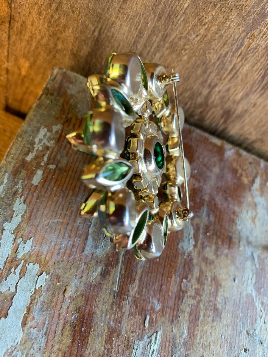 Swarovski vibrant hues of green with heavy setting, well made piece, suspect this is an unsigned designed piece based on our research.