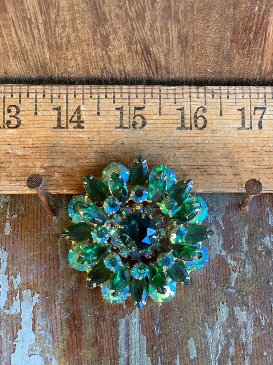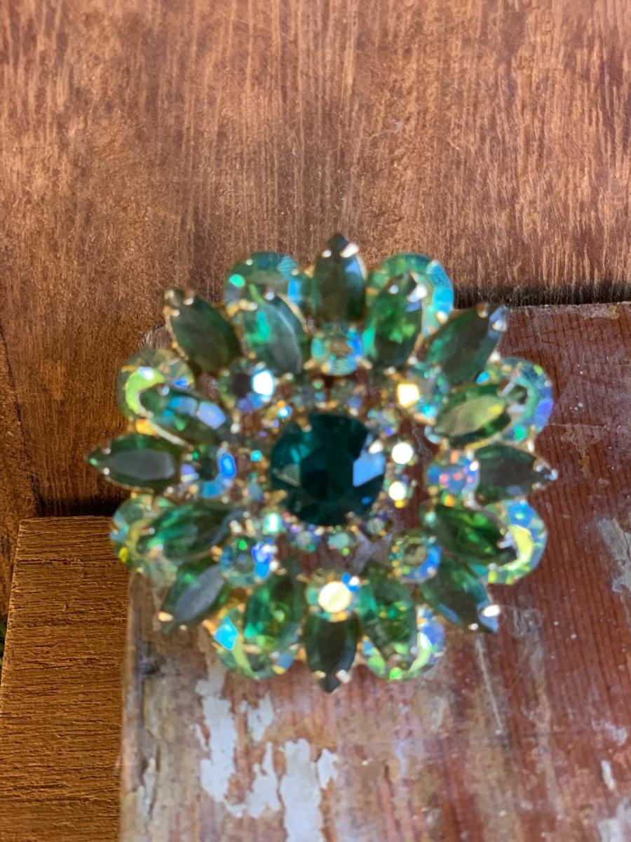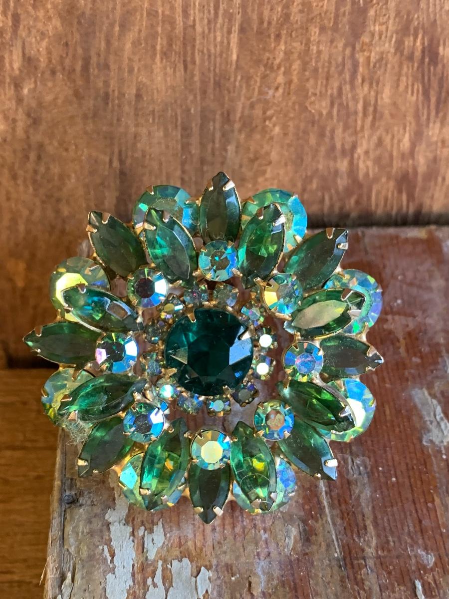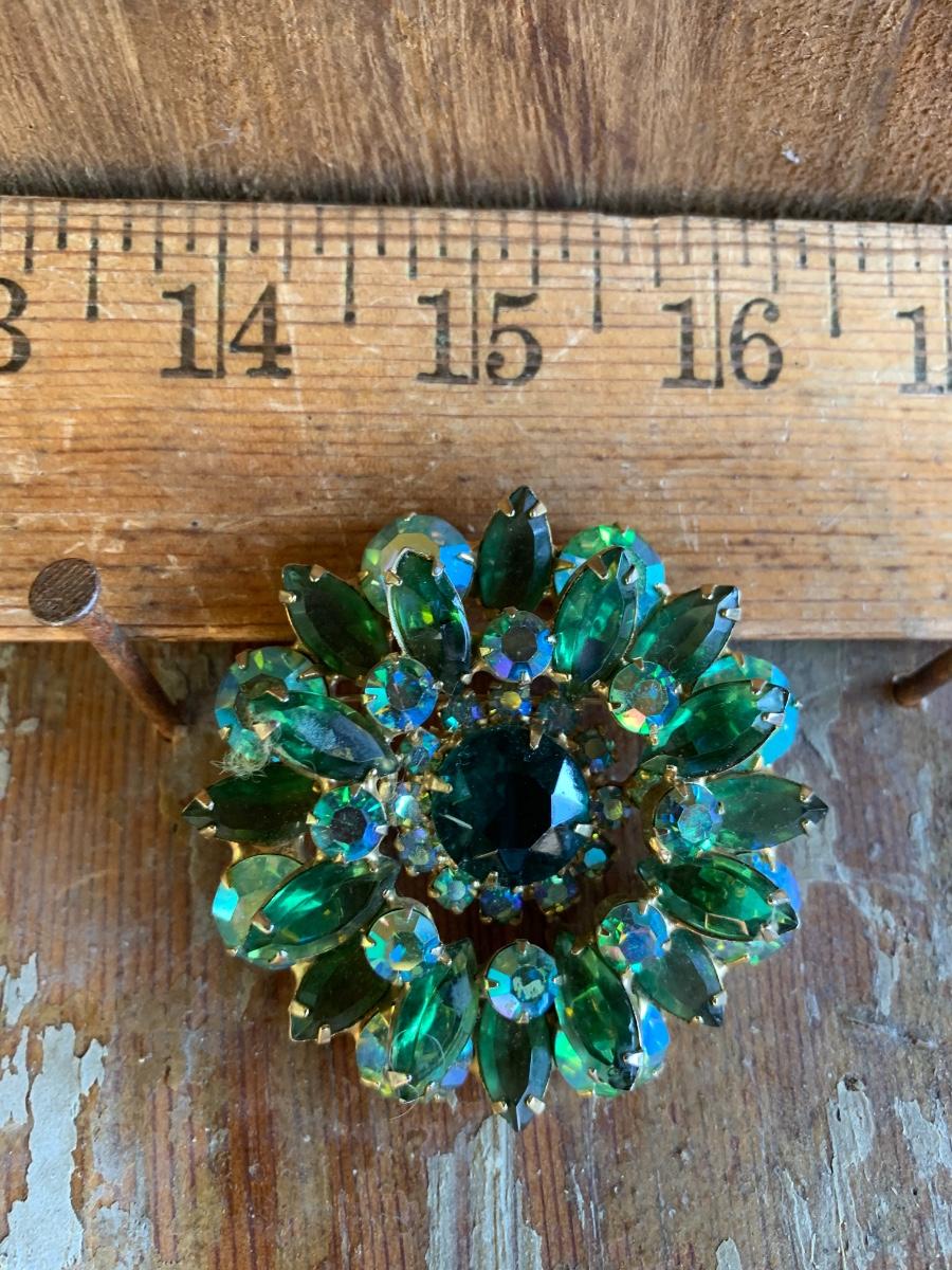 Swarovski vibrant hues of green with heavy setting, well made piece, suspect this is an unsigned designed piece based on our research.