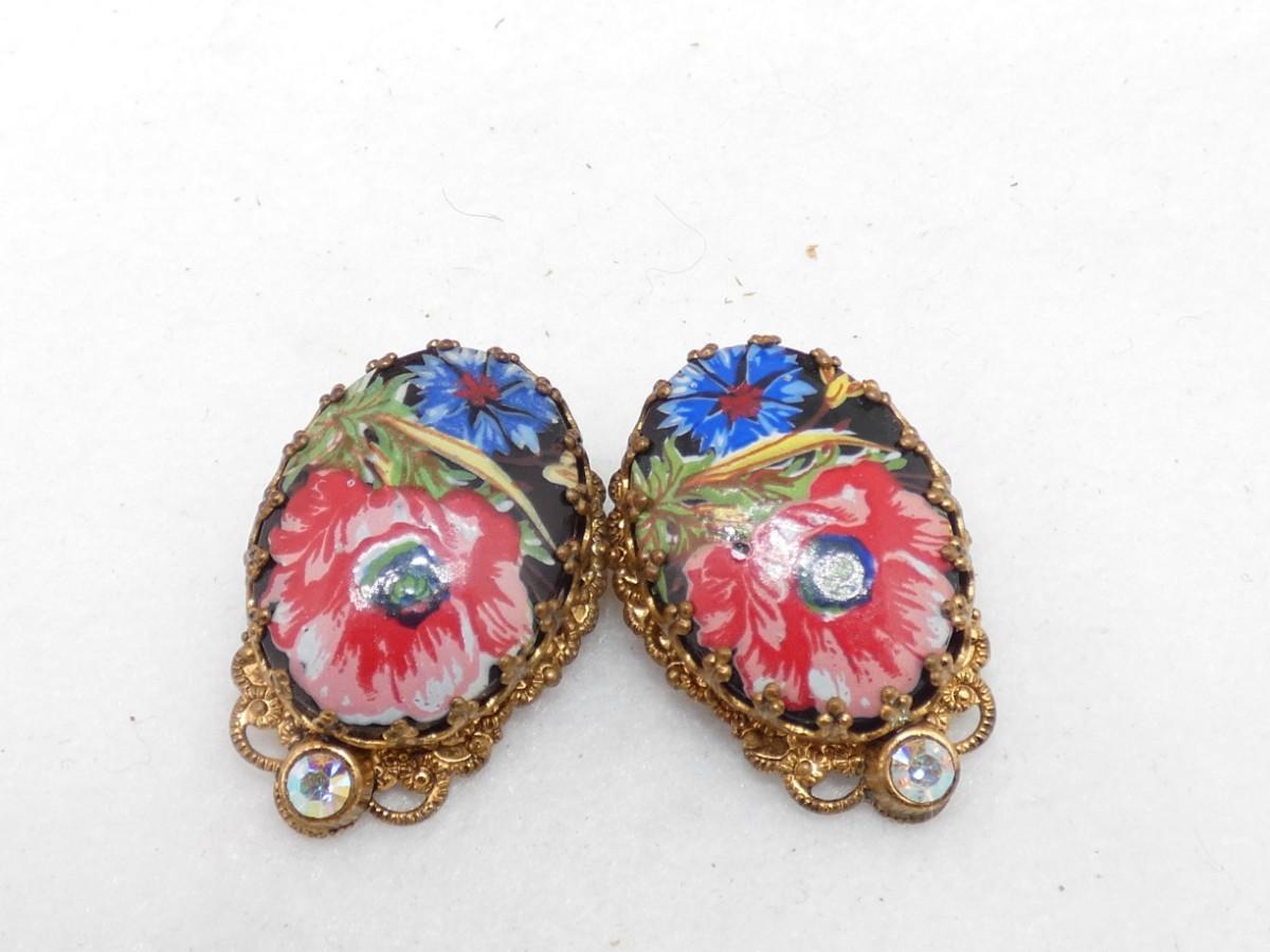 Gorgeous West Germany  Filagree Hand Painted Porcelain Clip Earrings