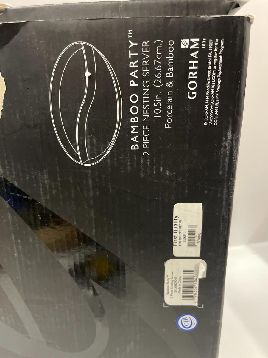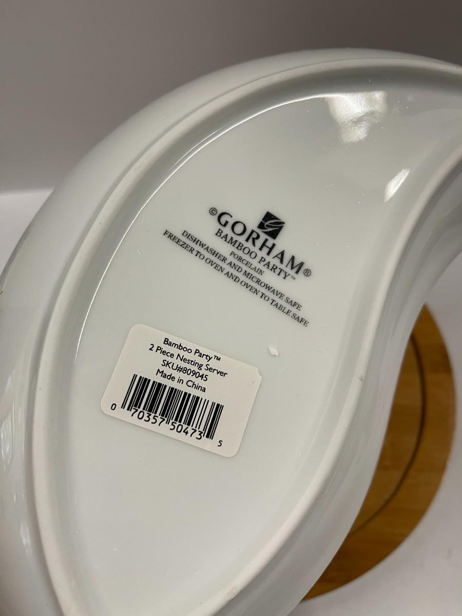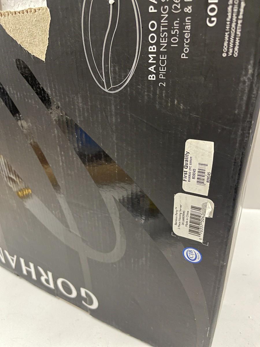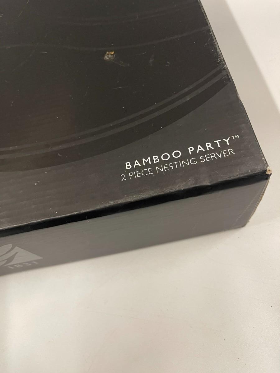 Gorham Bamboo Party 2 piece nesting serving dishes. Two white nesting dishes with bamboo undertray. 11". In original box but box shows damage. Set is unused.