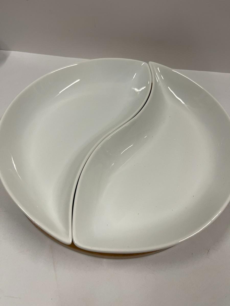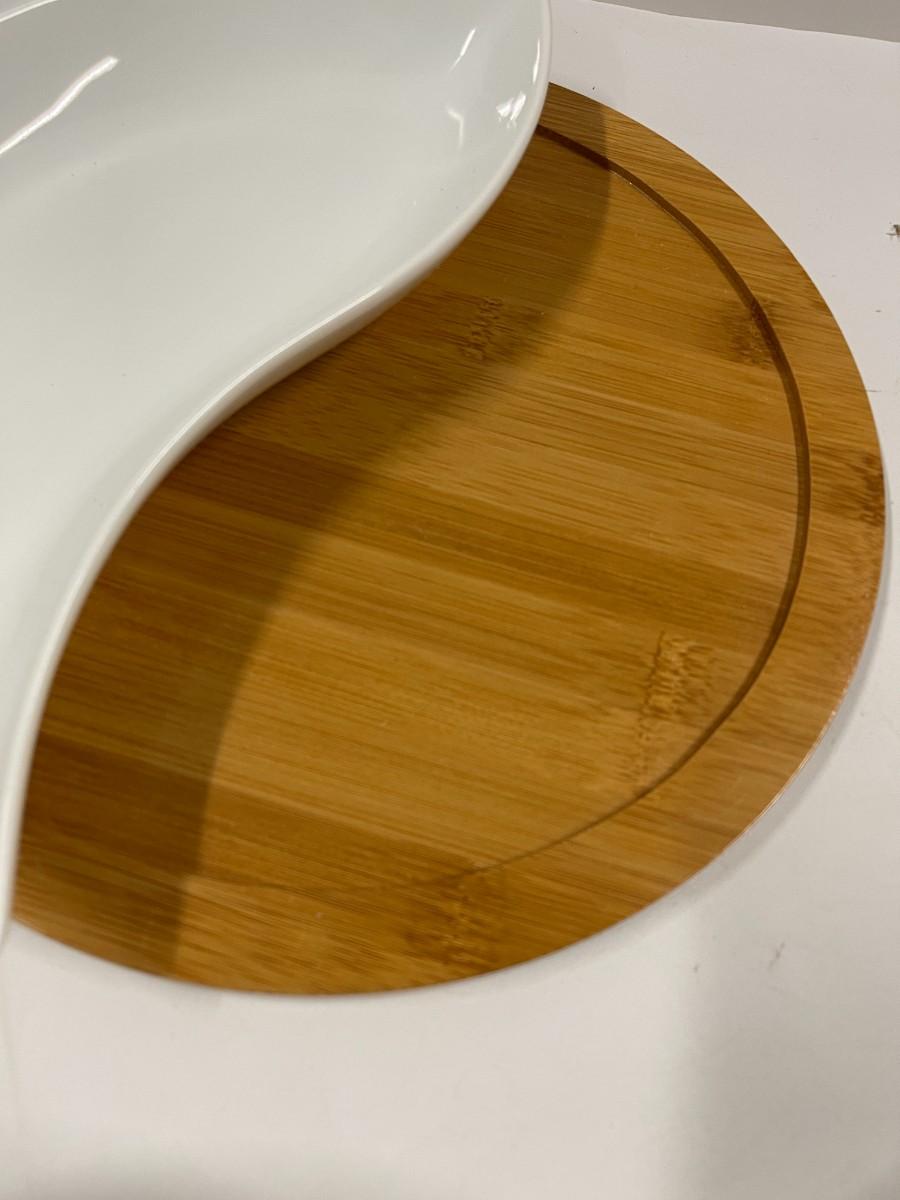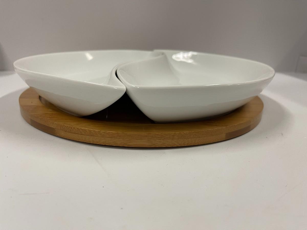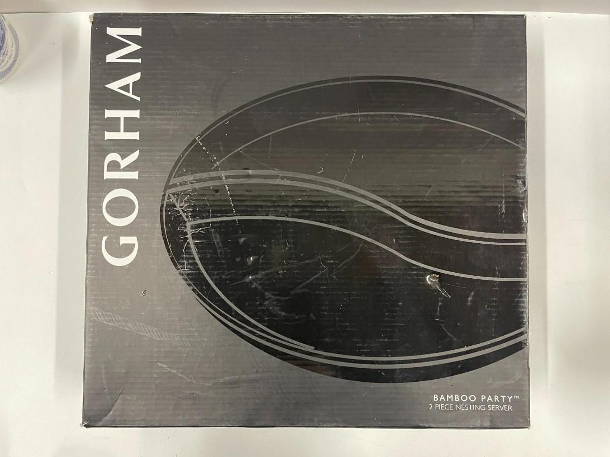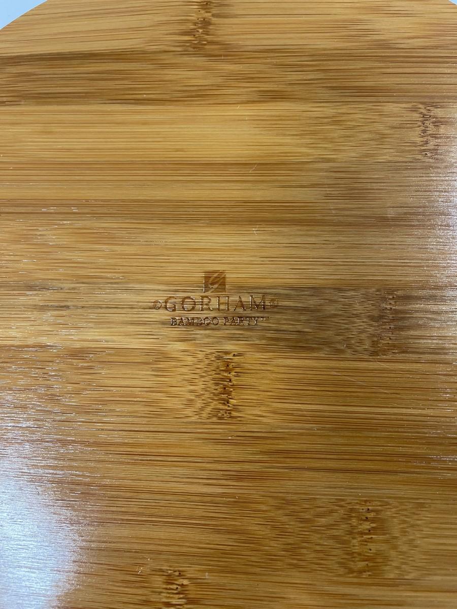 Gorham Bamboo Party 2 piece nesting serving dishes. Two white nesting dishes with bamboo undertray. 11". In original box but box shows damage. Set is unused.