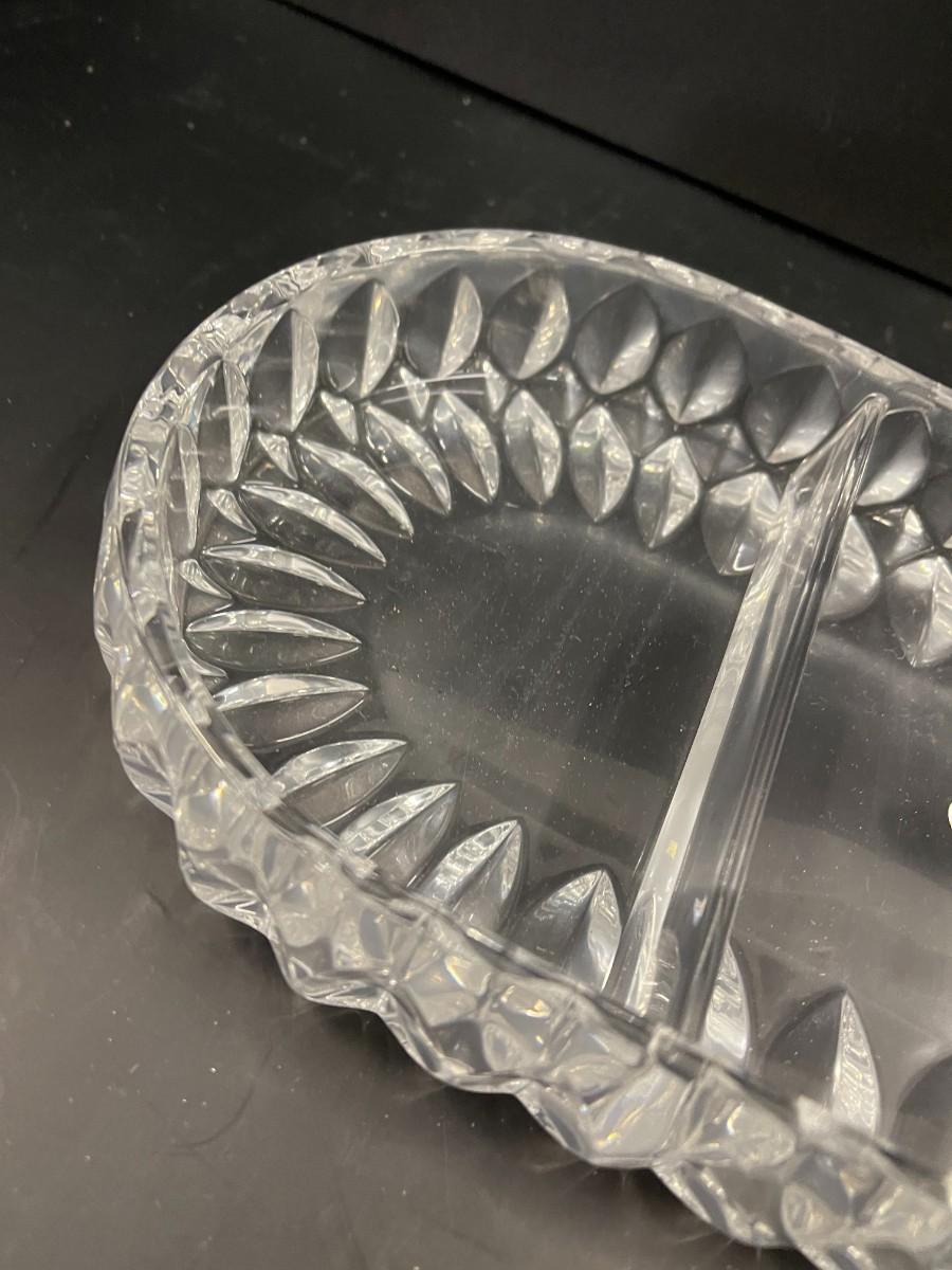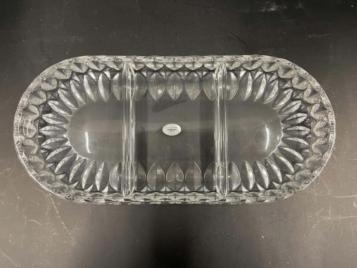 Gorham crystal 3 section relish dish, comes with original box but box is in rough shape. Dish is in like new condition. 7 1/2" # 1211