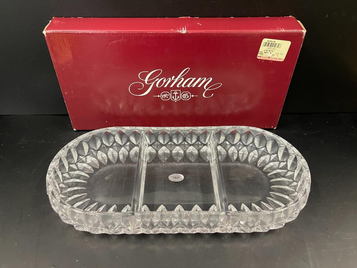 Gorham crystal 3 section relish dish, comes with original box but box is in rough shape. Dish is in like new condition. 7 1/2" # 1211
