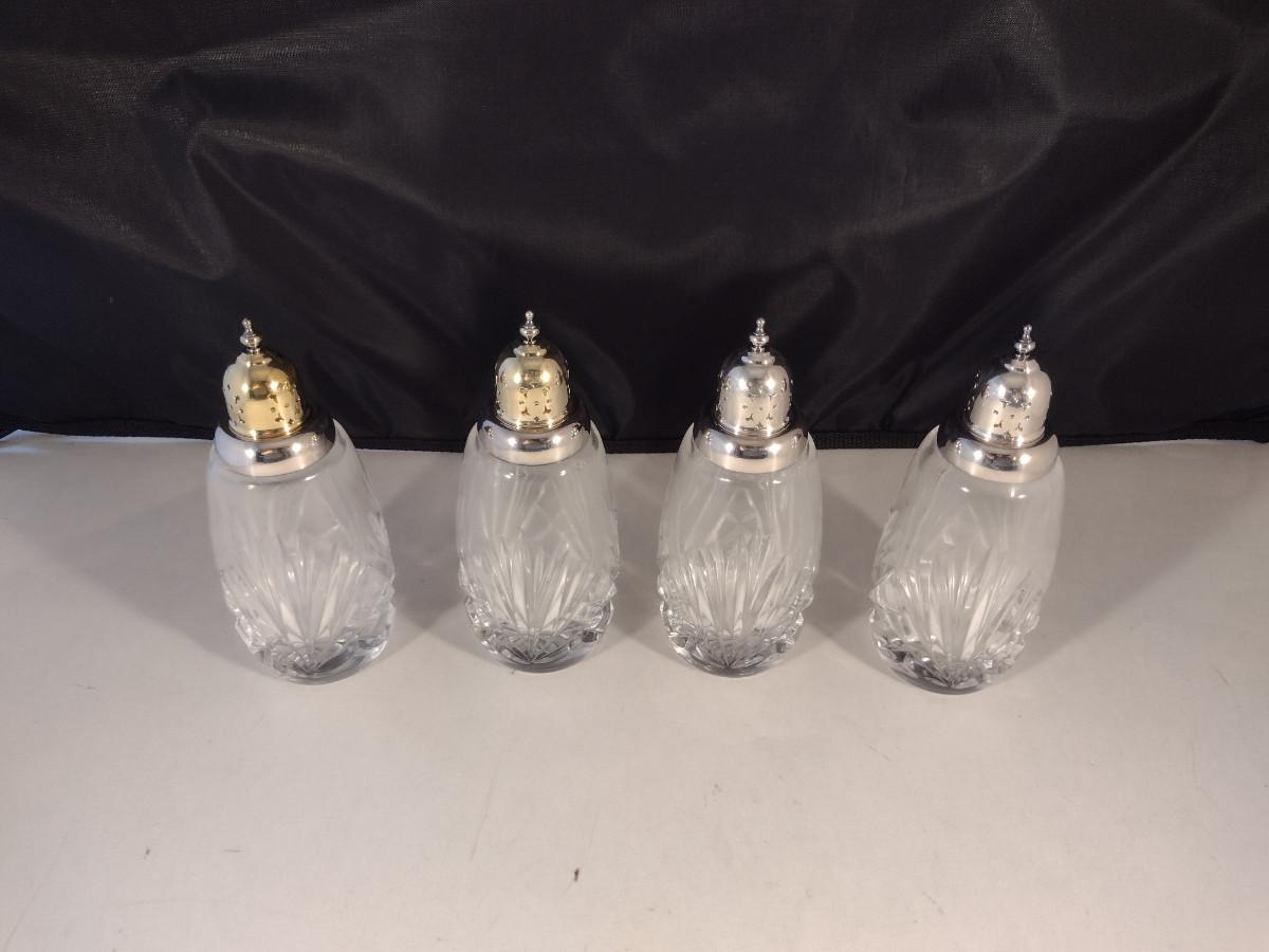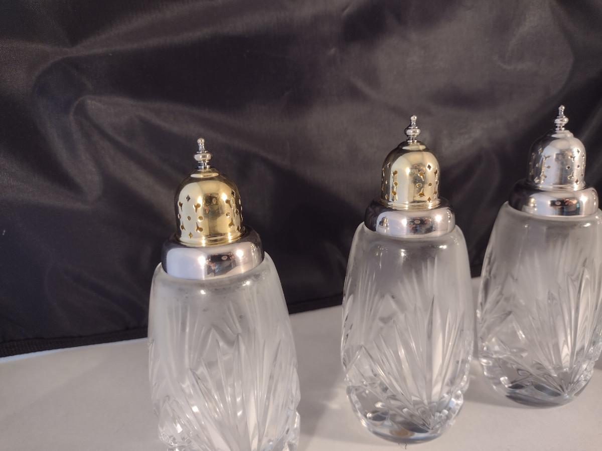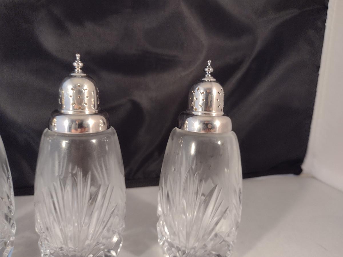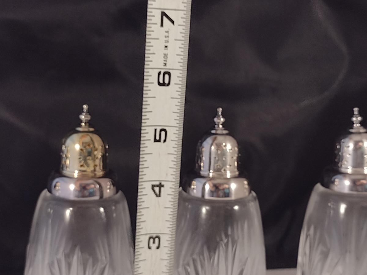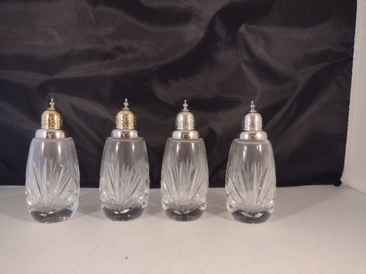 Gorham Crystal Salt and Pepper Shakers- Cherrywood Pattern- Three Pairs. Two pairs with metal lids.