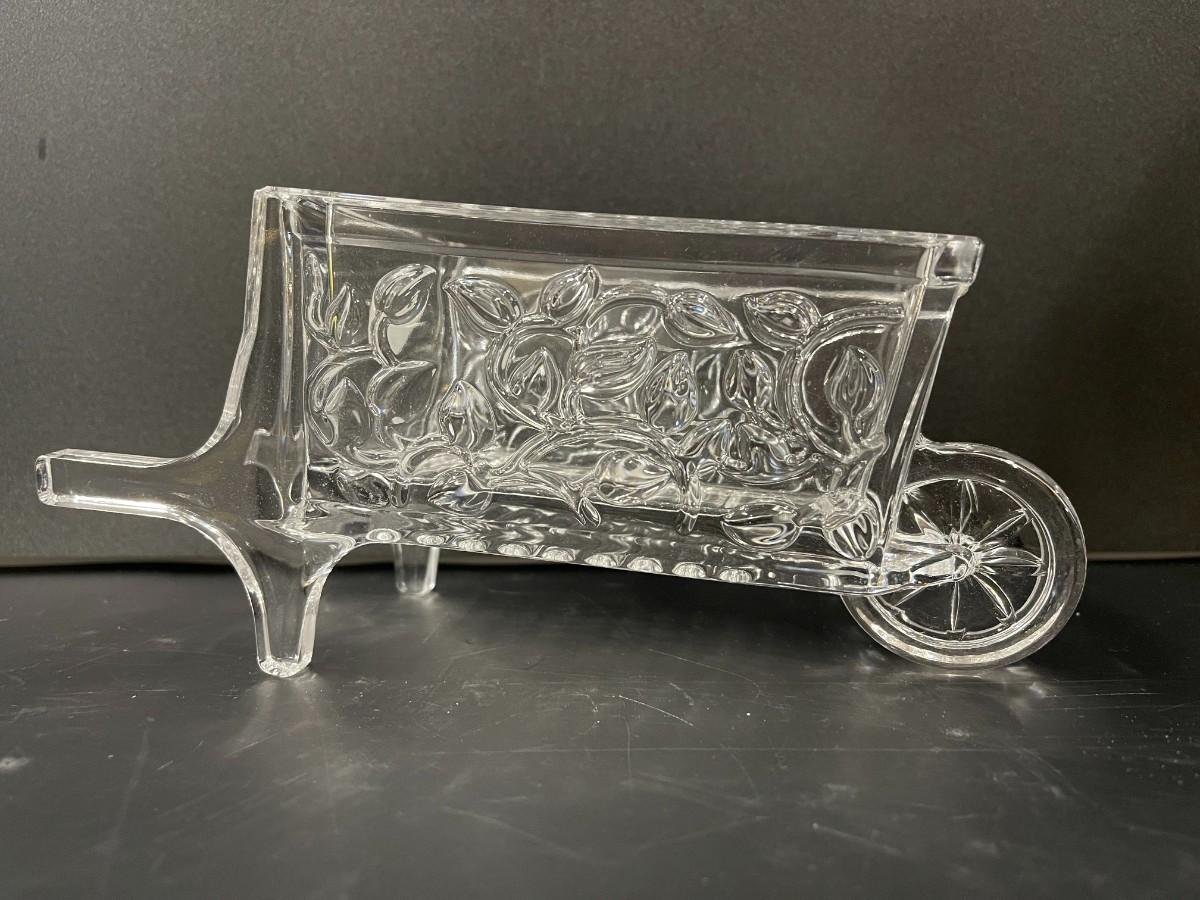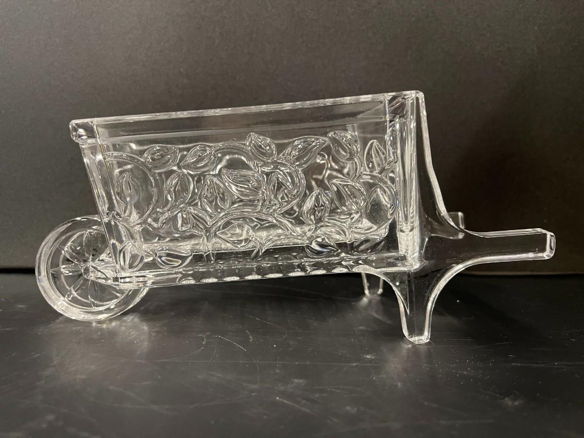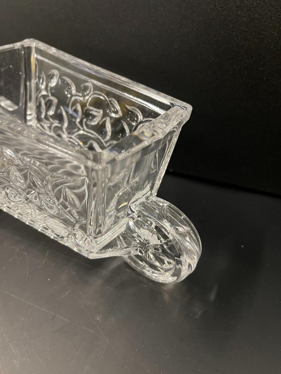 Gorham crystal wheelbarrow candy dish, in like new condition. No chips, cracks or scratches. 8" long x 4" tall. # 1209
