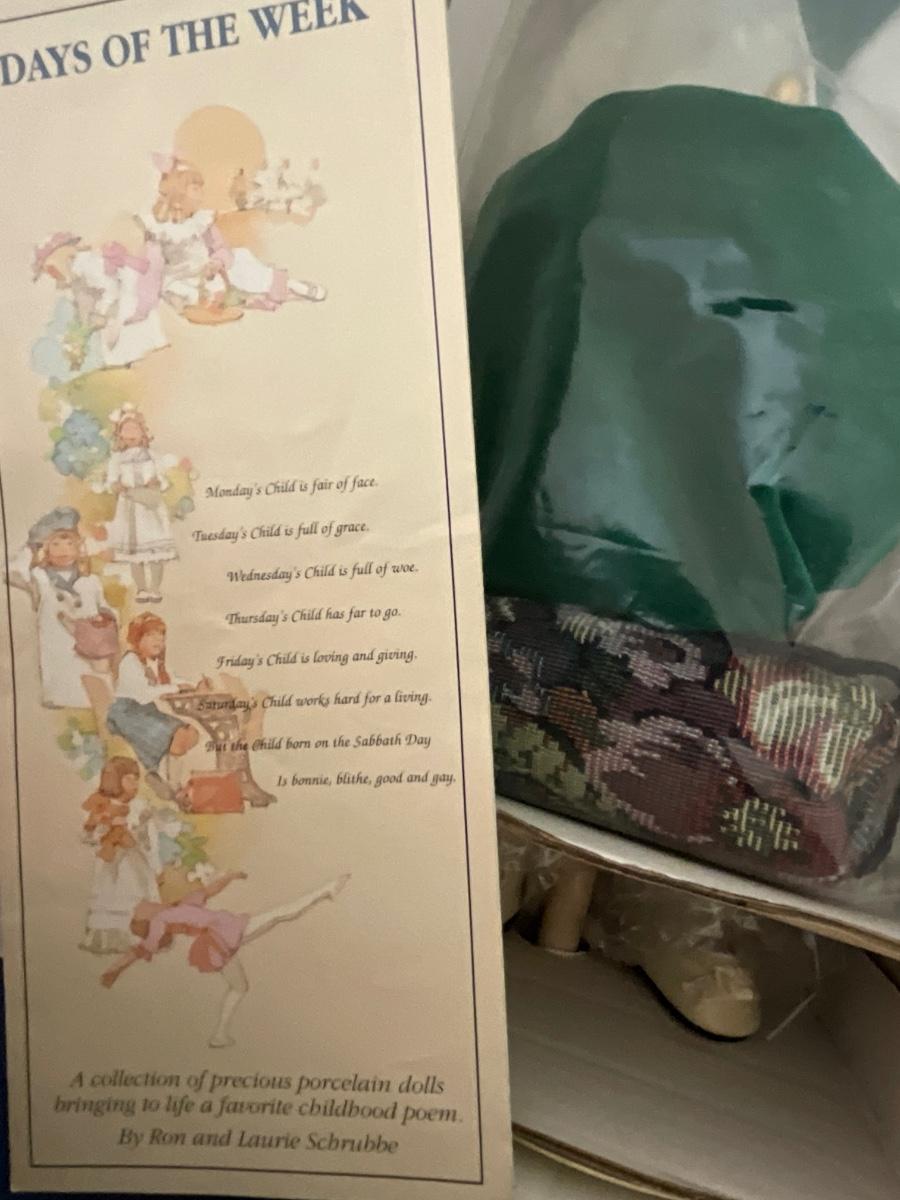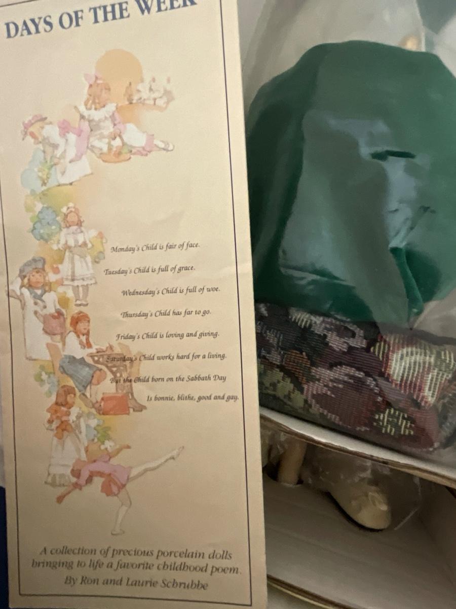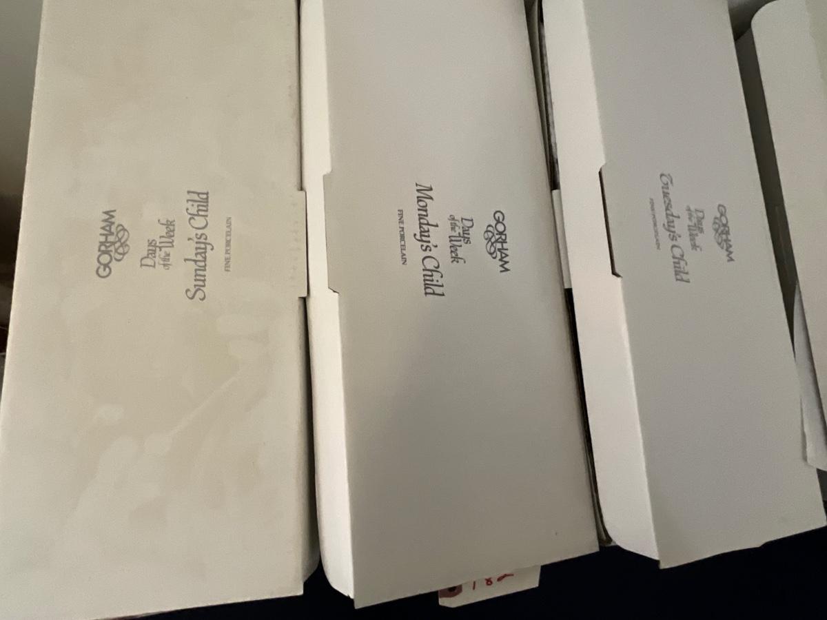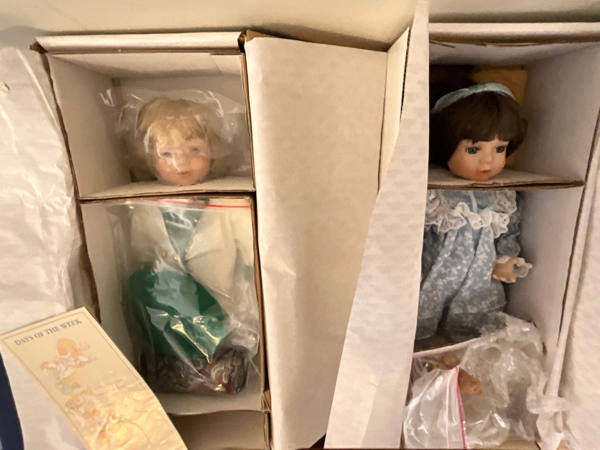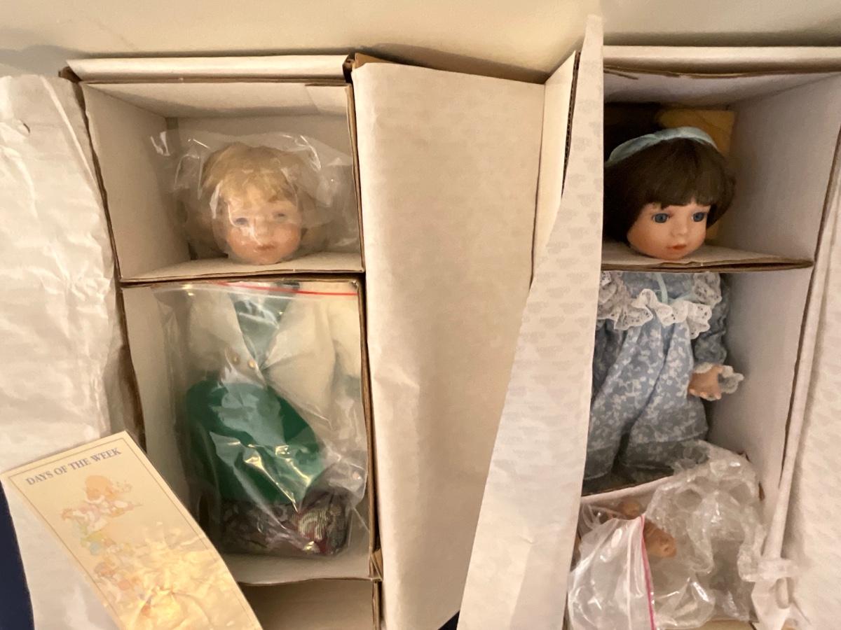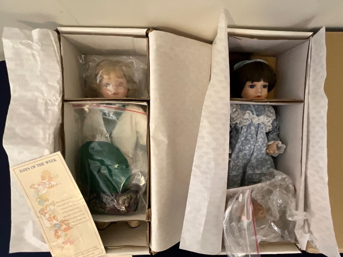 Gorham Days of the Week Doll Complete Set, 7 dolls represent each day of the week, signed porcelain Artists Laurie and Ron Schrudde, for Gorham as pictured