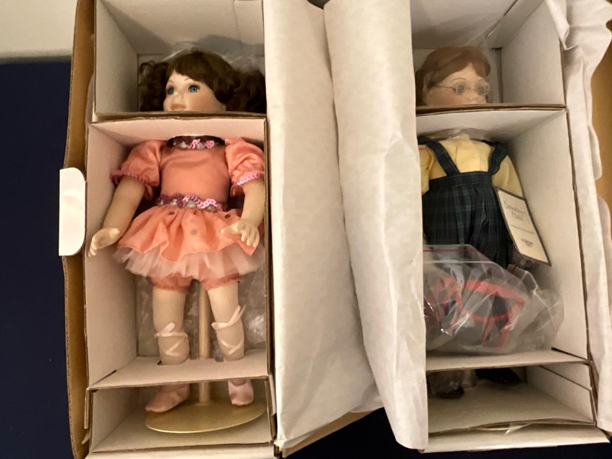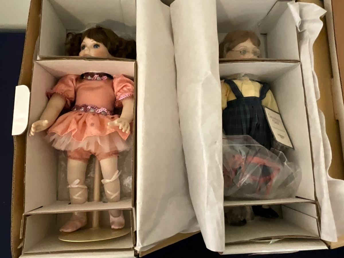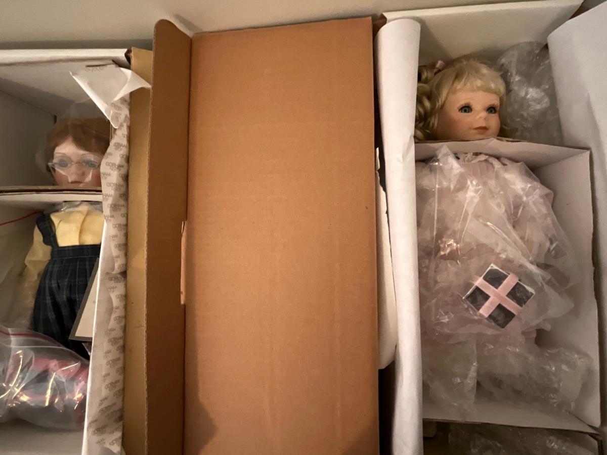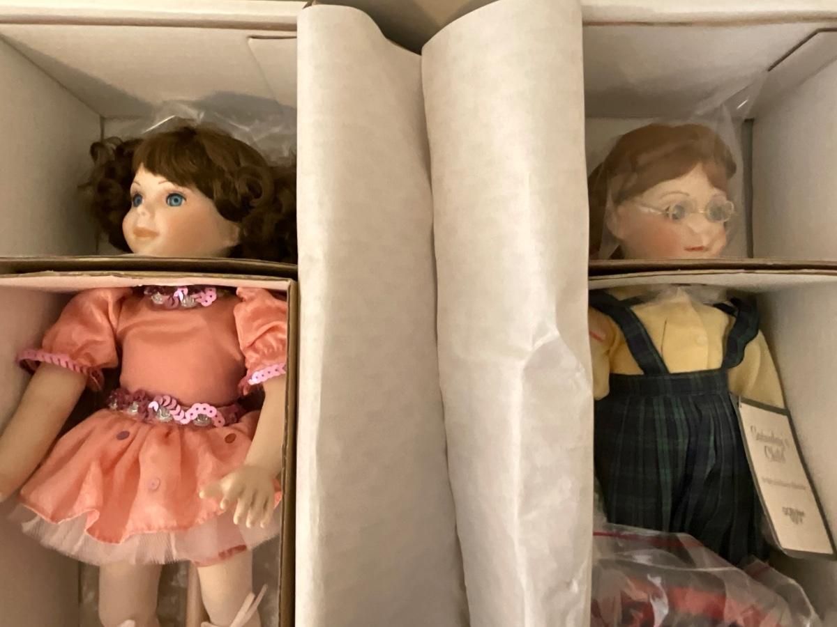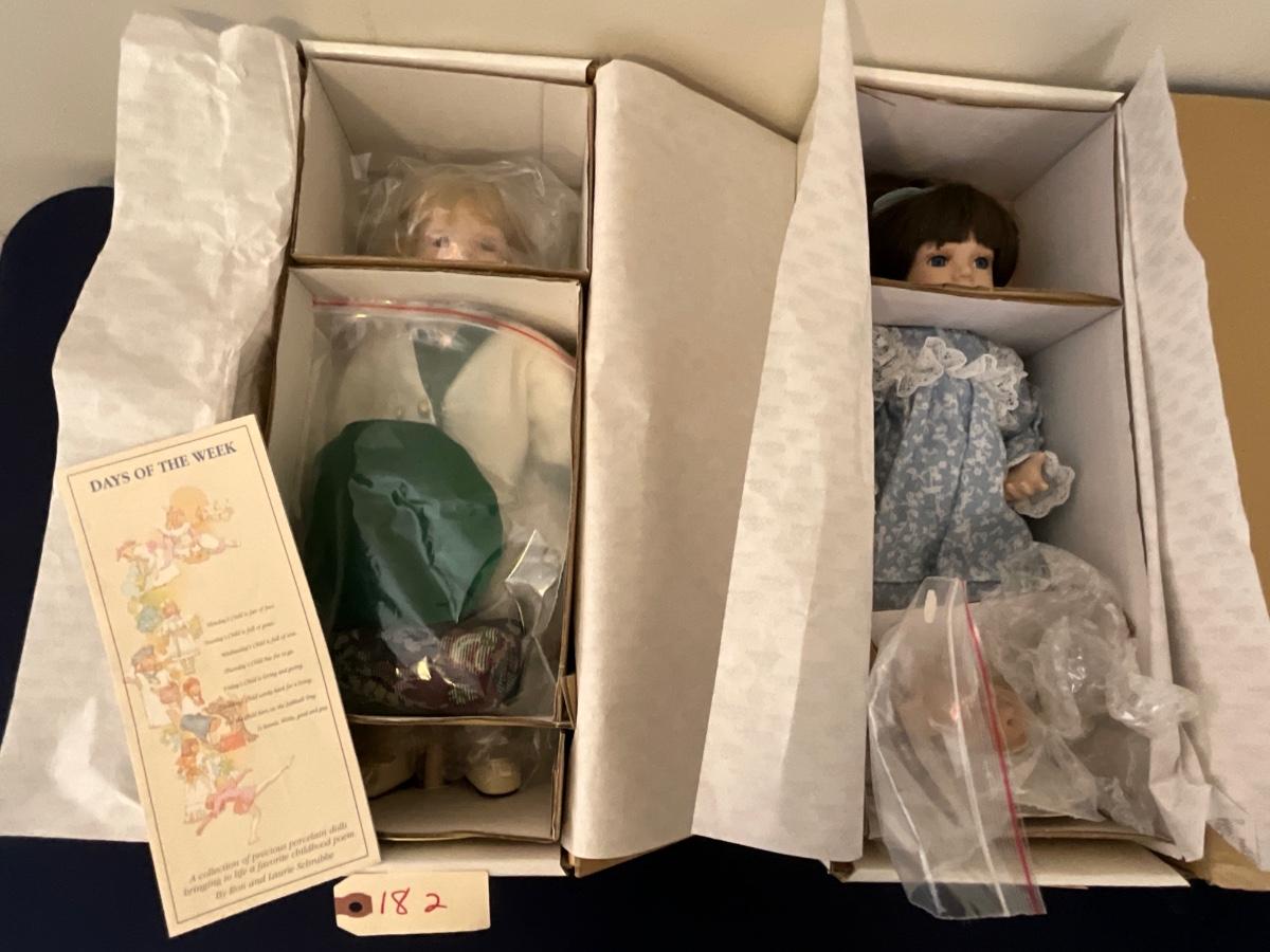 Gorham Days of the Week Doll Complete Set, 7 dolls represent each day of the week, signed porcelain Artists Laurie and Ron Schrudde, for Gorham as pictured