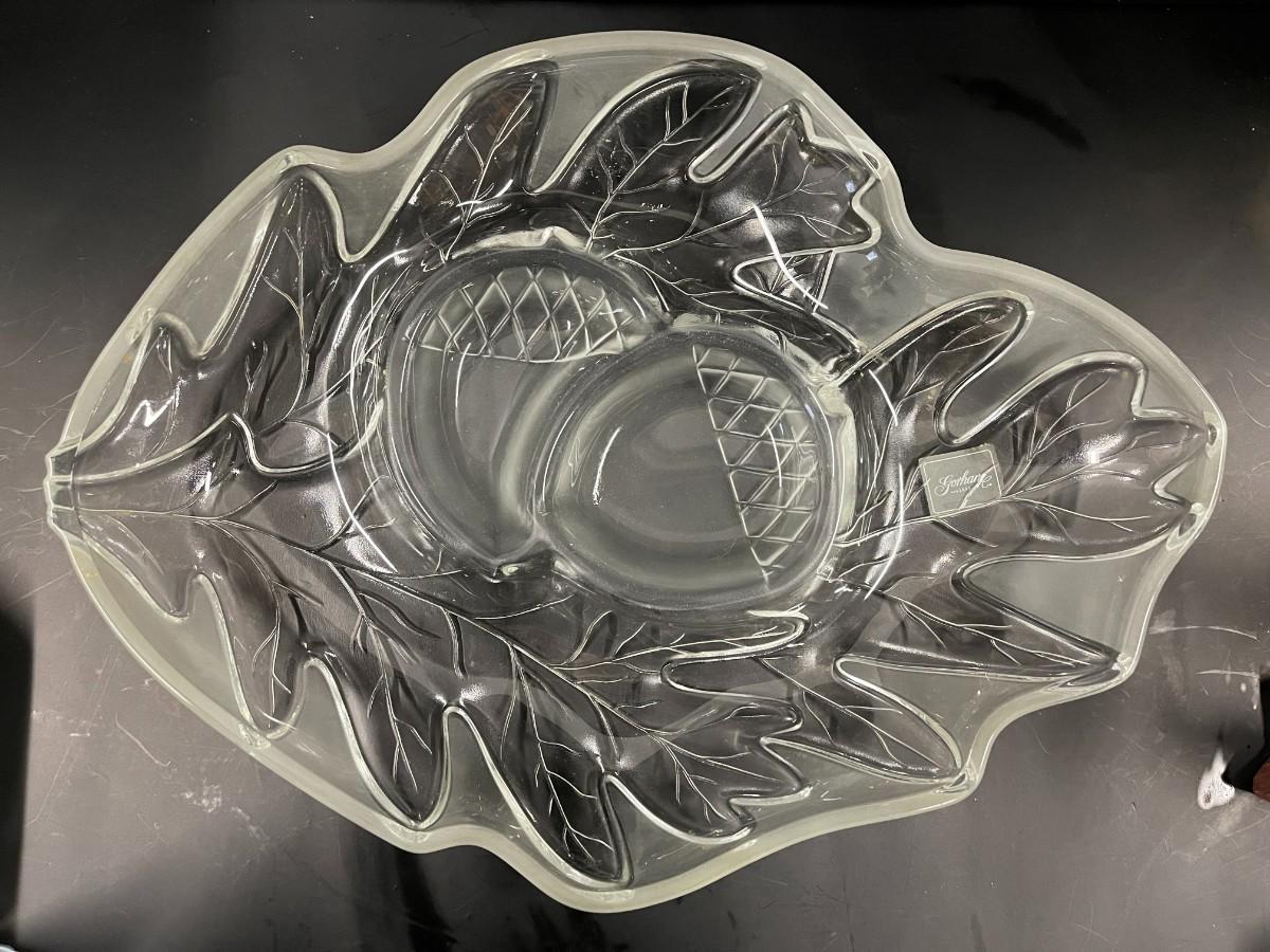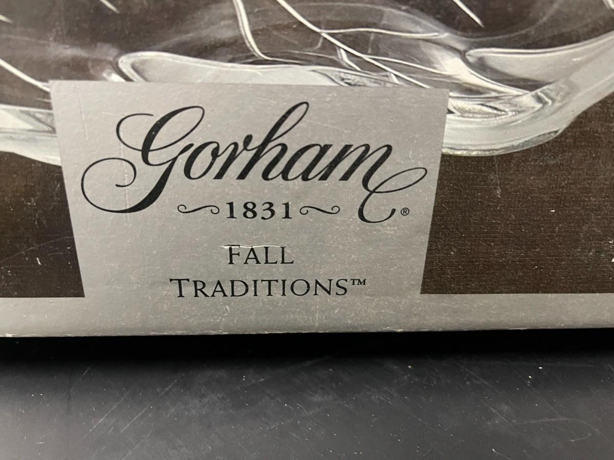 Gorham Fall Traditions Harvest Bounty Crystal Leaf Dish. Dish is in new condition and comes in original box. Box is in rough condition. Dish is 13" x 17". # 1212