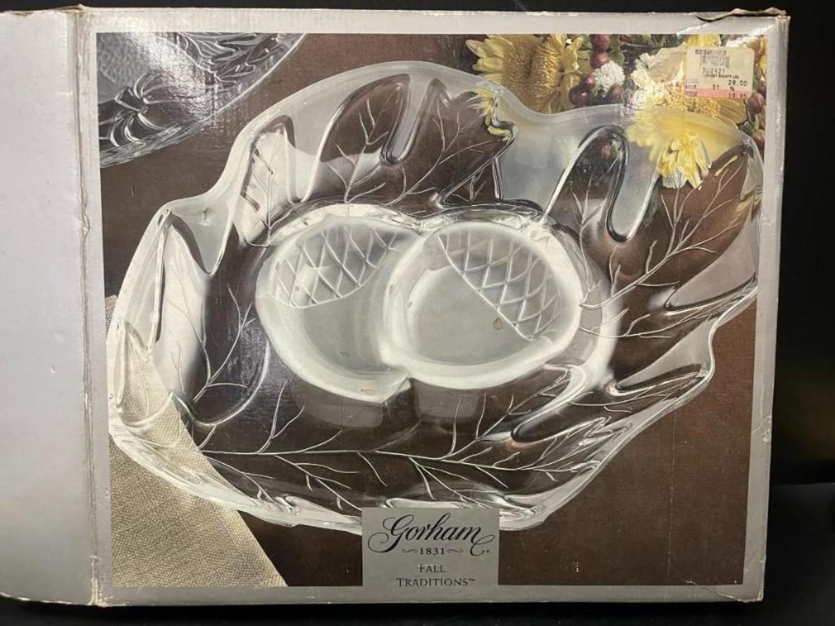 Gorham Fall Traditions Harvest Bounty Crystal Leaf Dish. Dish is in new condition and comes in original box. Box is in rough Condition: Used Size: 13" x 17"